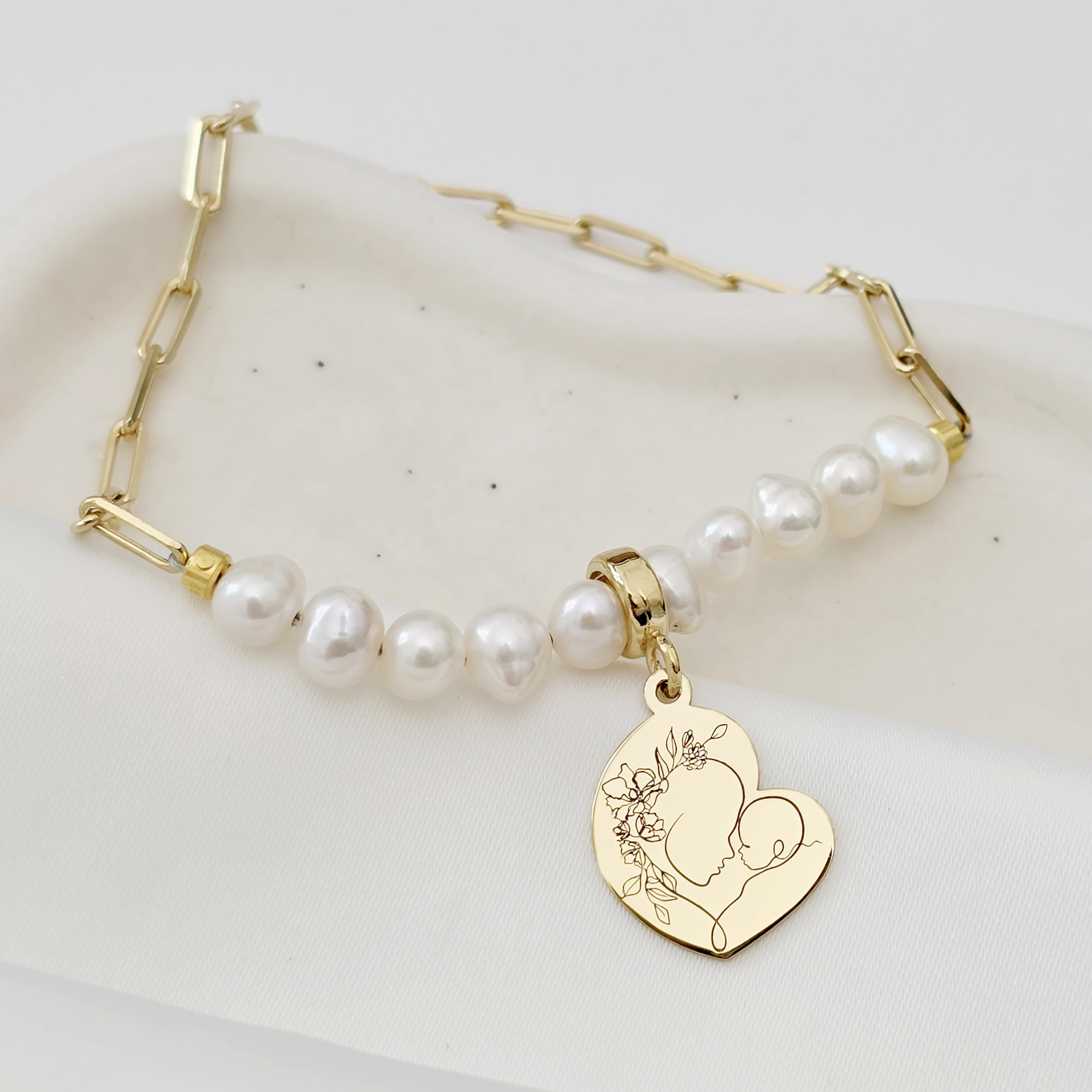 Bratara „Perlele Iubirii Materne” este creata din Argint 925 placat cu Aur galben 18K, fiind alcatuita dintr-un sir de 10 perle naturale care se continua cu lantisor cu zale dreptunghiulare, iar in mijlocul siragului de perle este prins un pandantiv in forma de inima. Inima este gravata cu o silueta delicata mama-copil, simbolizand legatura profunda si iubirea infinita dintre mama si copil.