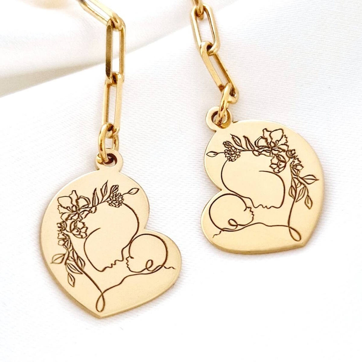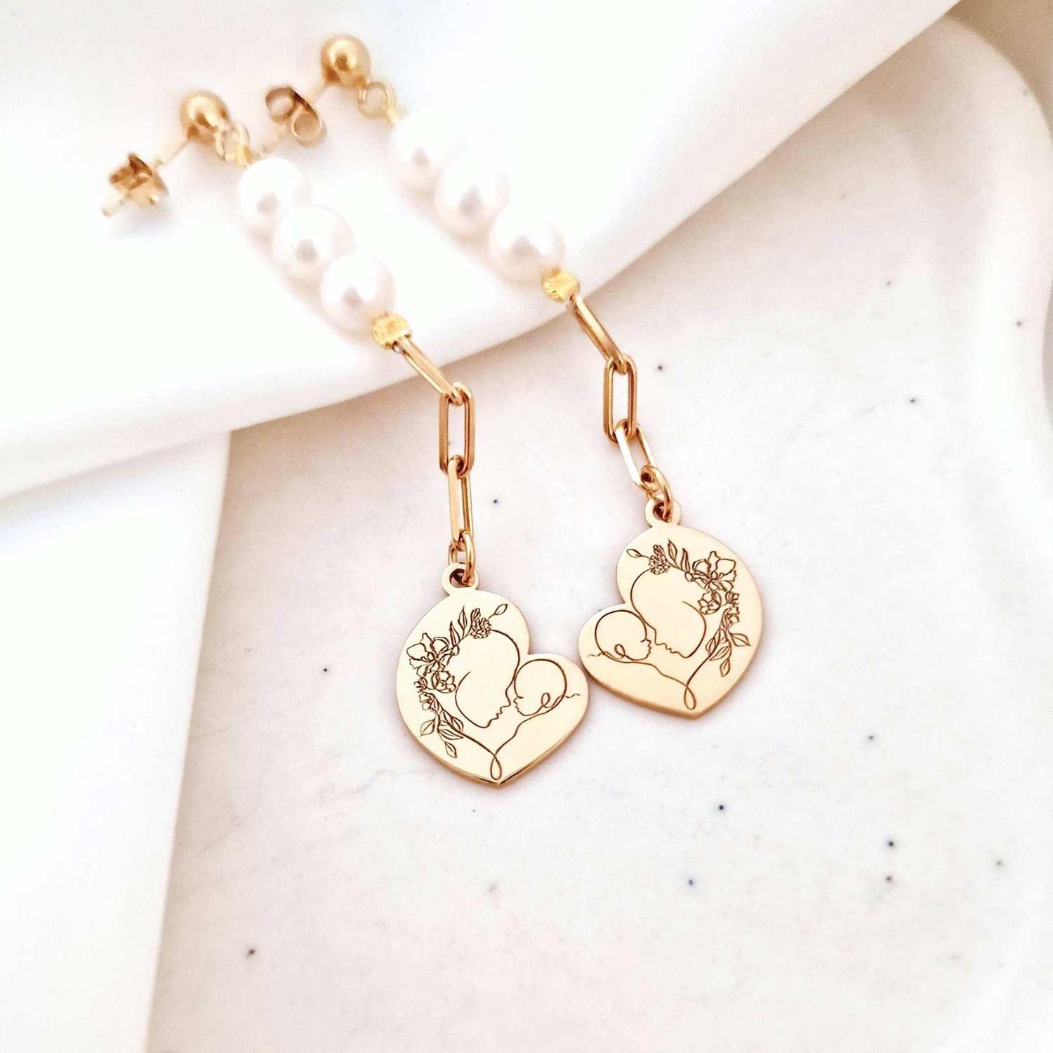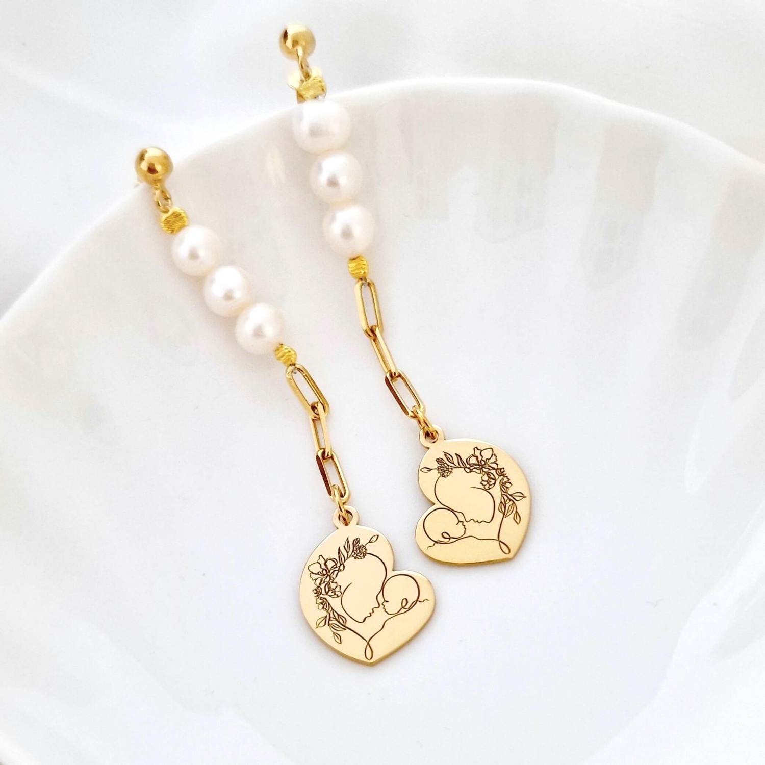 Cerceii „Perlele Iubirii Materne” sunt realizati din Argint 925 placat cu Aur galben 18K, fiecare cercel fiind alcatuit din perle naturale si prins la capatul unui lantisor cu zale dreptunghiulare, pandantive in forma de inima. Inima este gravata cu o silueta delicata mama-copil, simbolizand legatura profunda si iubirea infinita dintre mama si copil.
