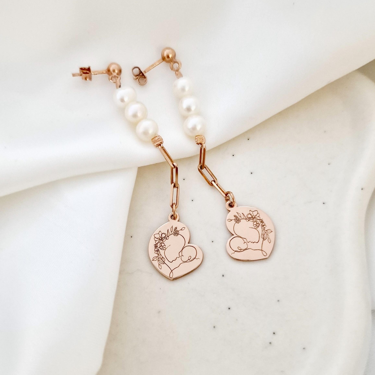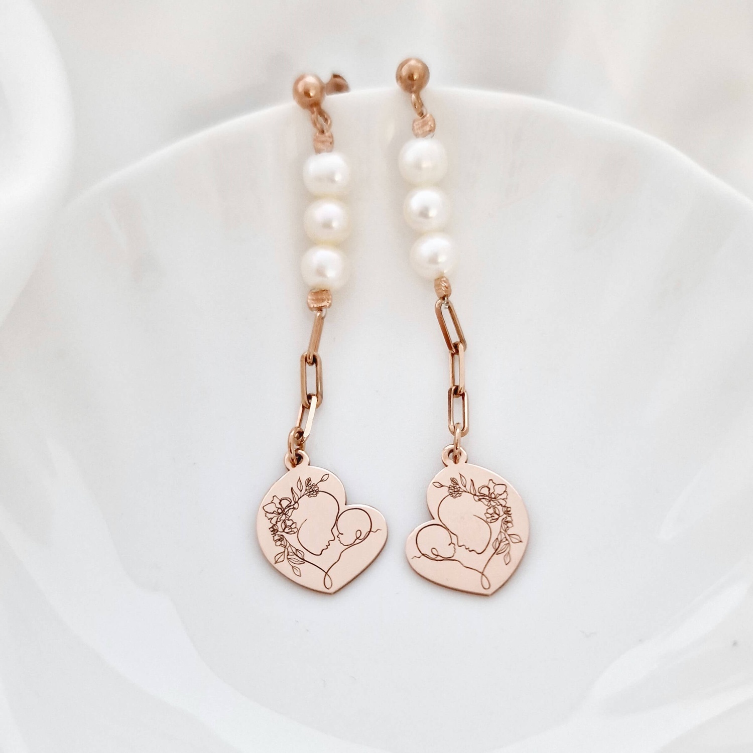 Cerceii „Perlele Iubirii Materne” sunt realizati din Argint 925 placat cu Aur roz 18K, fiecare cercel fiind alcatuit din perle naturale si prins la capatul unui lantisor cu zale dreptunghiulare, pandantive in forma de inima. Inima este gravata cu o silueta delicata mama-copil, simbolizand legatura profunda si iubirea infinita dintre mama si copil.