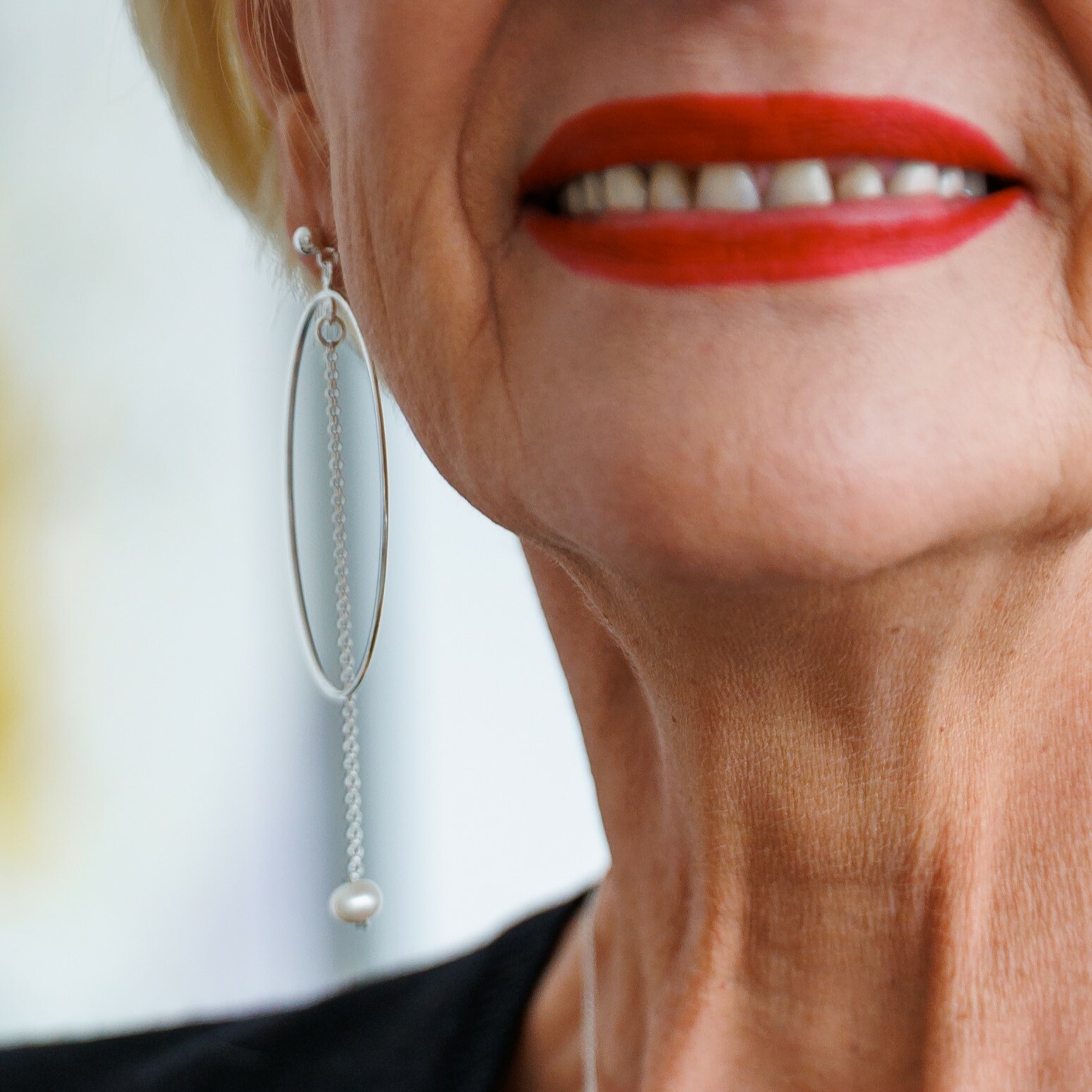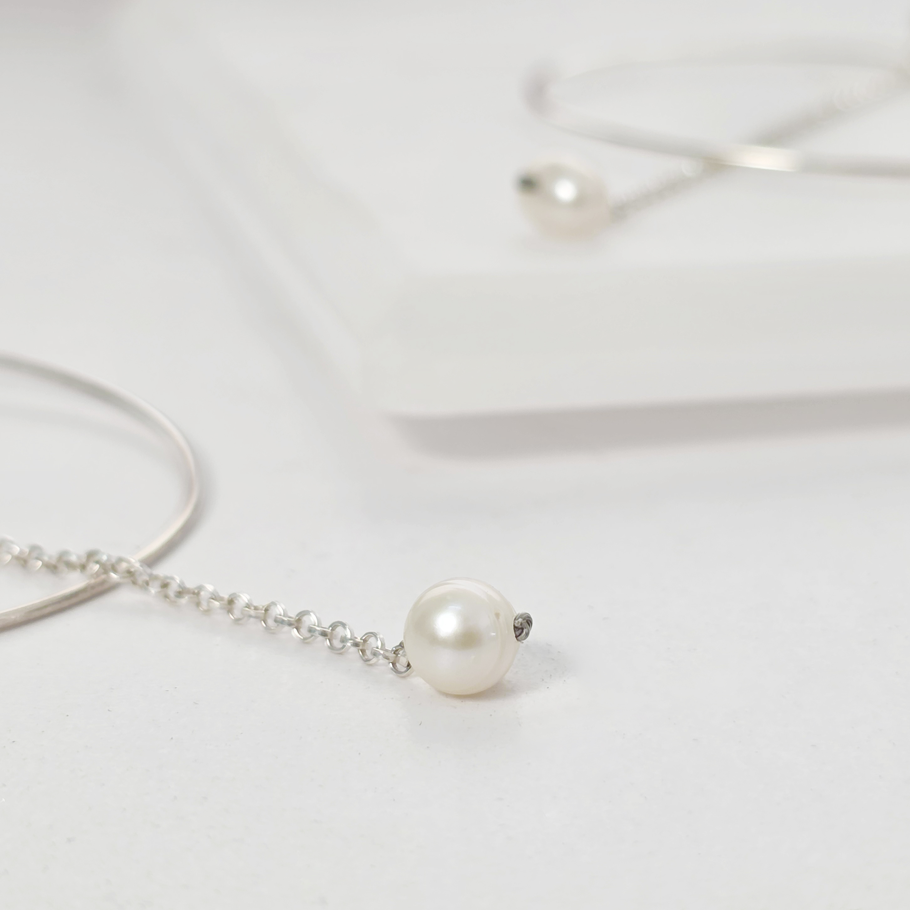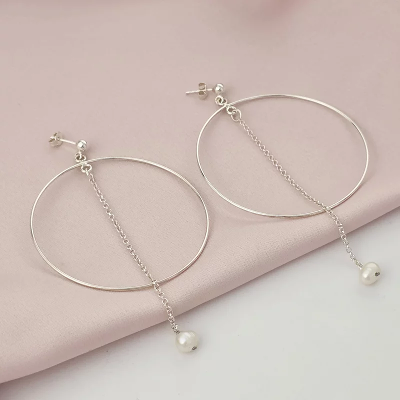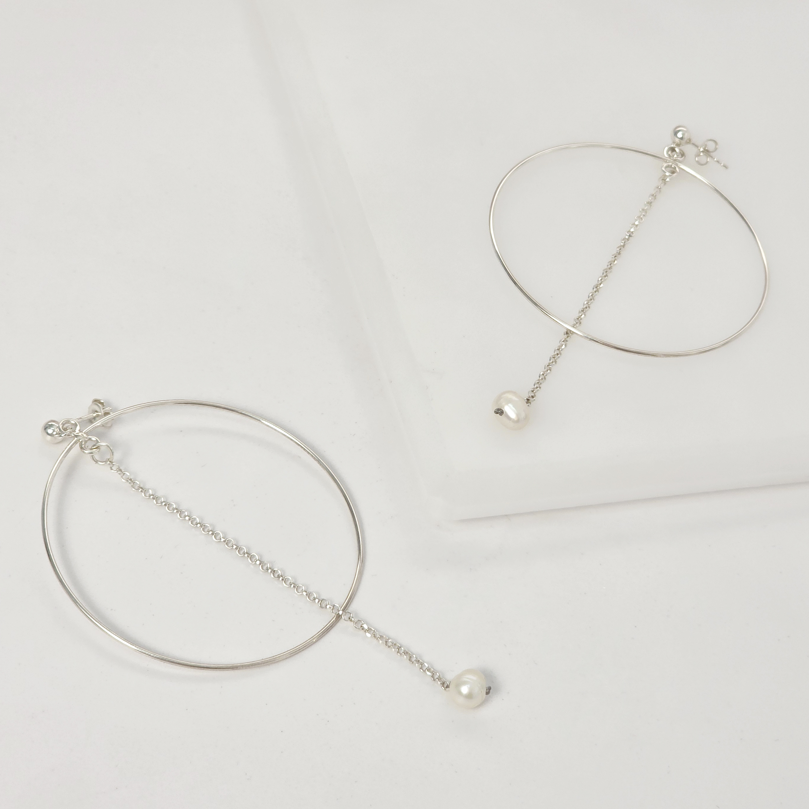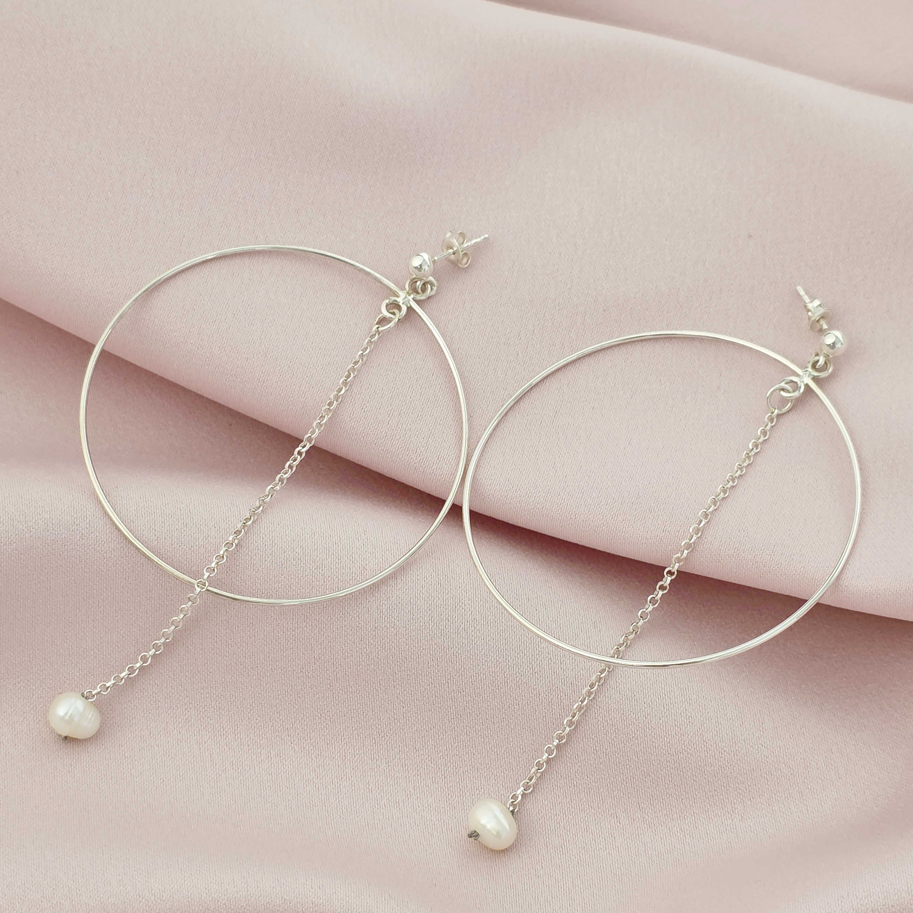 Cercei rotunzi BIG HOOPS cu lant si picatura de Perla - Argint 925 - Inchizatoare surub
