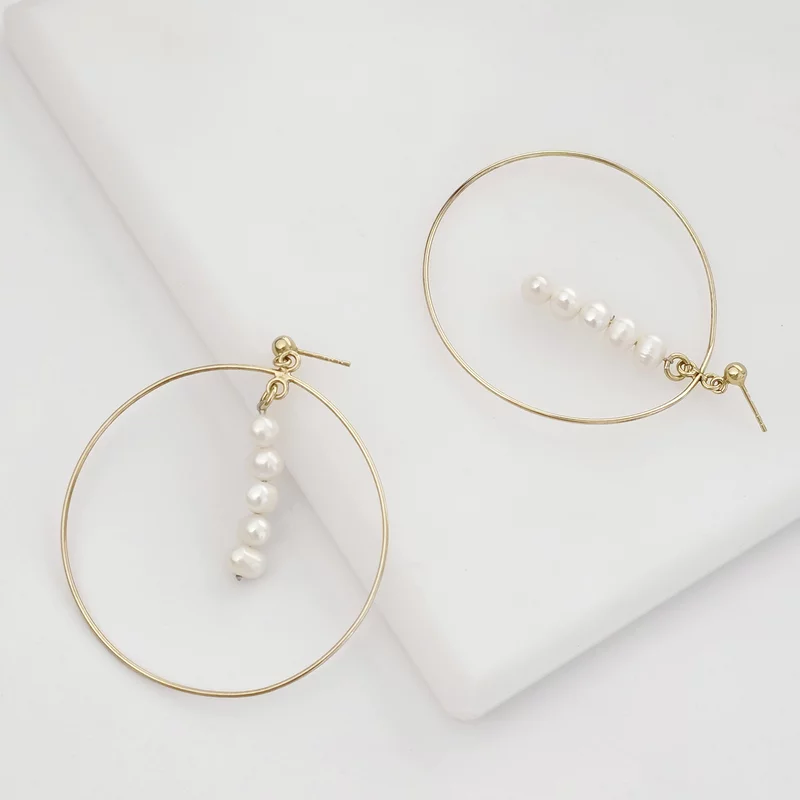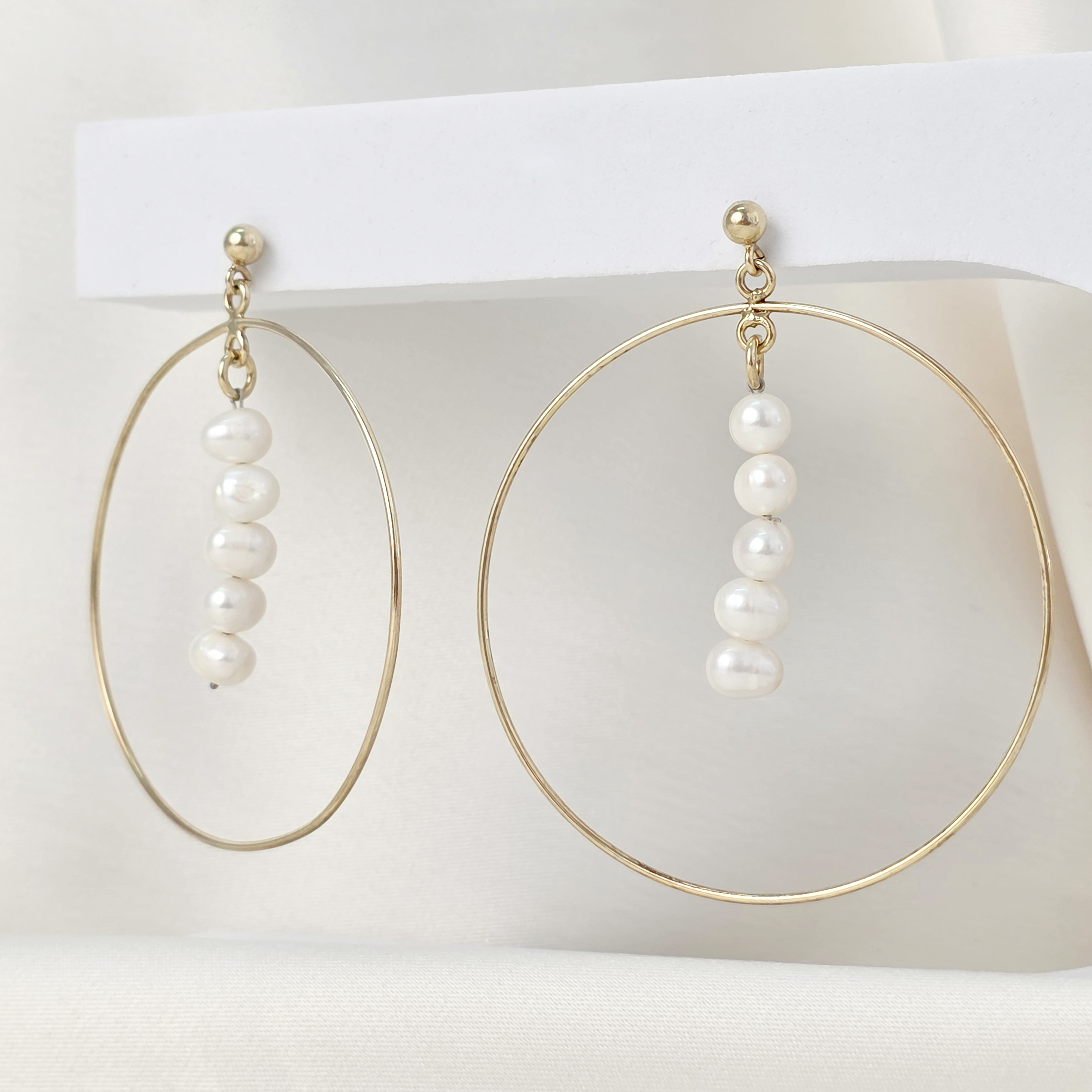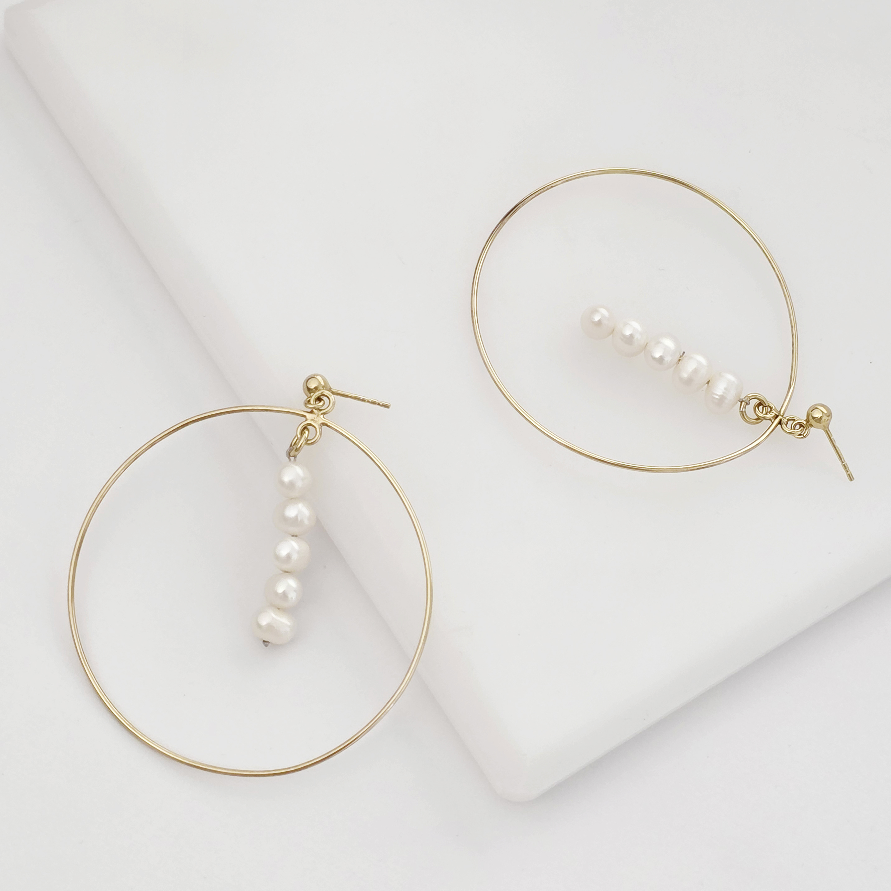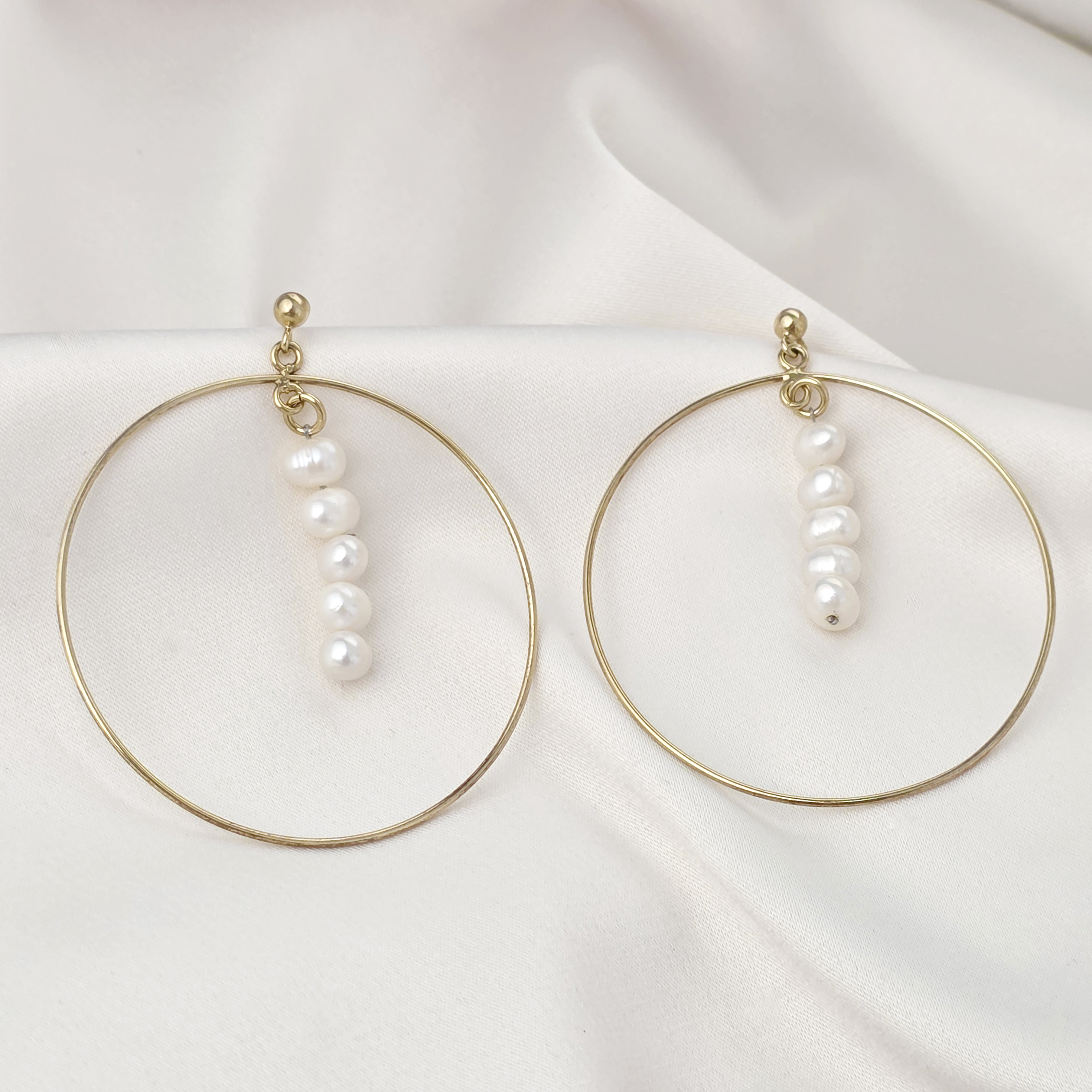 Cercei rotunzi BIG HOOPS cu sirag de Perle - Argint 925 placat cu Aur Galben 18K - Inchizatoare surub