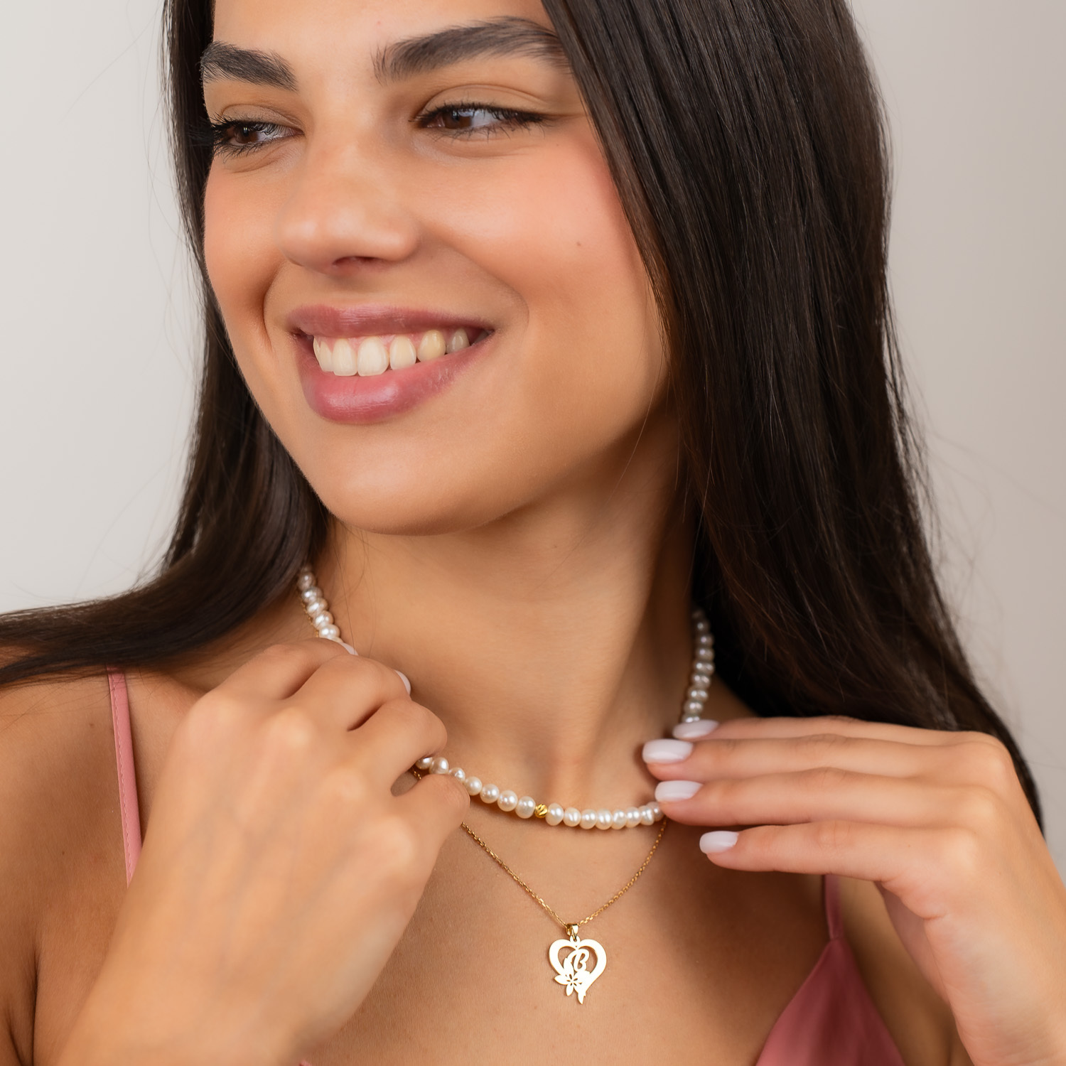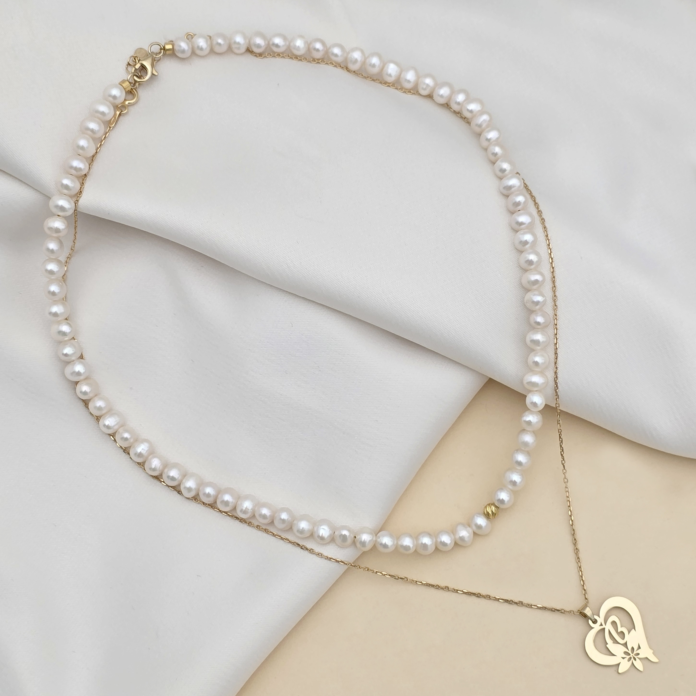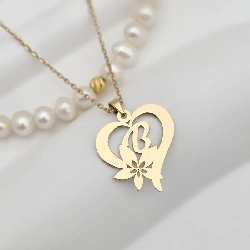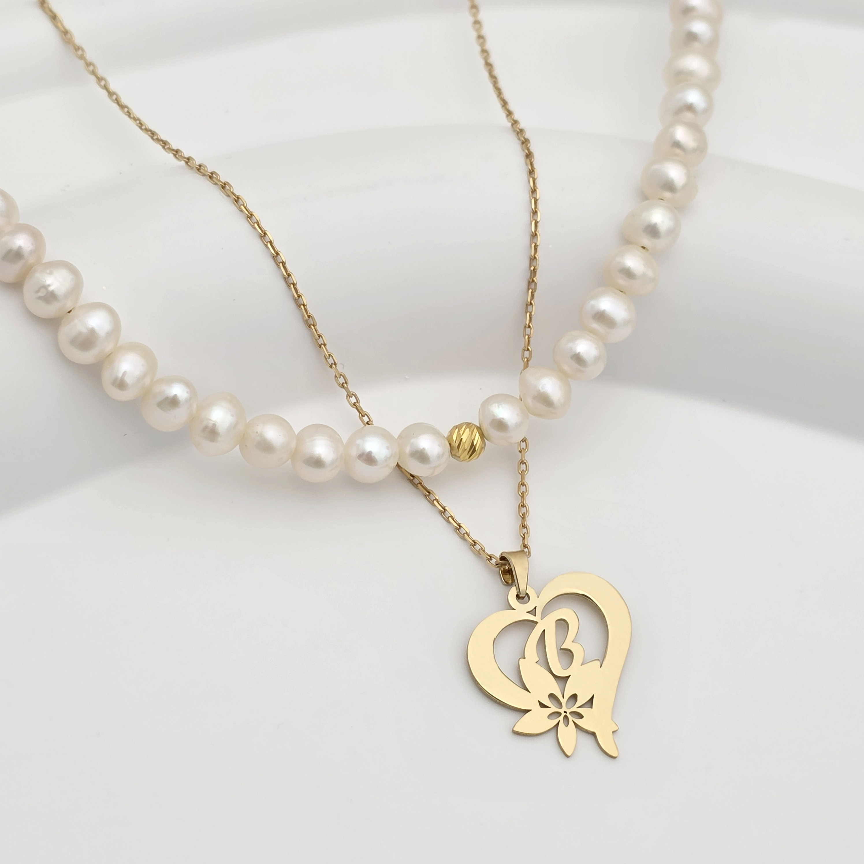 Colier Floarea Dragostei - Pandantiv inima cu initiala - Lantisor & Sirag de Perle - Argint 925 placat cu Aur Galben 18K