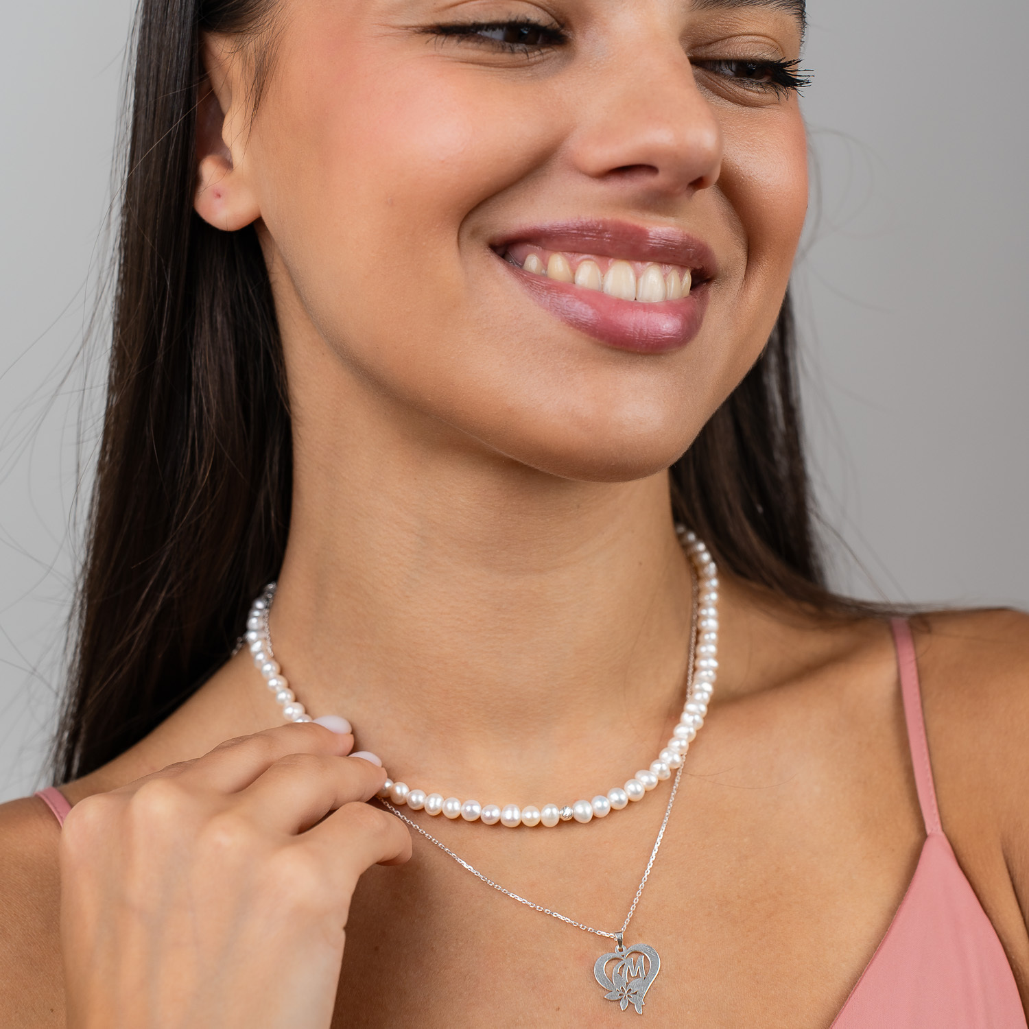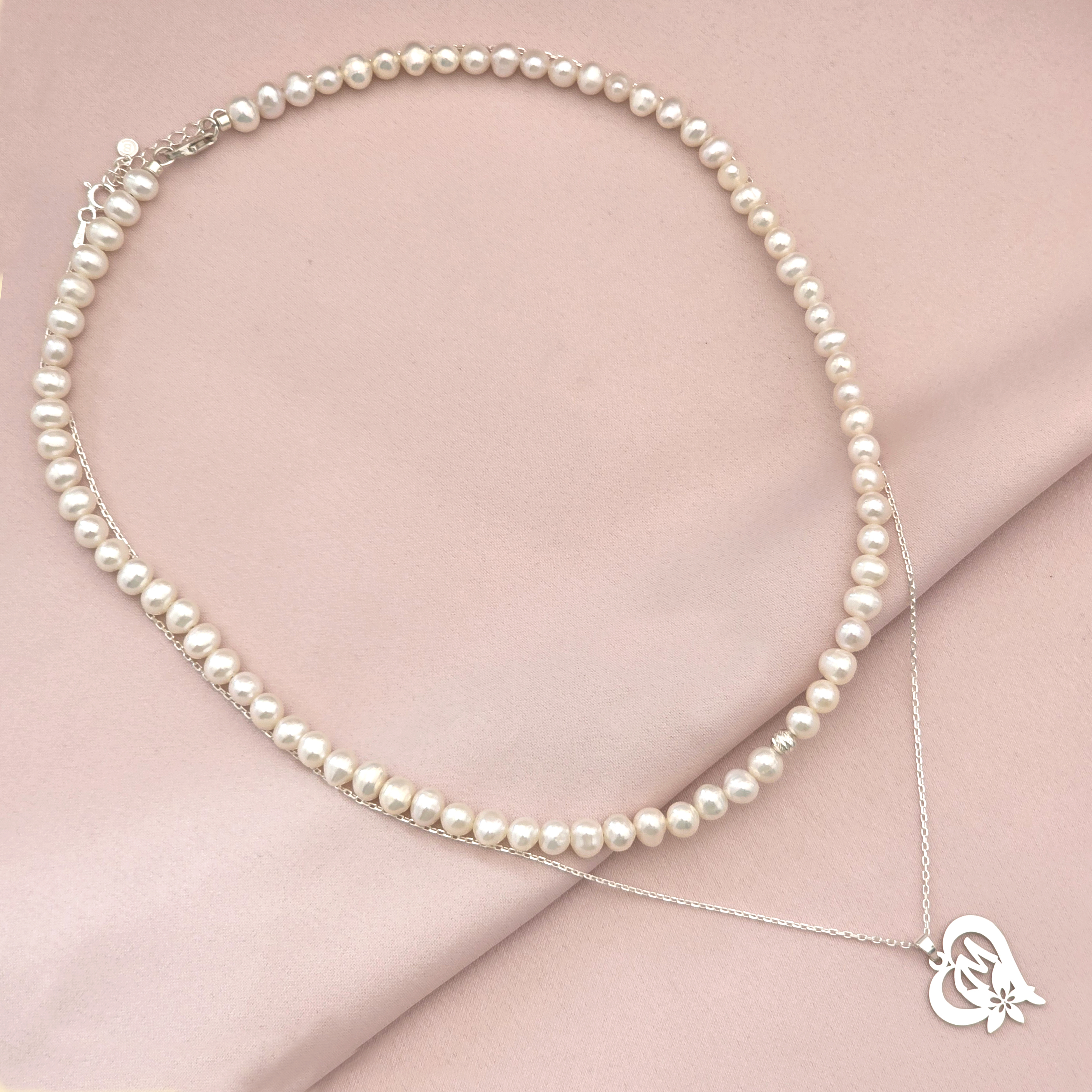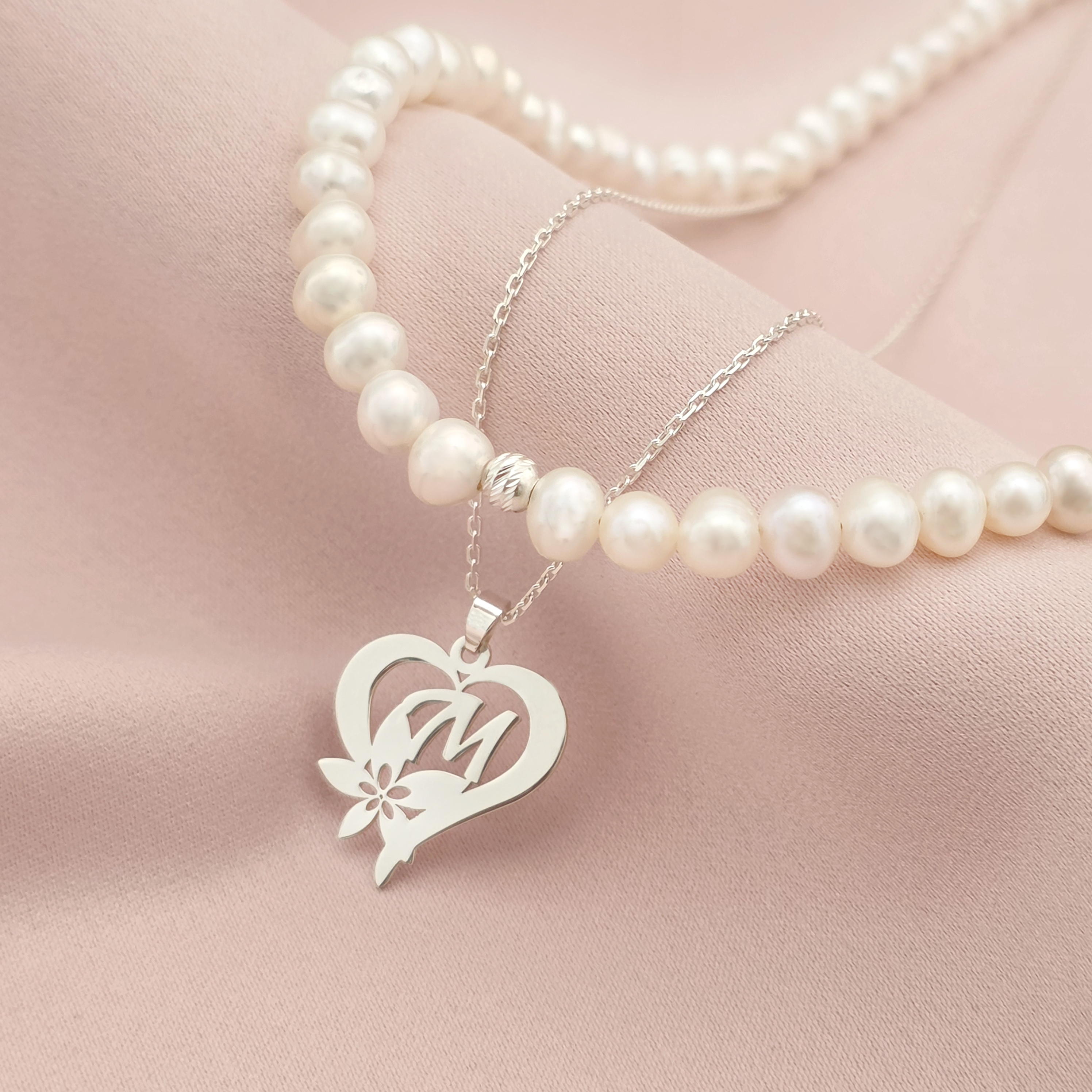 Colier Floarea Dragostei - Pandantiv inima cu initiala - Lantisor & Sirag de Perle - Argint 925