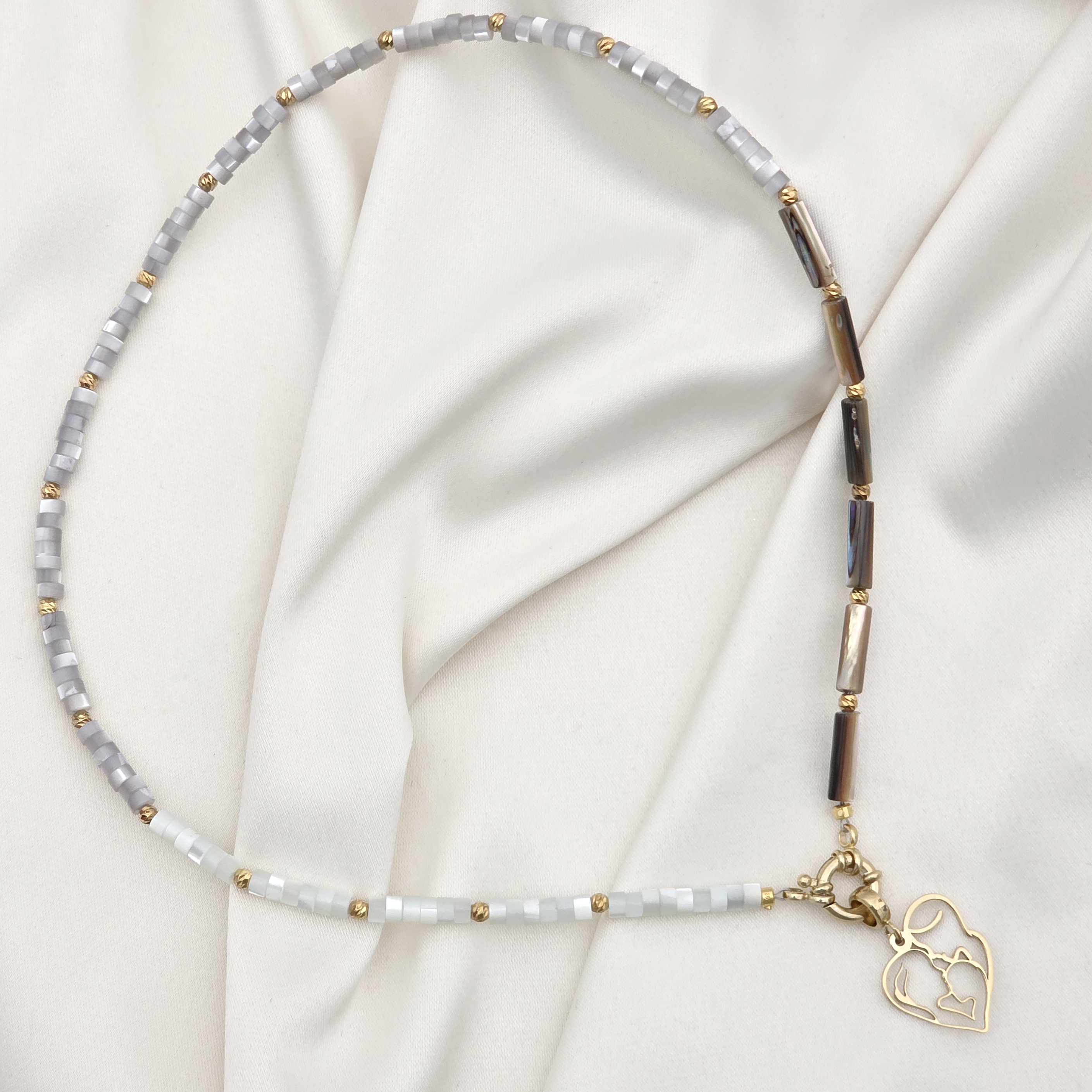 Colier Noua Familie - Inima cu Mama, Tata si Baiat & Sirag de Pietre sidef colorate & abalone - Argint 925 placat cu Aur Galben 18K