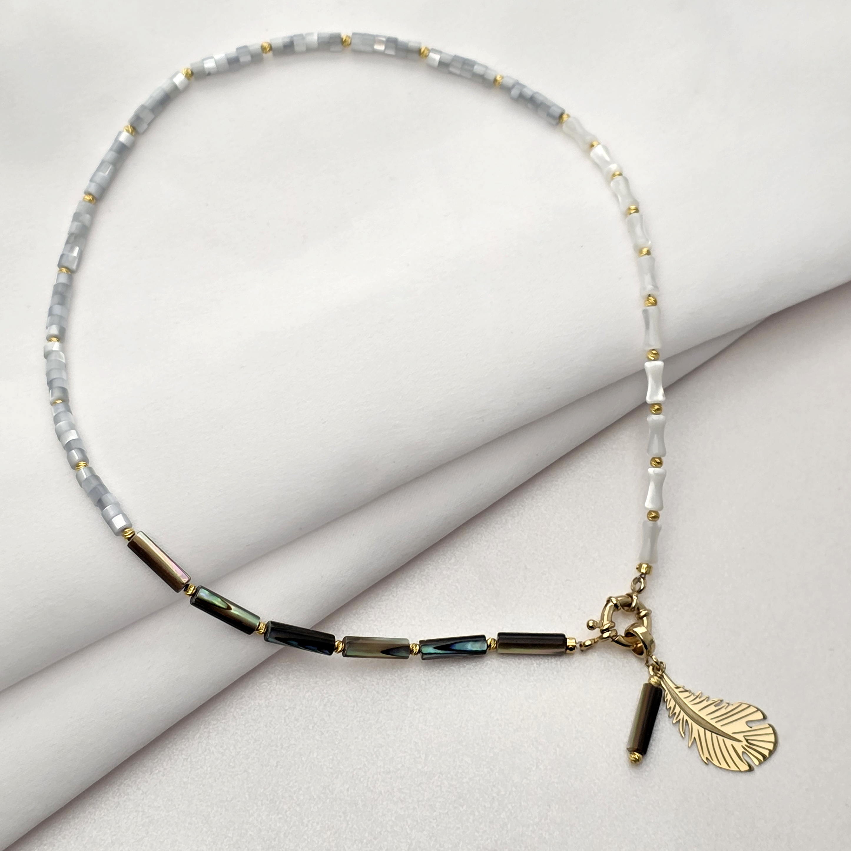 Colier Pana Aurie - Pietre Tubulare Colorate, bambus & abalone - Argint 925 placat cu Aur 18K
