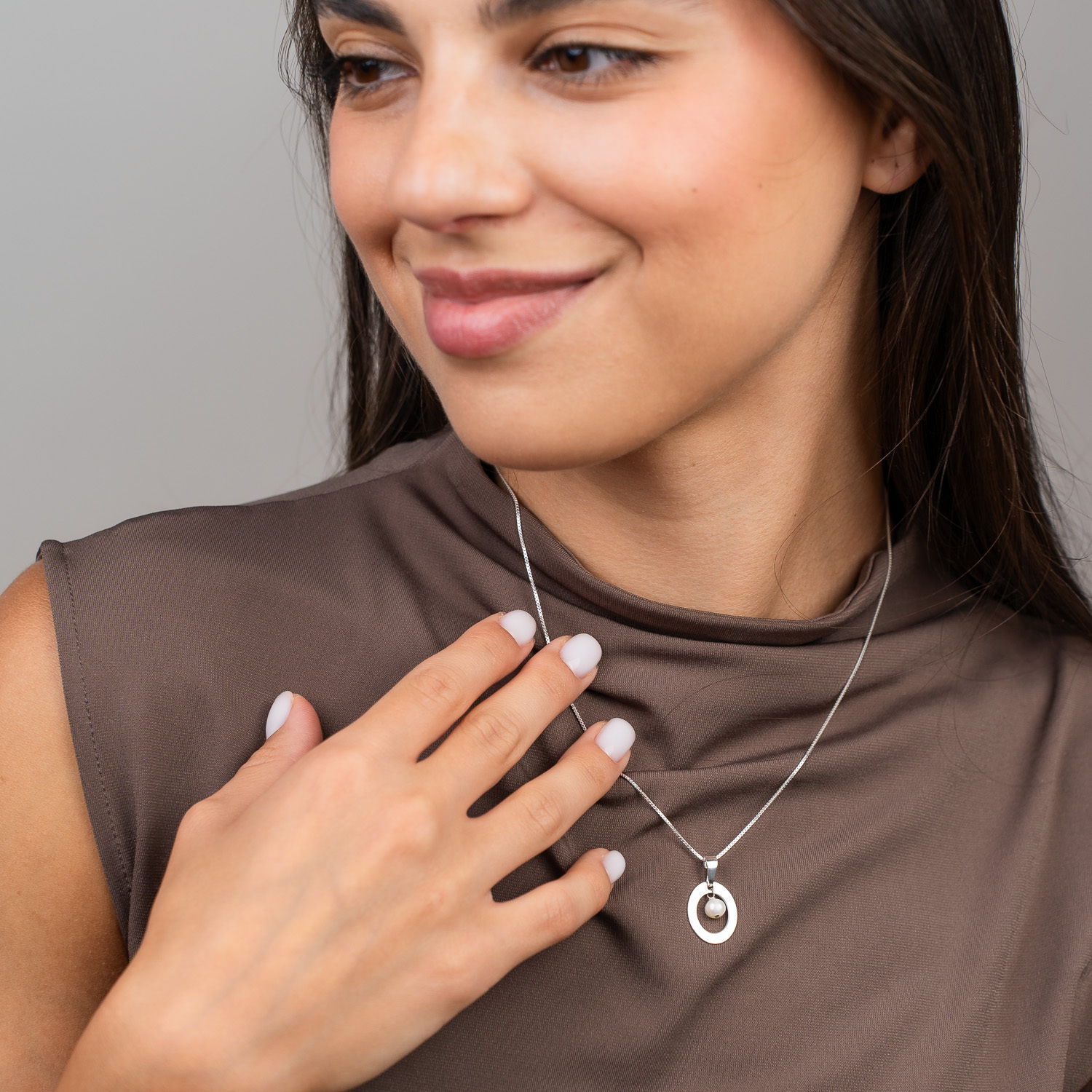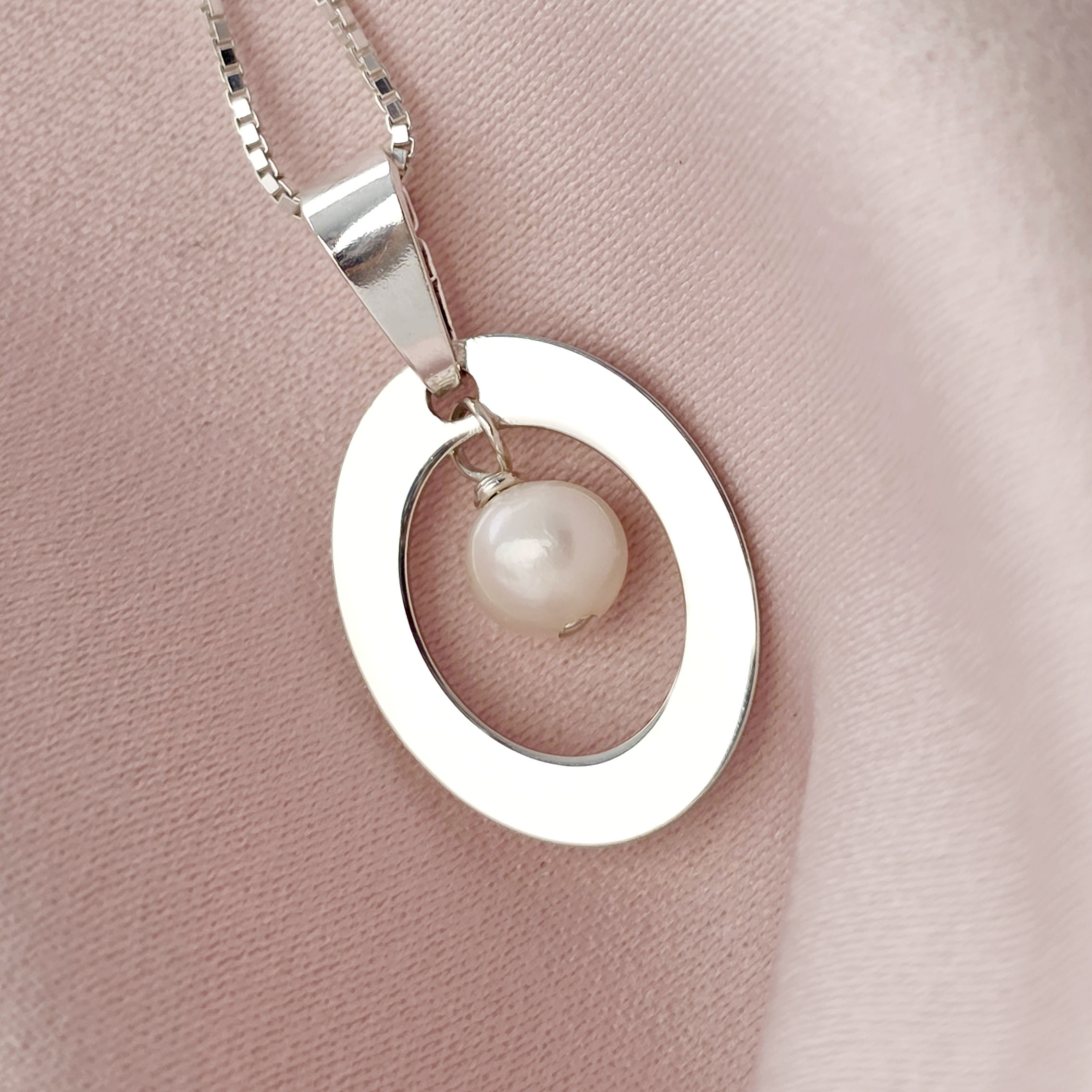Lantisor cu pandantiv oval - decupat la interior si charm picatura de Perla - Argint 925