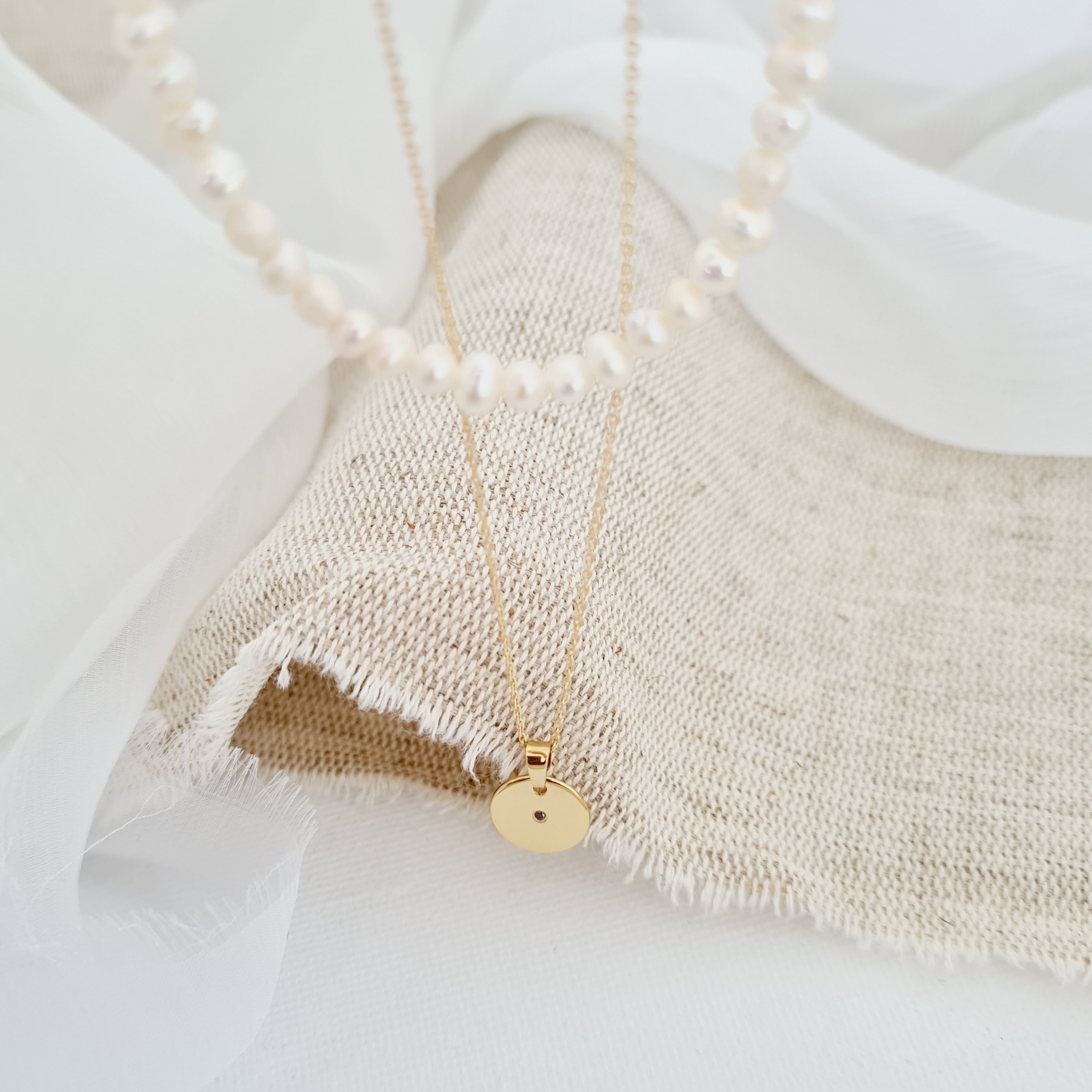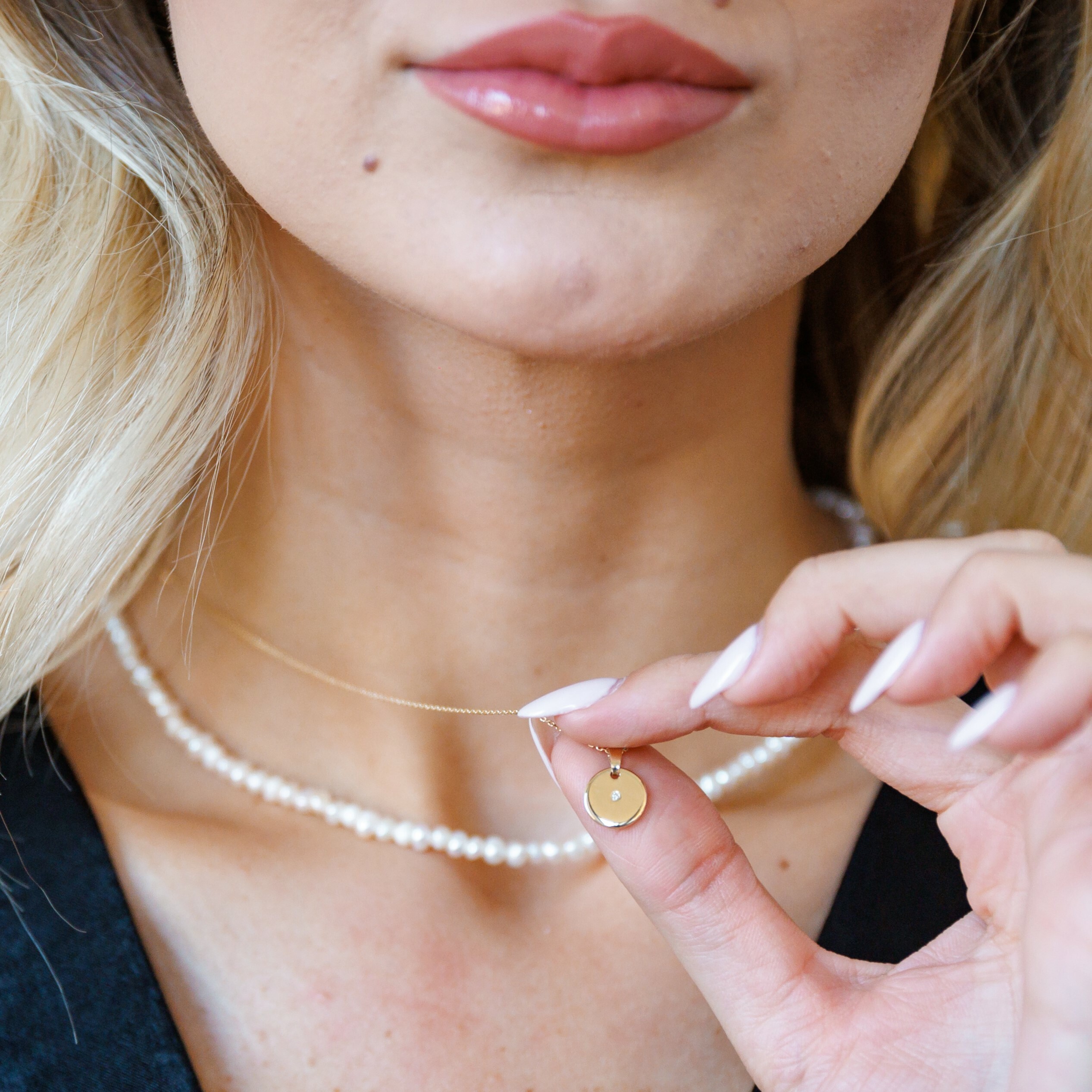 Lantisor cu Perle - Echilibru rafinat - Model 2 straturi cu sirag perle si lantisor cu pandantiv banut - Diamant natural - Aur Galben 14K