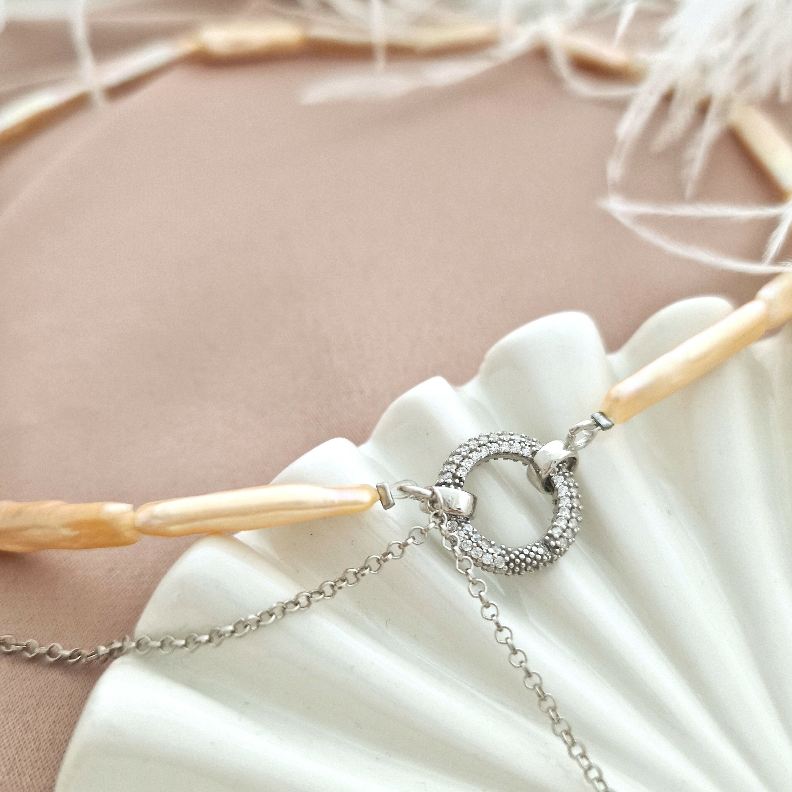 Lantisor cu Perle - Gratie de flamingo - Model sirag perle stick peachi conectate cu un charm cu Zirconii si un lant cu pandantiv - Argint 925