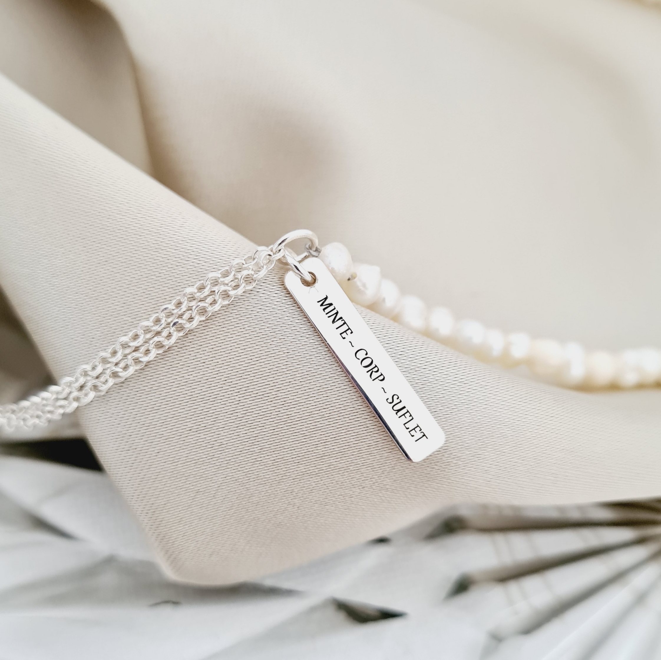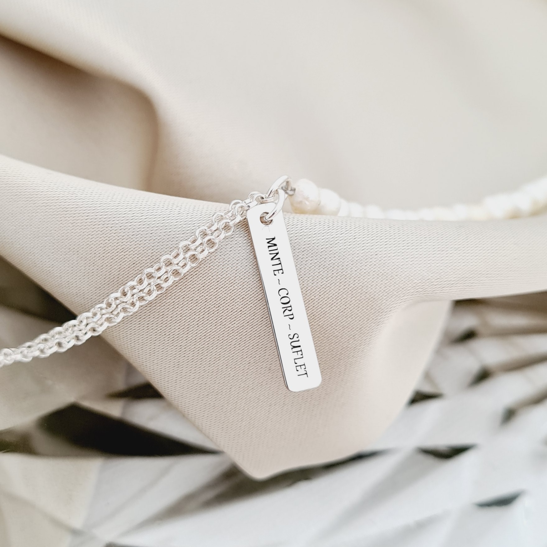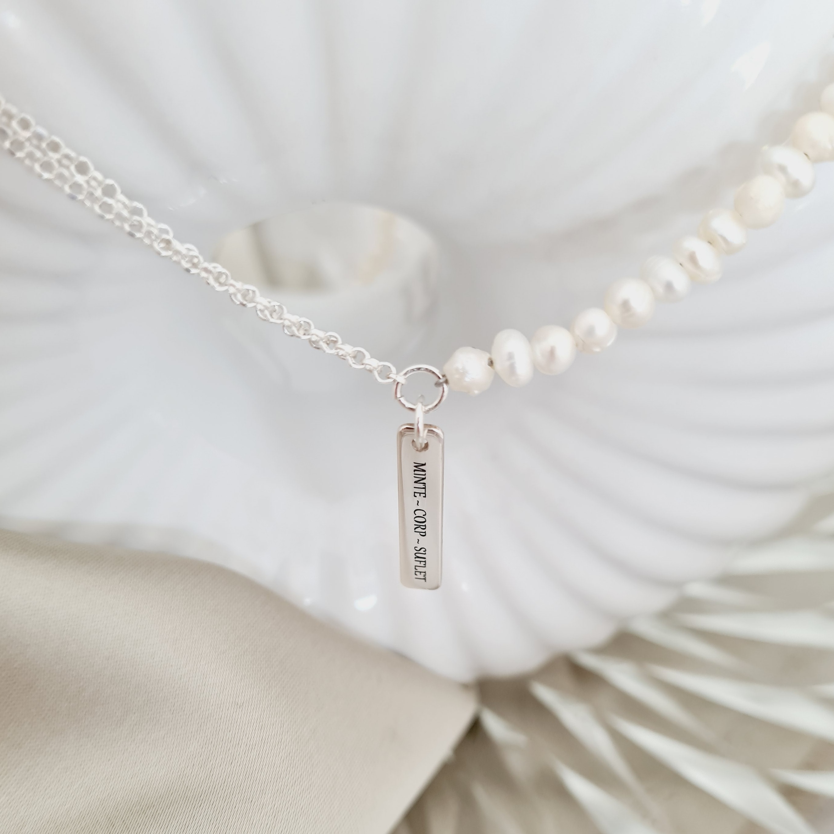 Lantisor cu Perle - Îmbinare armonioasă - Model combinat cu perle, lantisor si pandantiv placuta - Argint 925