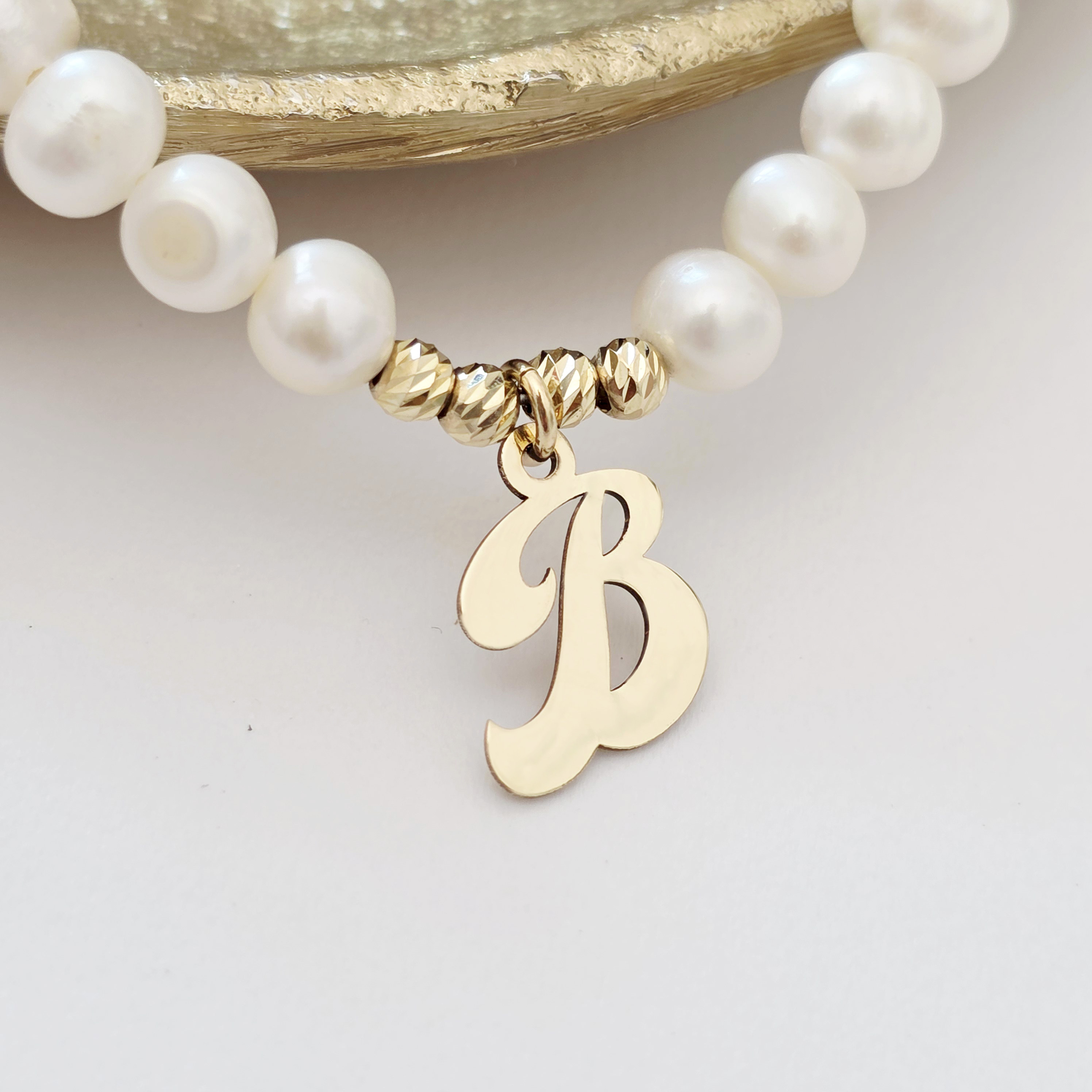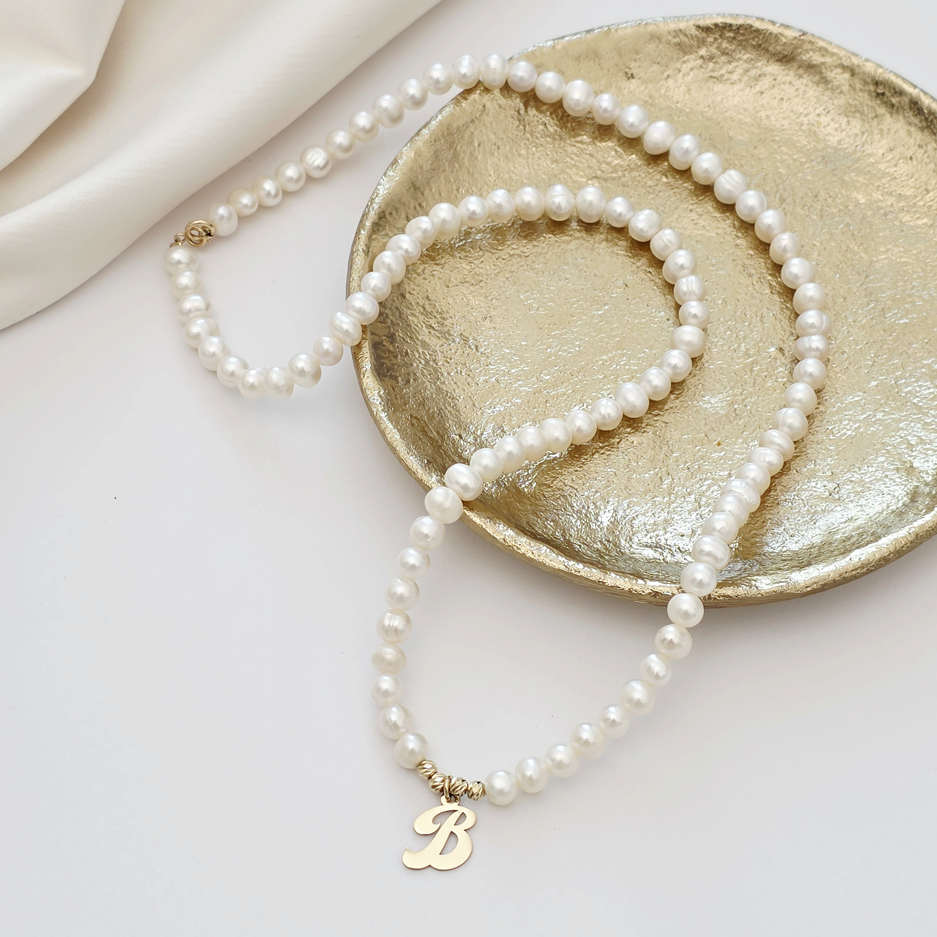 Lantisor cu Perle - Initiala eleganta - Model sirag de perle si 4 bilute - Aur Galben 14K