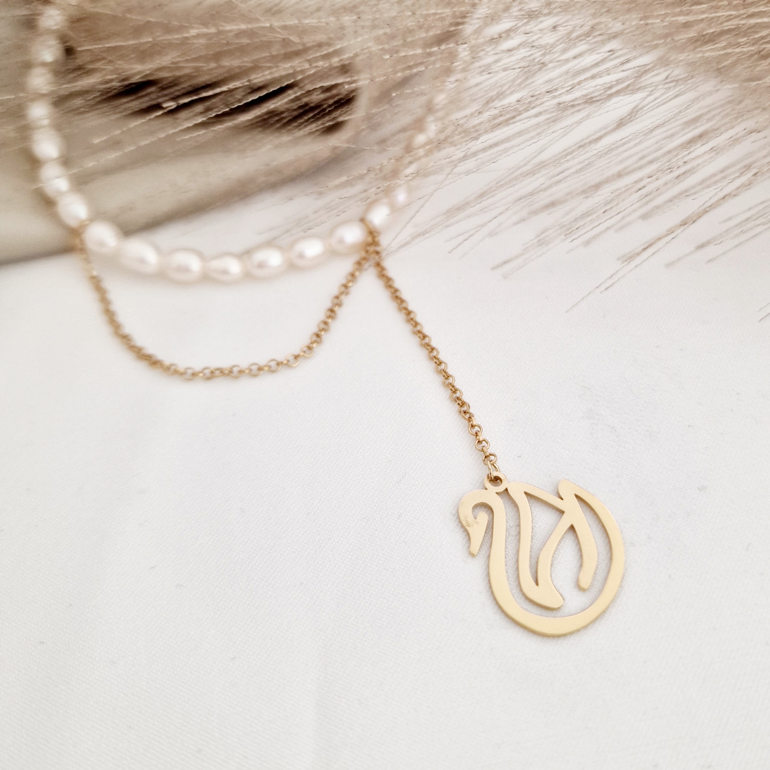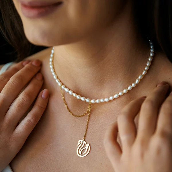 Lantisor cu Perle - Lebada aurie - Model sirag perle rice albe cu lant si pandantiv agatate - Argint 925 placat cu Aur Galben 18K