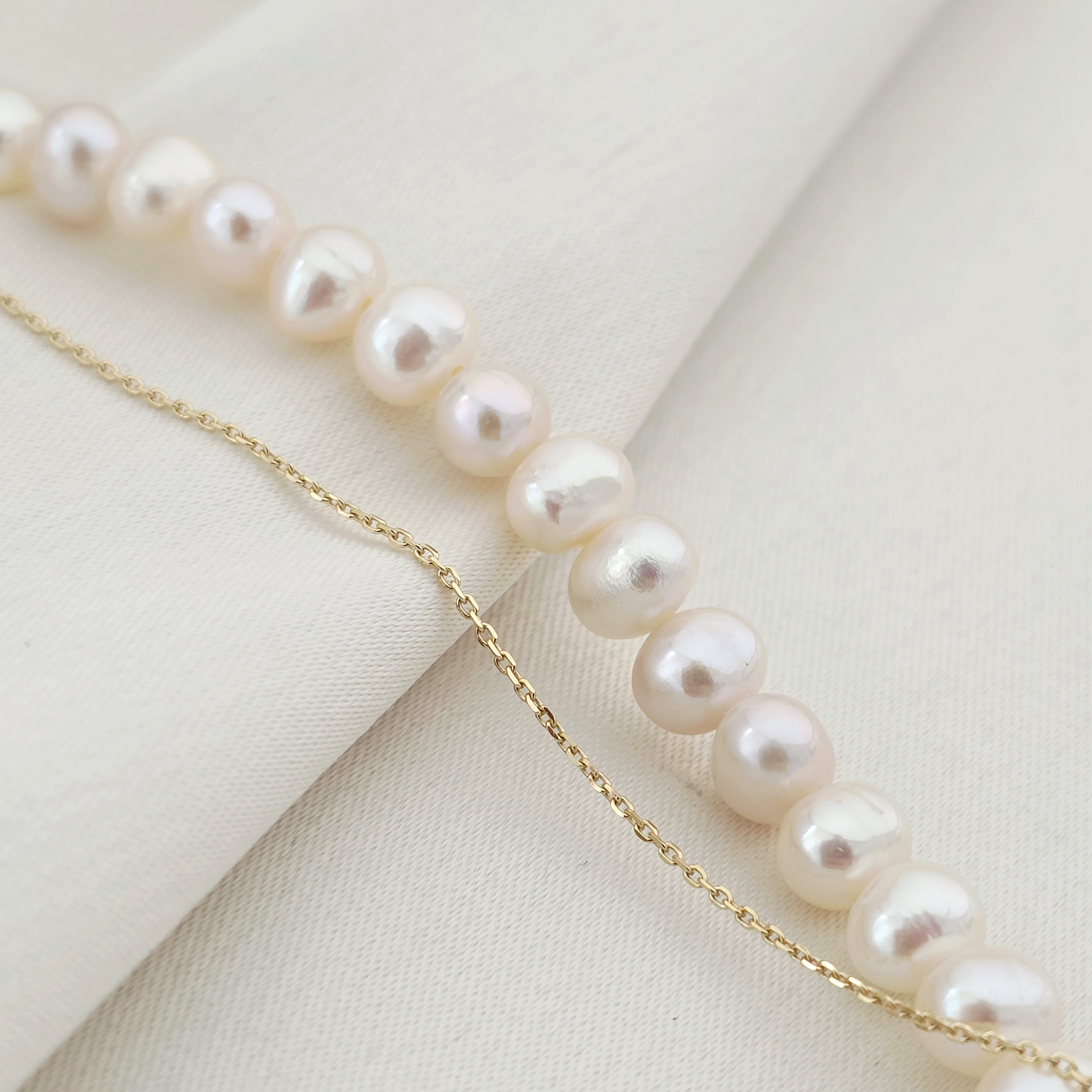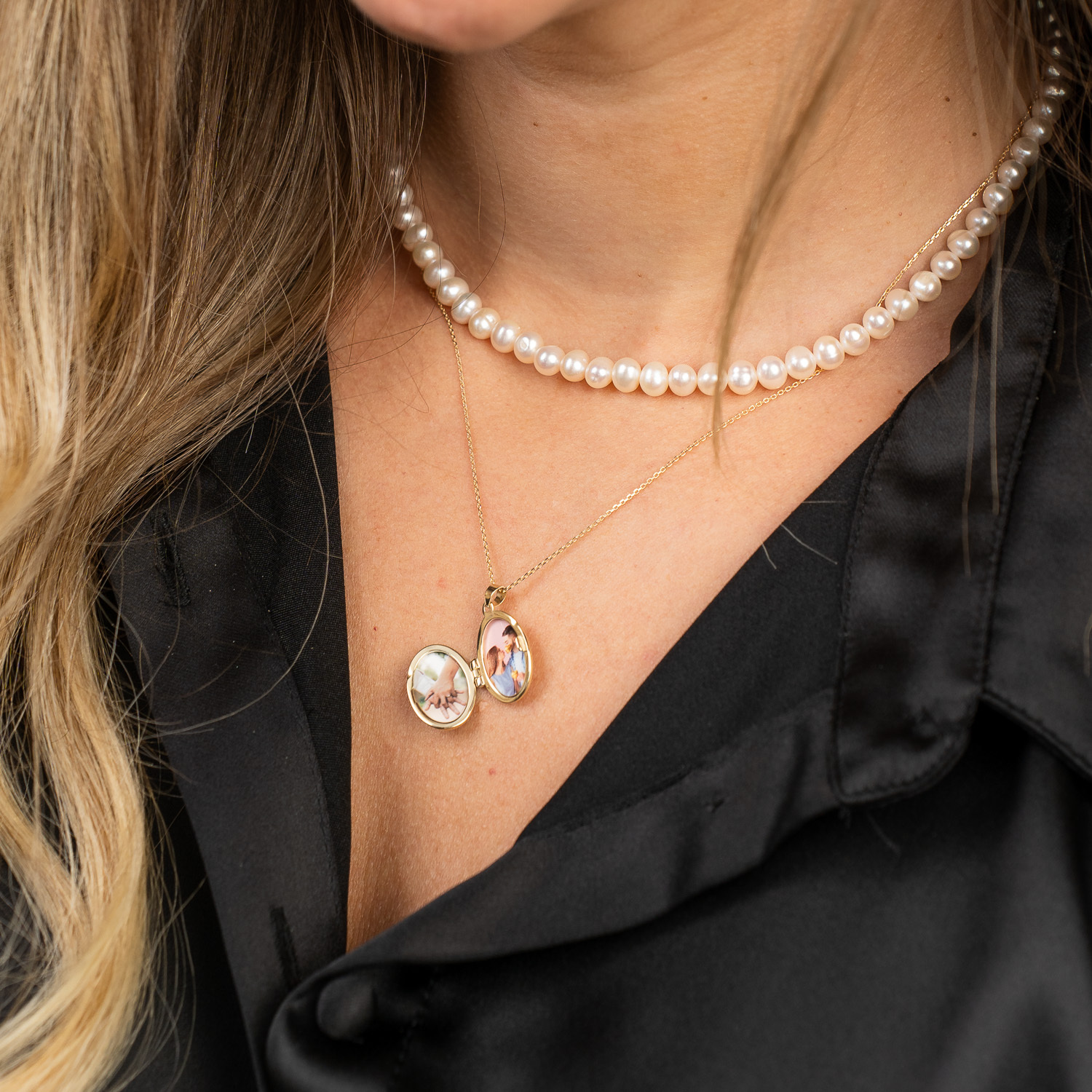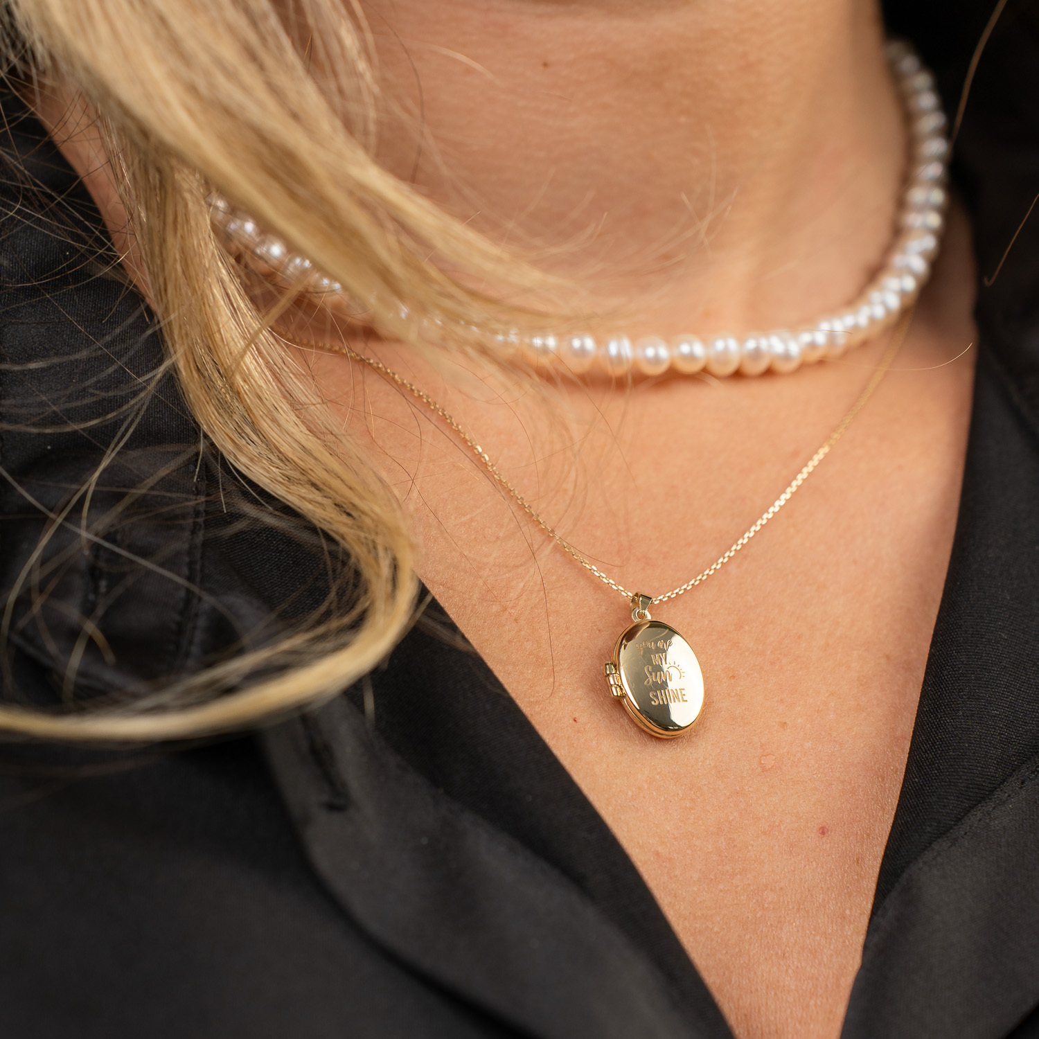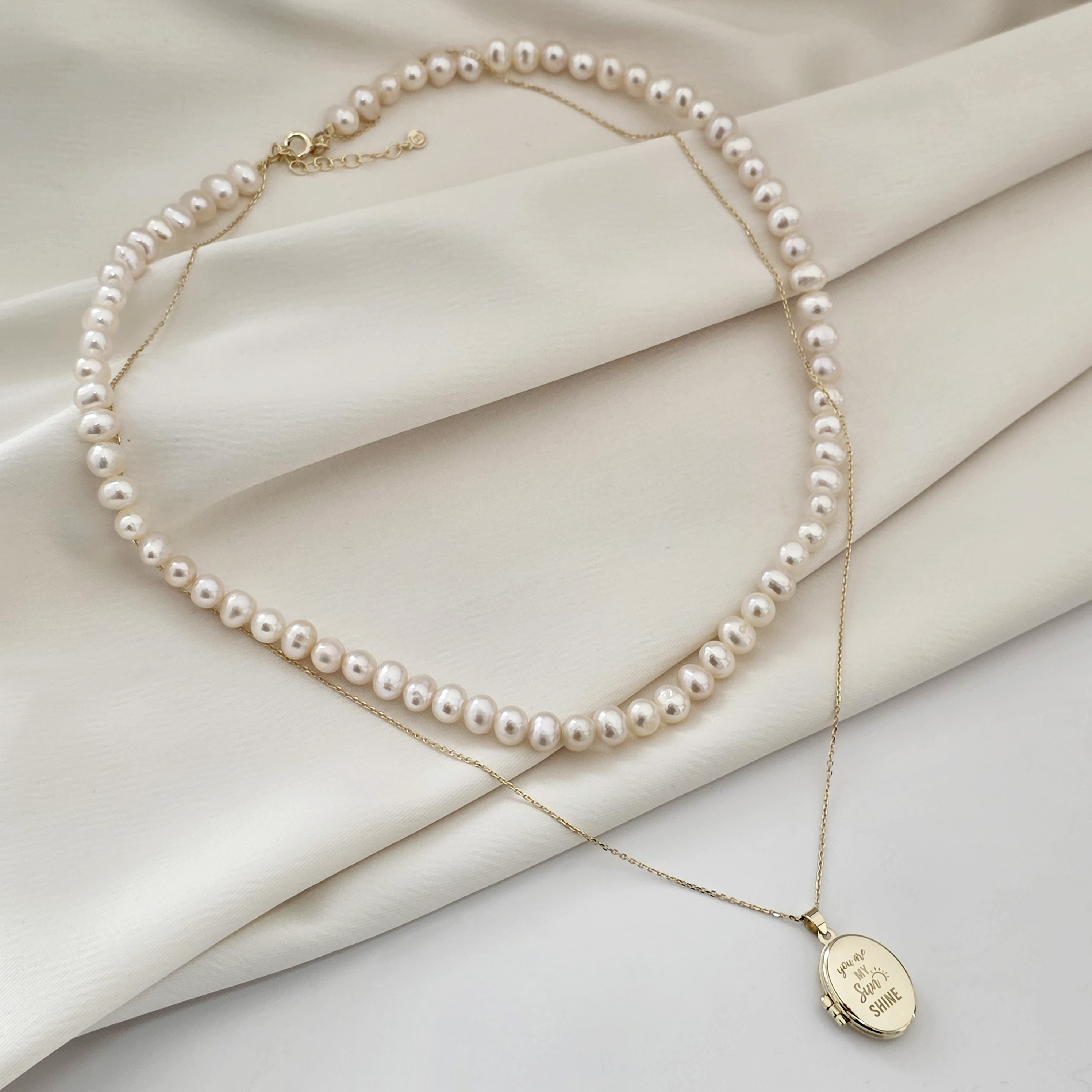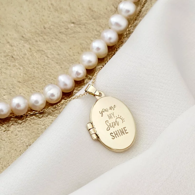 Lantisor cu Perle - Medalion amintirilor OVAL - Model 2 straturi cu sirag de perle si lantisor - Aur Galben 9K