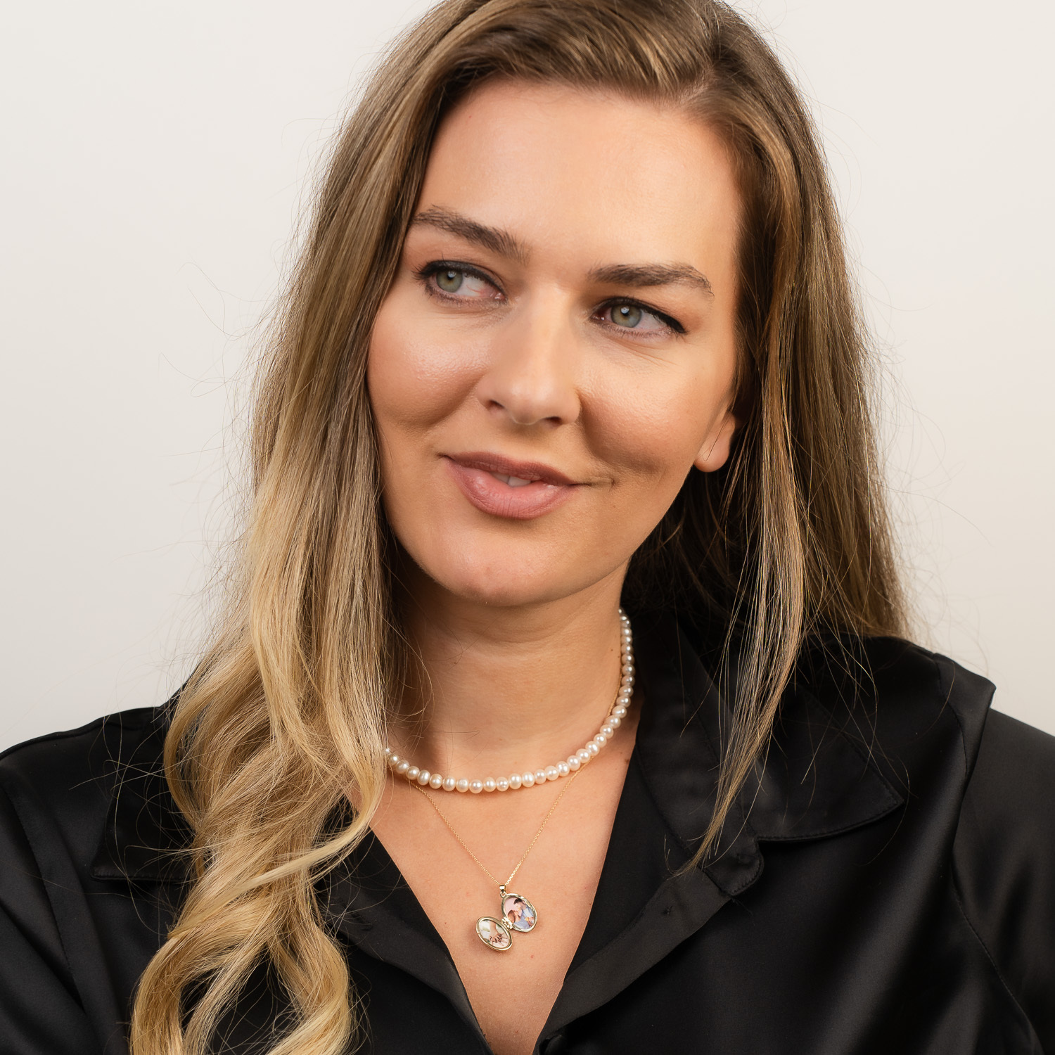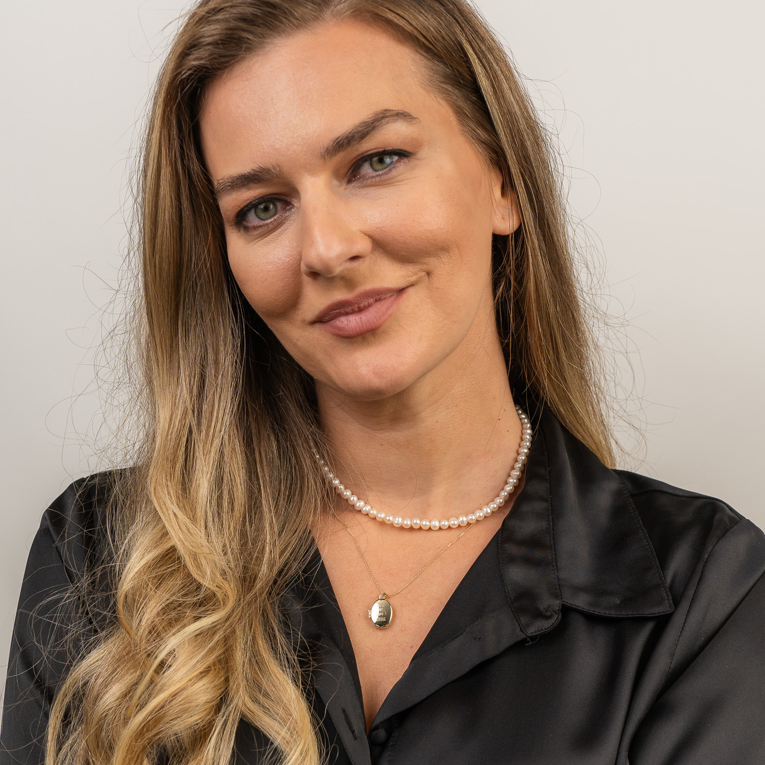 - Bijuteria este creata din 2 straturi, unul cu un sirag de perle de 37.5 cm, iar unul cu un lantisor de 45 cm pe care vine pus medalionul.