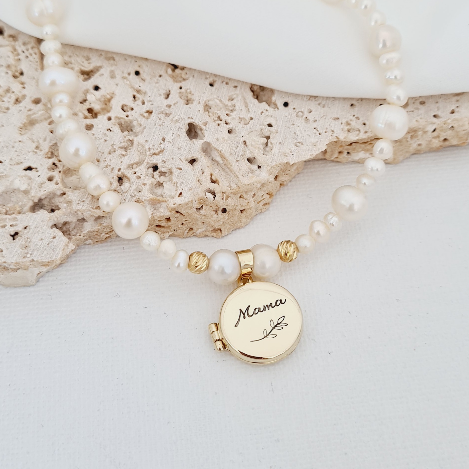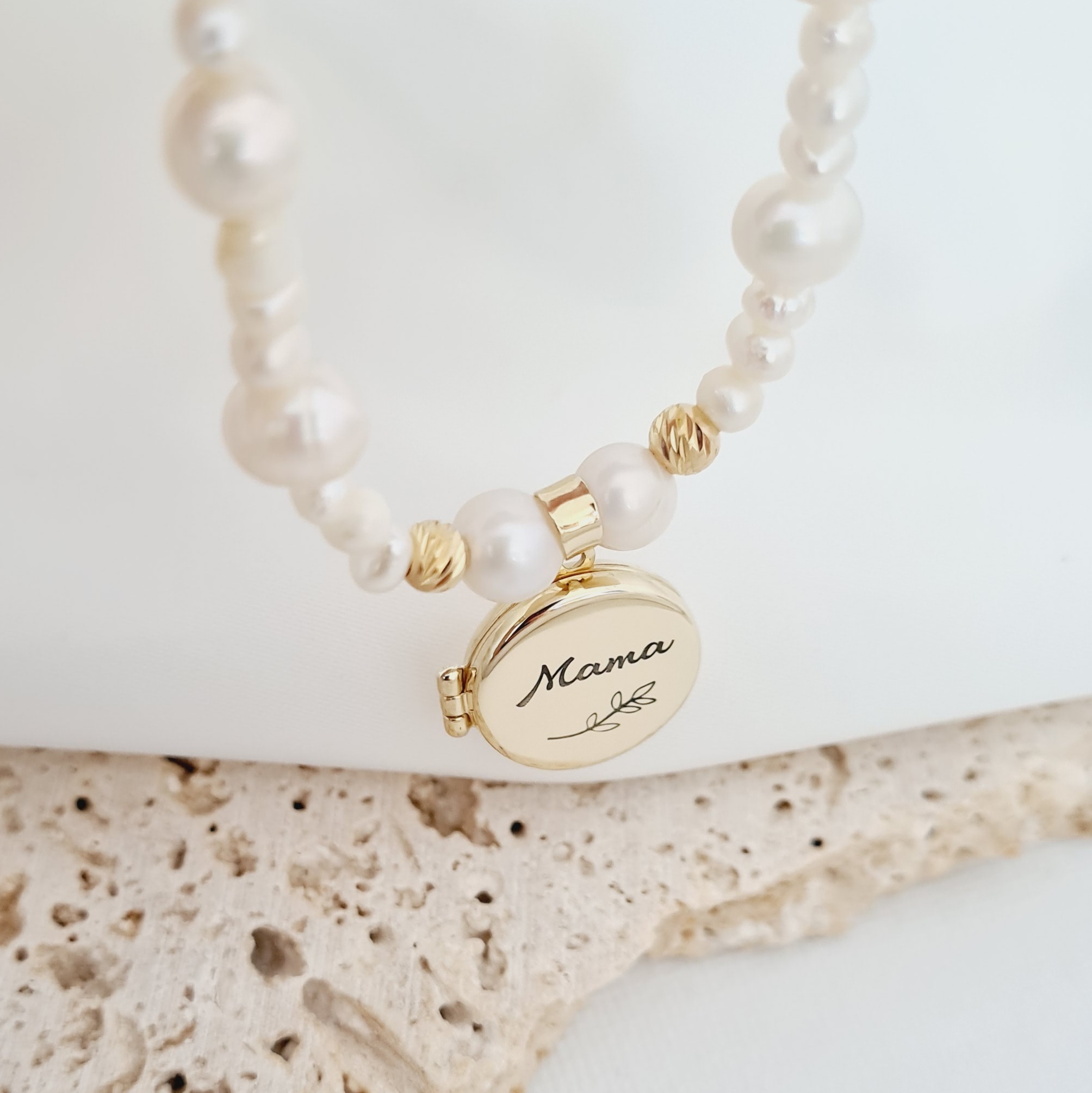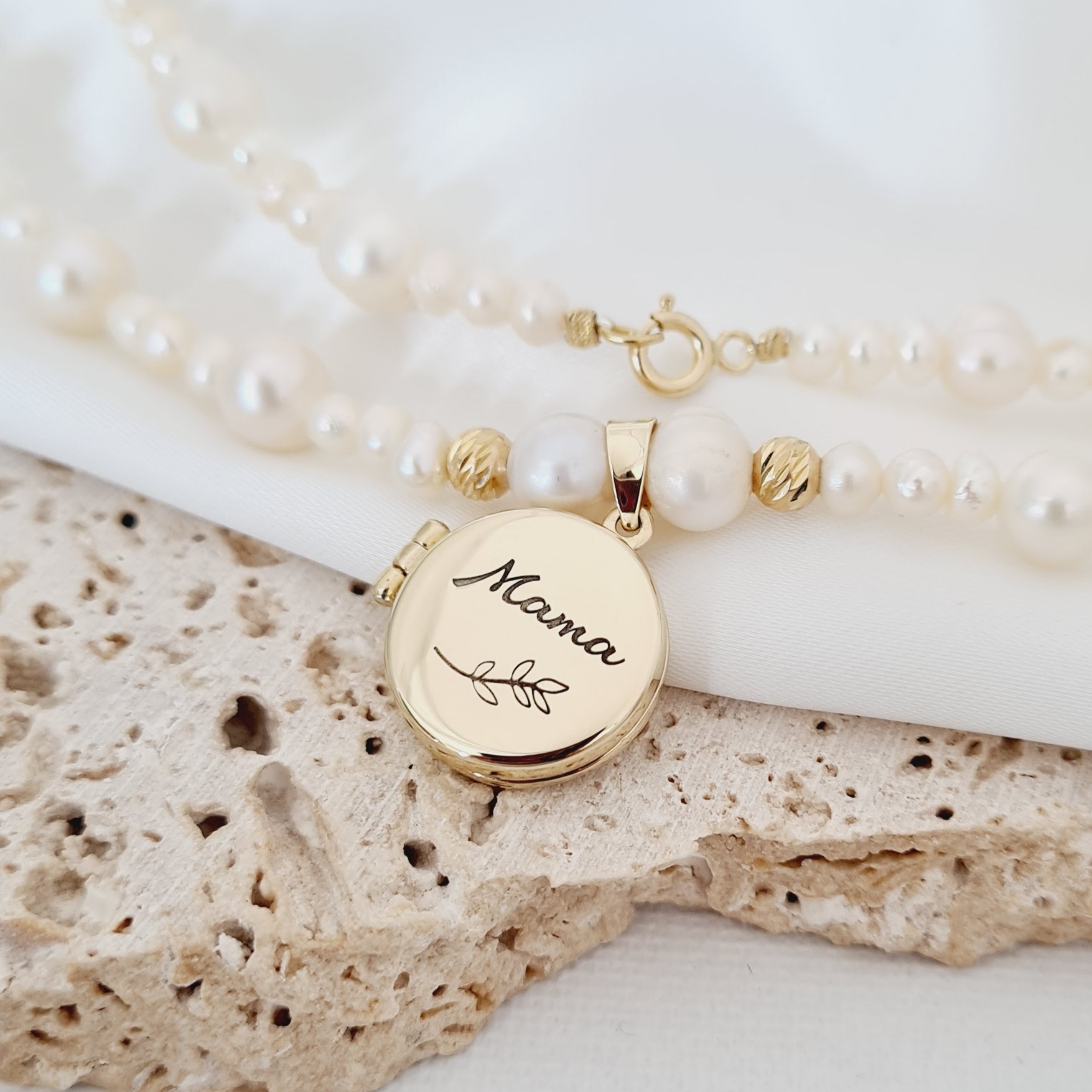 Lantisor cu Perle - Medalionul amintirilor ROTUND - Model sirag de perle de diferite dimensiuni si 2 bilute - Aur Galben 9K
