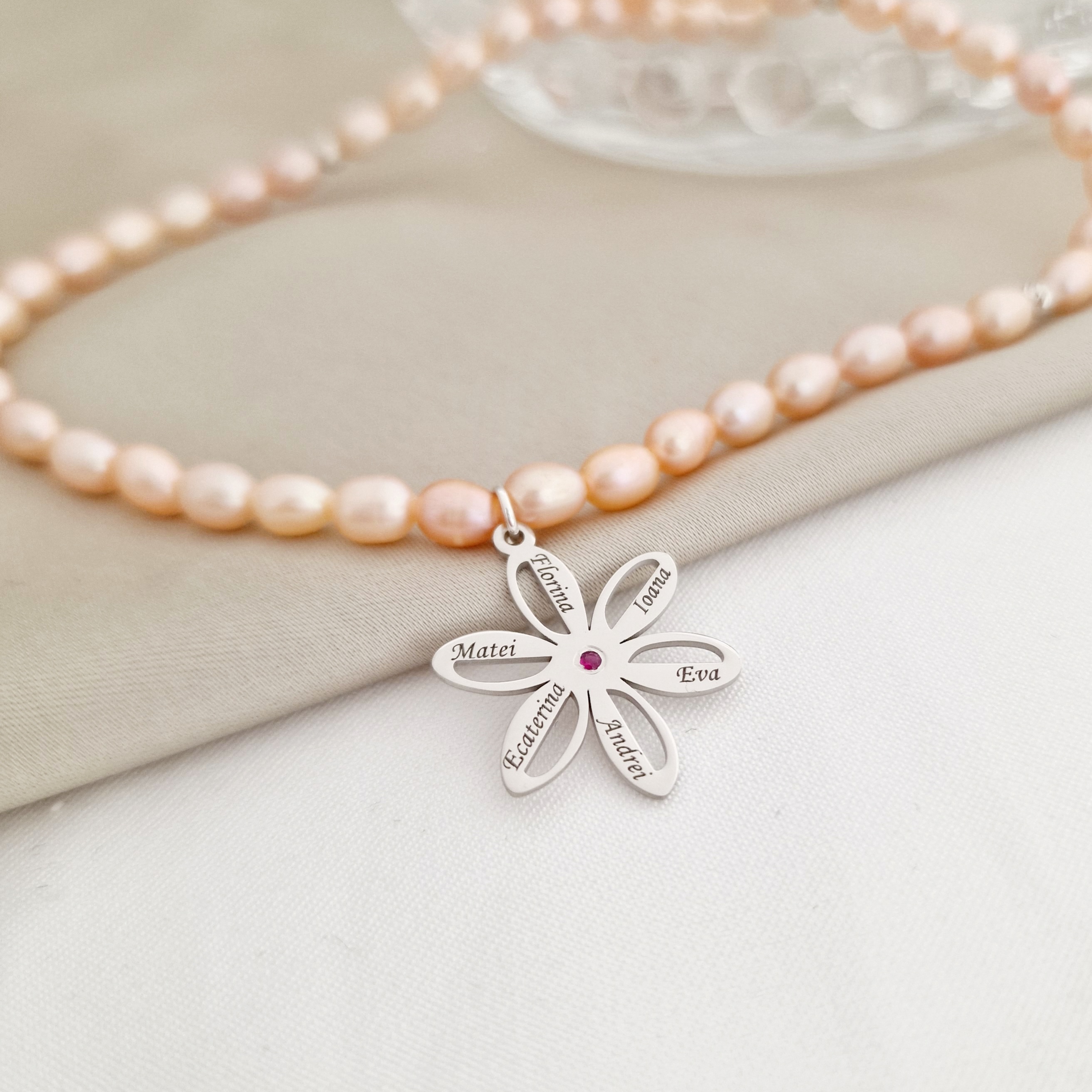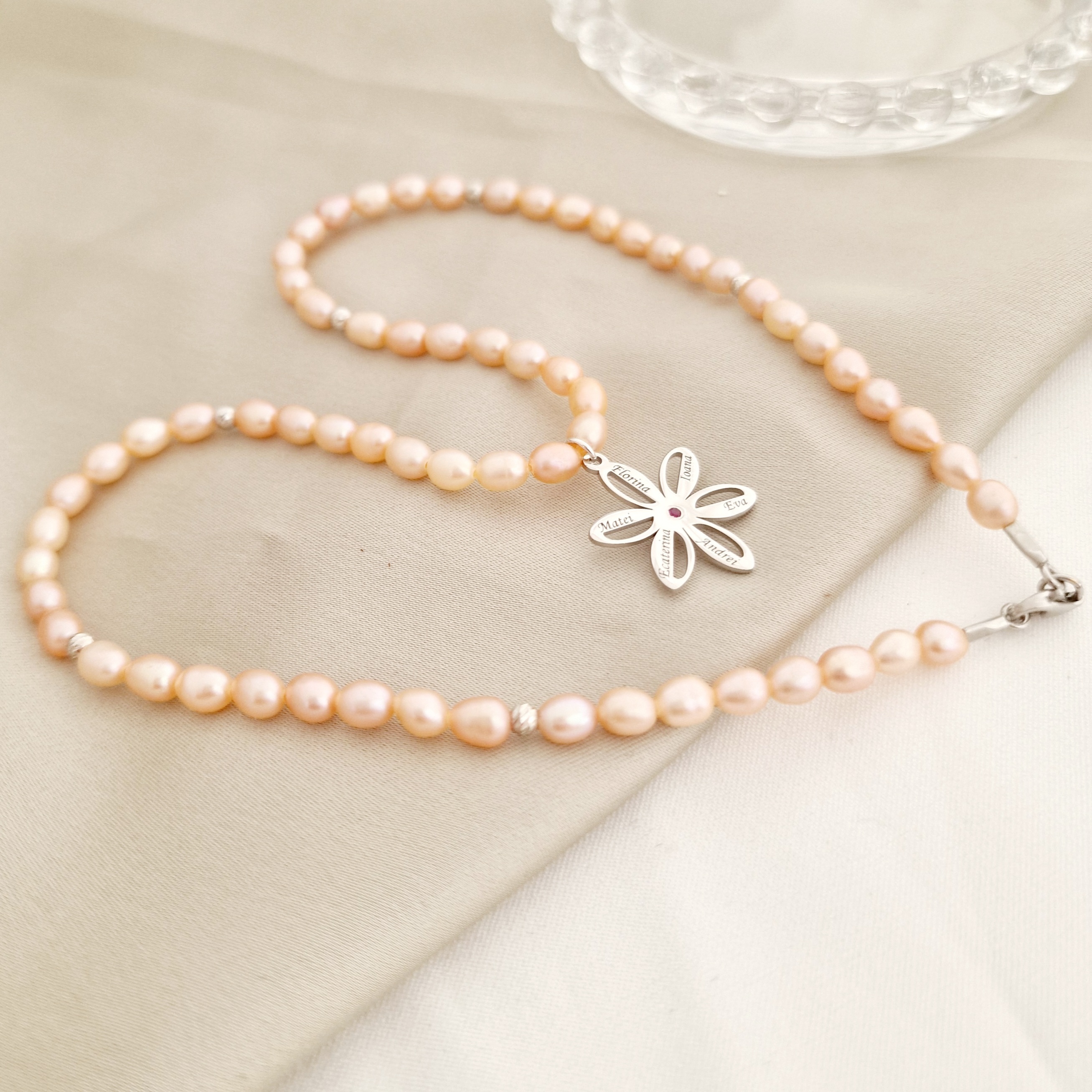 Lantisor cu Perle - Misterul petalelor - Model sirag perle rice peach si pandantiv floare cu Rubin - Argint 925