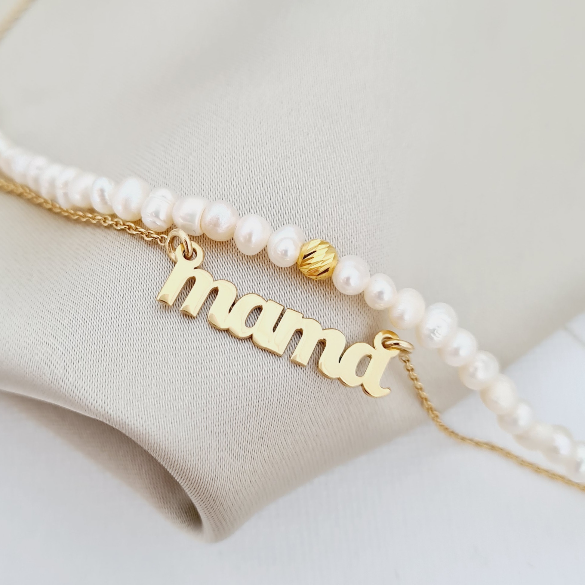 - Bijuteria este creata din 2 straturi, unul cu un sirag de perle de 38 cm, iar unul cu un lantisor de 41 cm la care se ataseaza si numele.