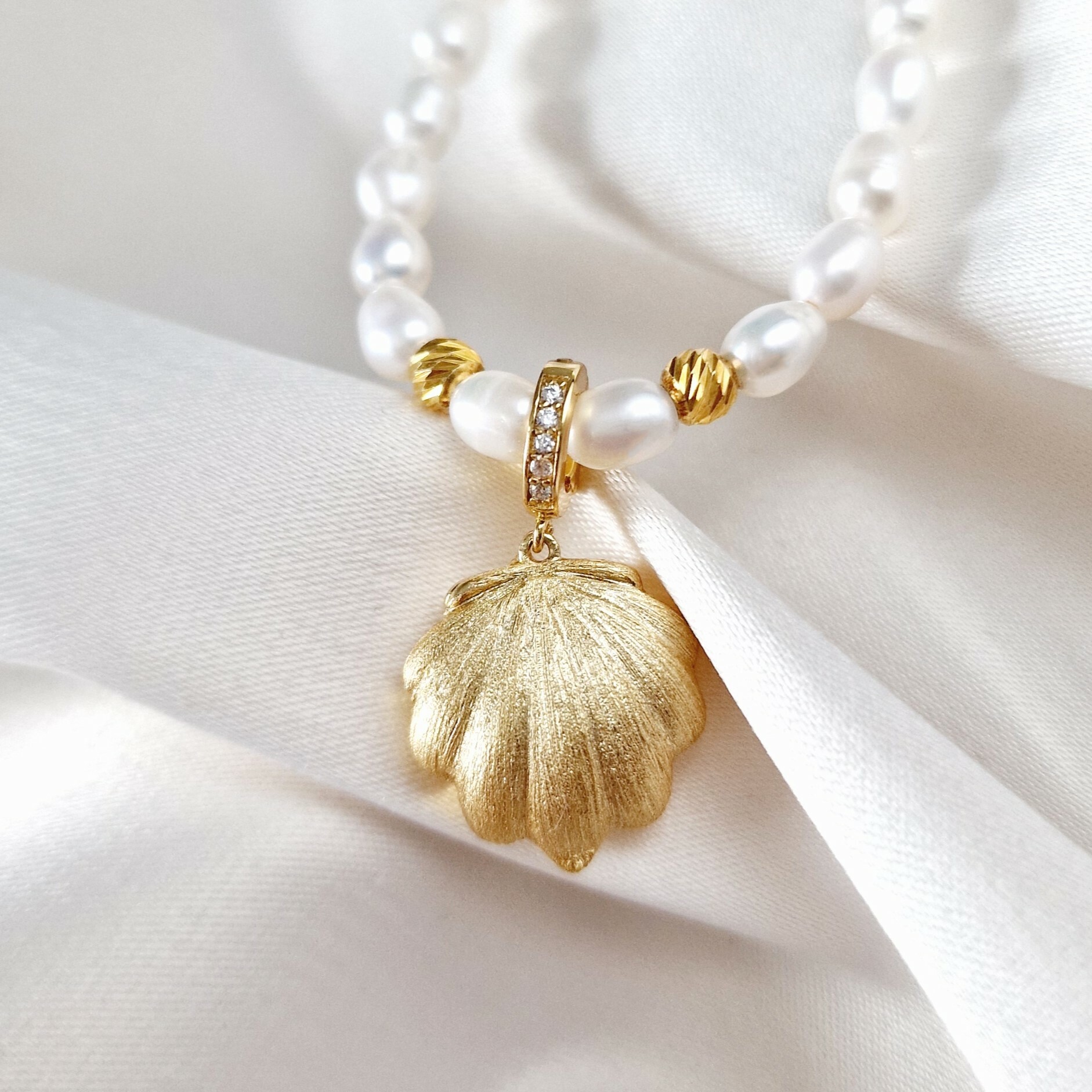 Designul unic al pandantivului, combinând perlele și scoica, simbolizează delicatețea și frumusețea naturală, transformând acest accesoriu într-o piesă de colecție.
