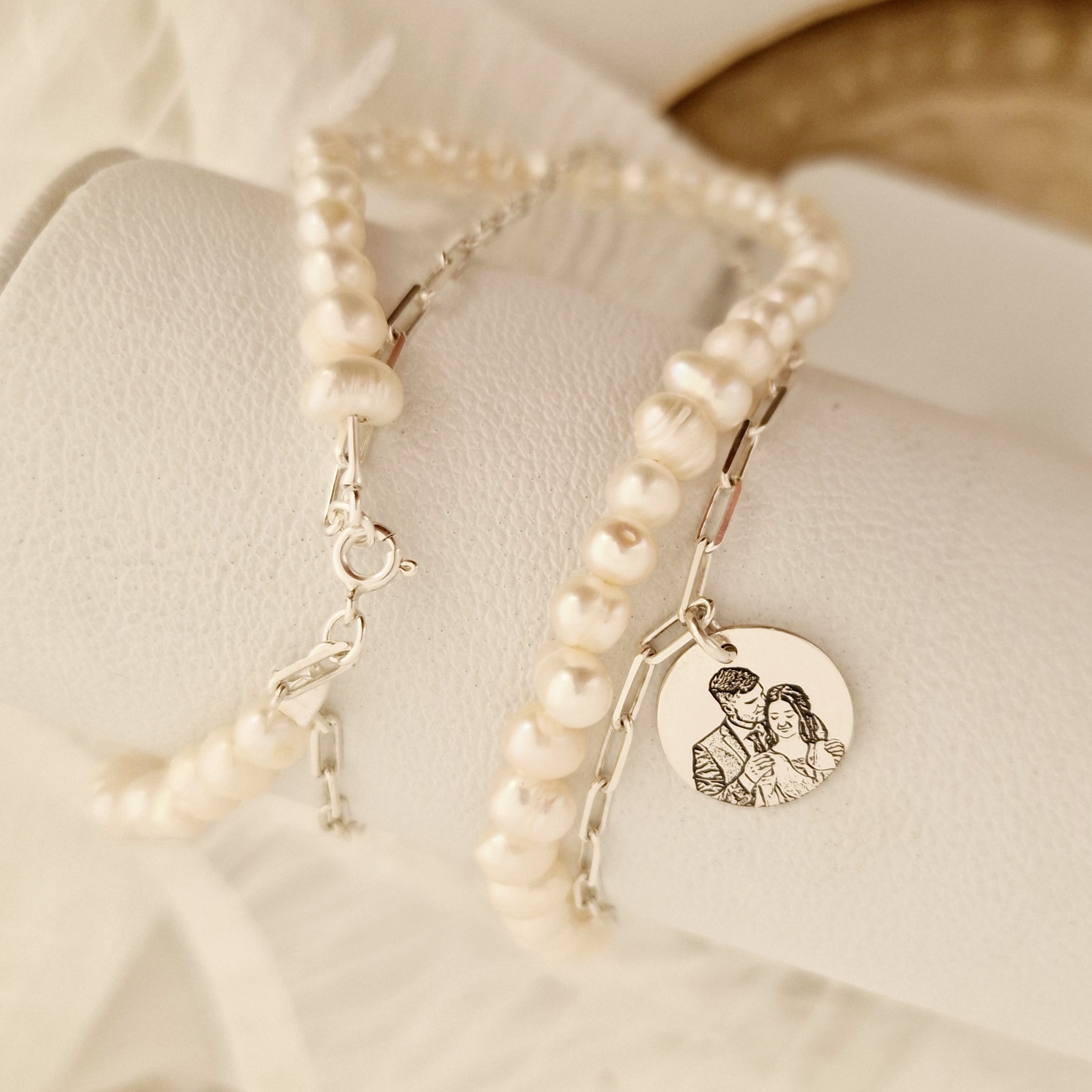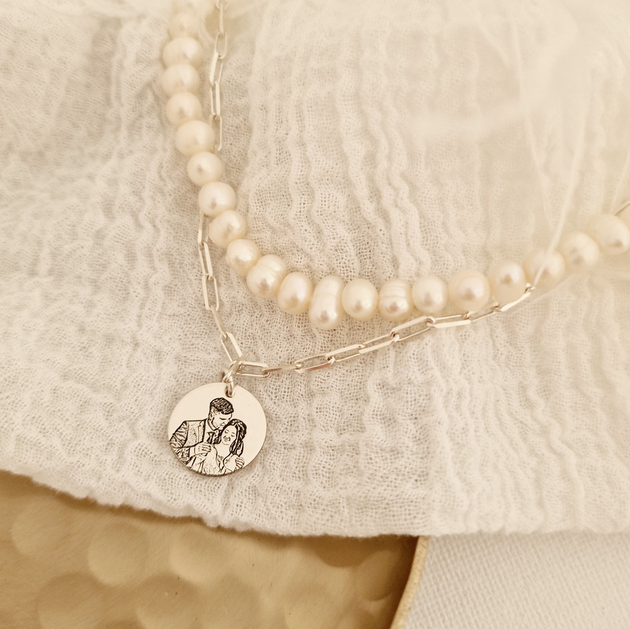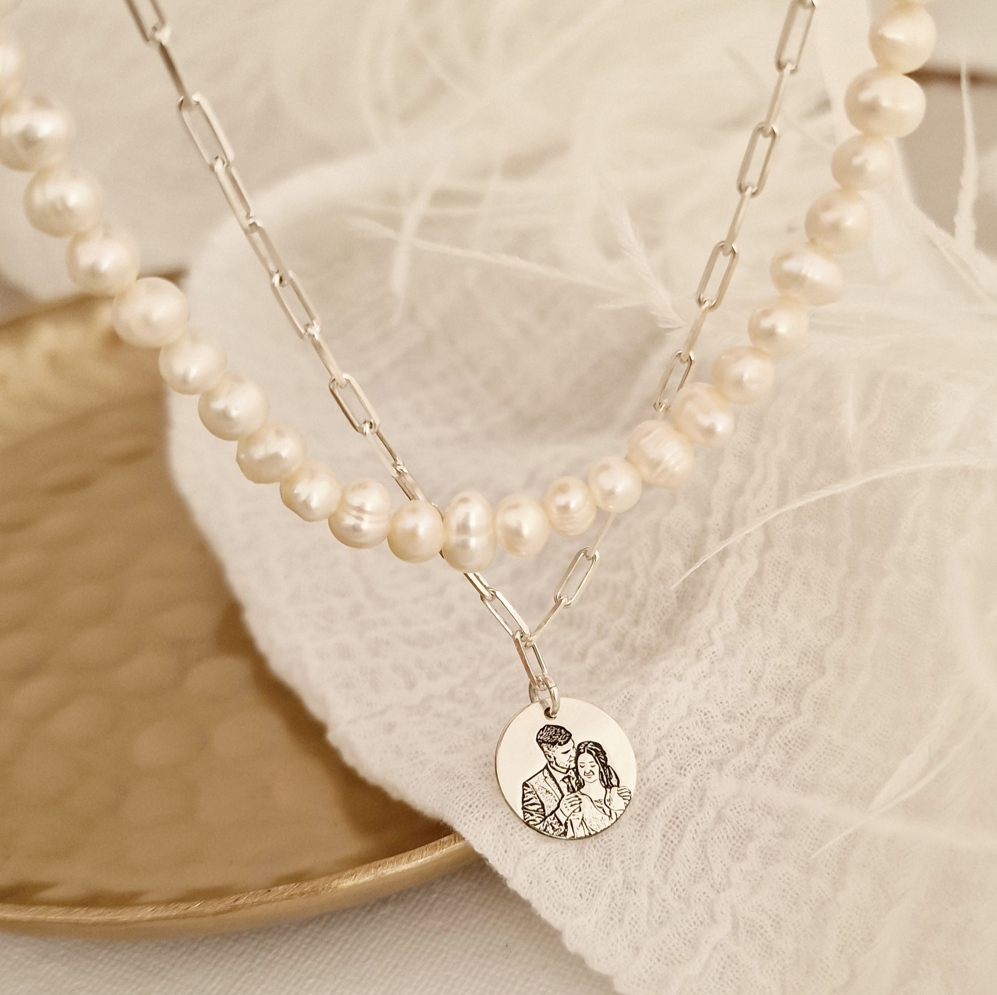 Lantisor cu Perle - Puritate capturata - Model 2 straturi cu sirag perle si lant cu pandantiv fotogravura - Argint 925