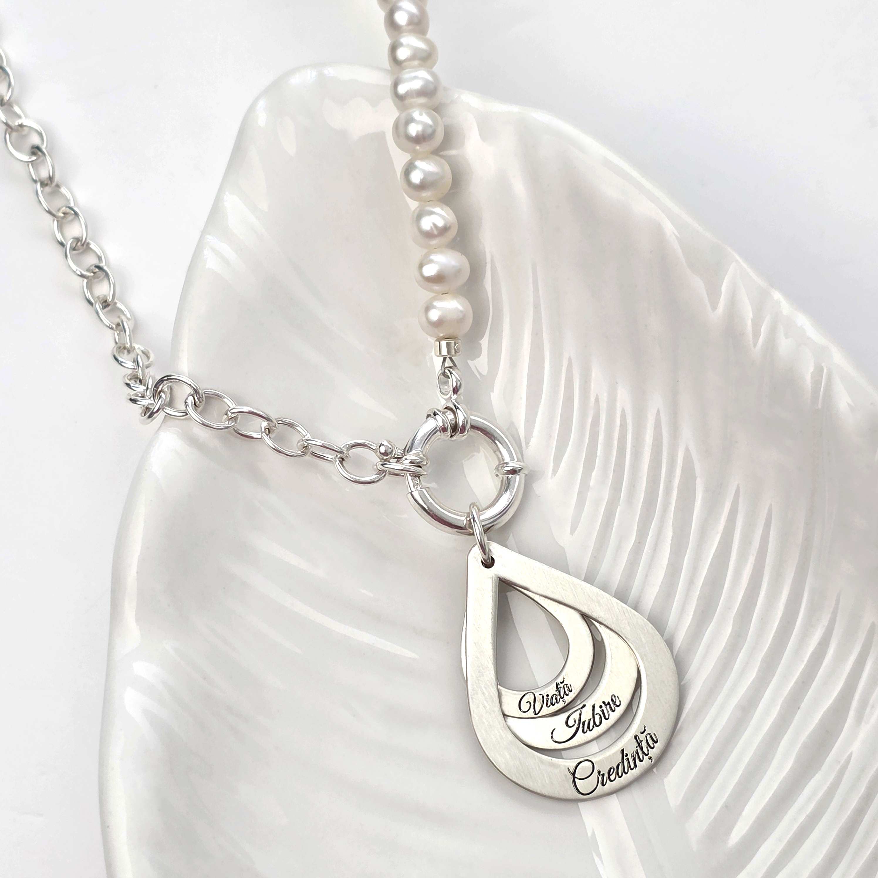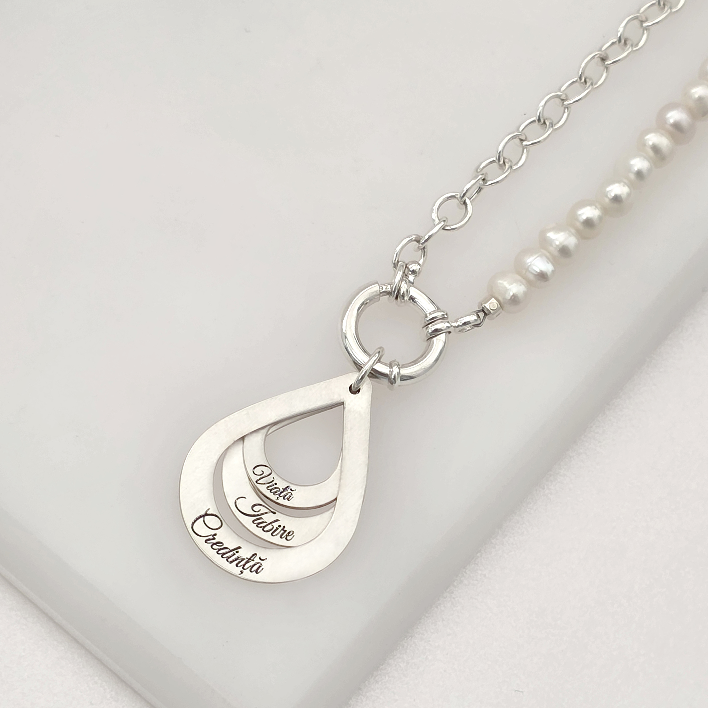Lantisor cu Perle - trei picaturi suprapuse - text personalizat - Model sirag de perle stick albe si lantisor - Argint 925 matuit