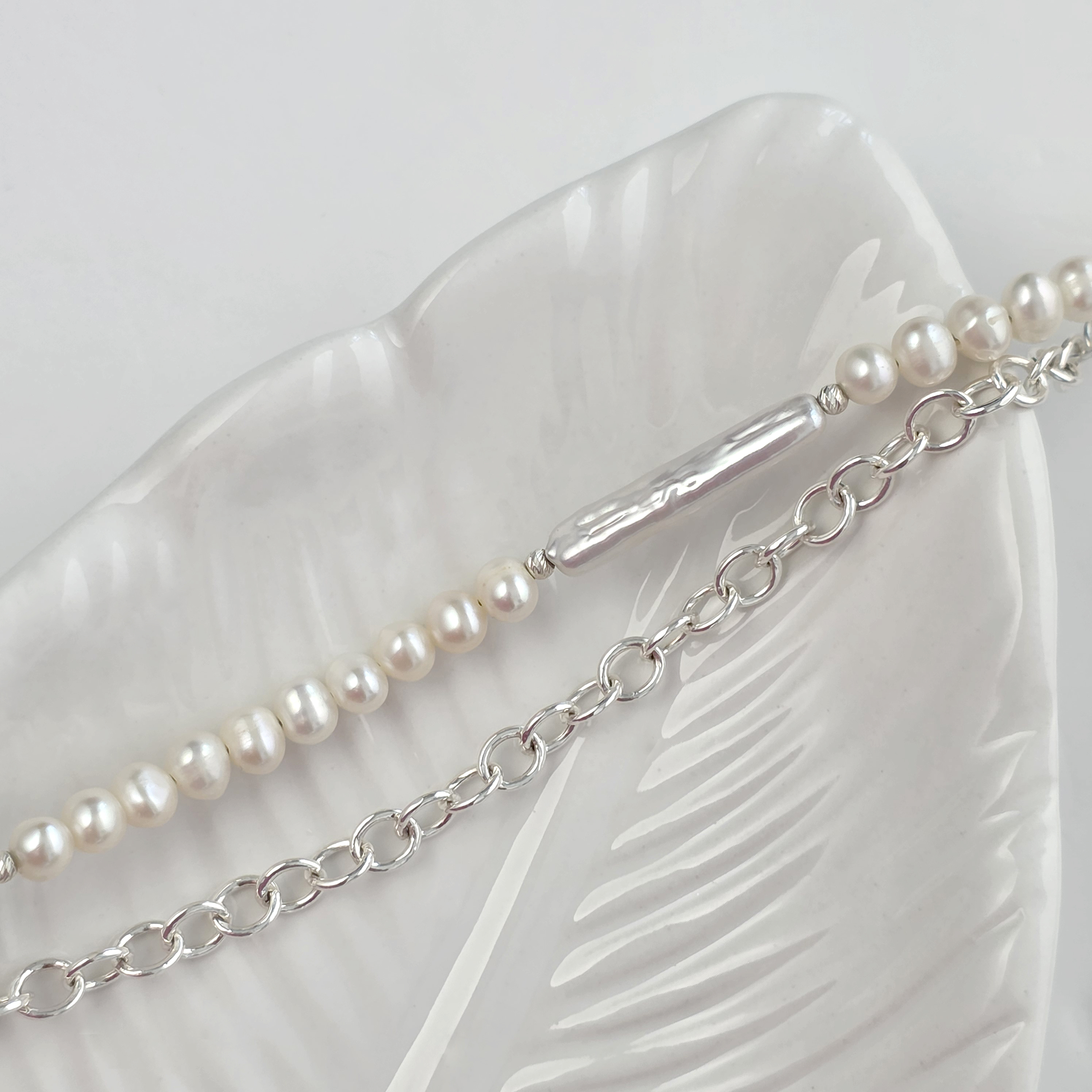 Acest lănțișor delicat îmbină farmecul clasic al perlelor stick albe cu modernitatea designului în trei picături suprapuse. Realizat din Argint 925 matuit, oferă un aspect sofisticat și atemporal. Pandantivul personalizat cu text adaugă o notă unică, perfectă pentru un cadou cu semnificație.