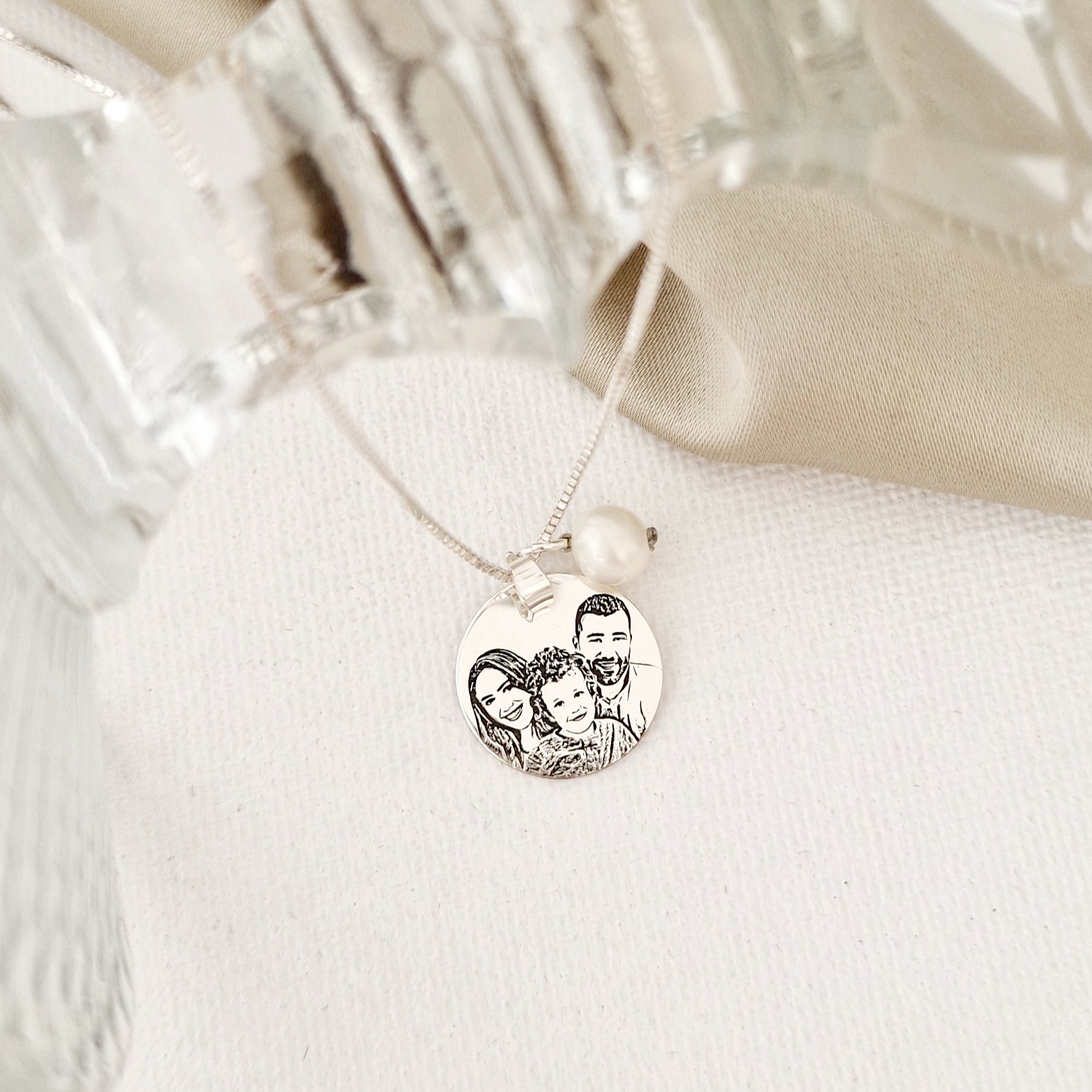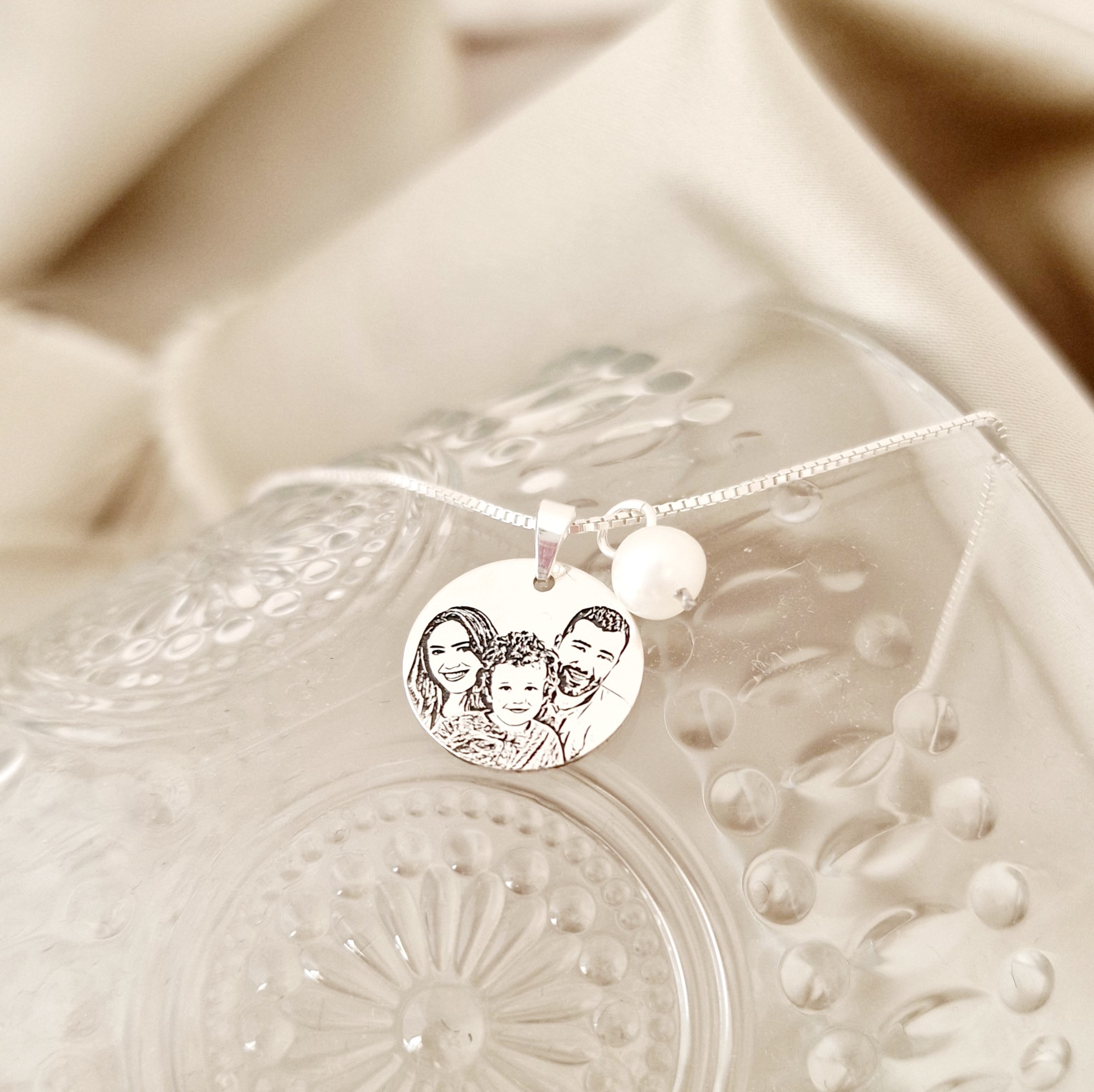 Cadouri cu însemnătate ce poartă amprenta iubirii tale necondiționate. Transformă momentele speciale în amintiri pe care le poți purta mereu cu lănțișoarul cu fotogravură. Bijuteria este personalizata cu portretul dorit și un charm cu perla.