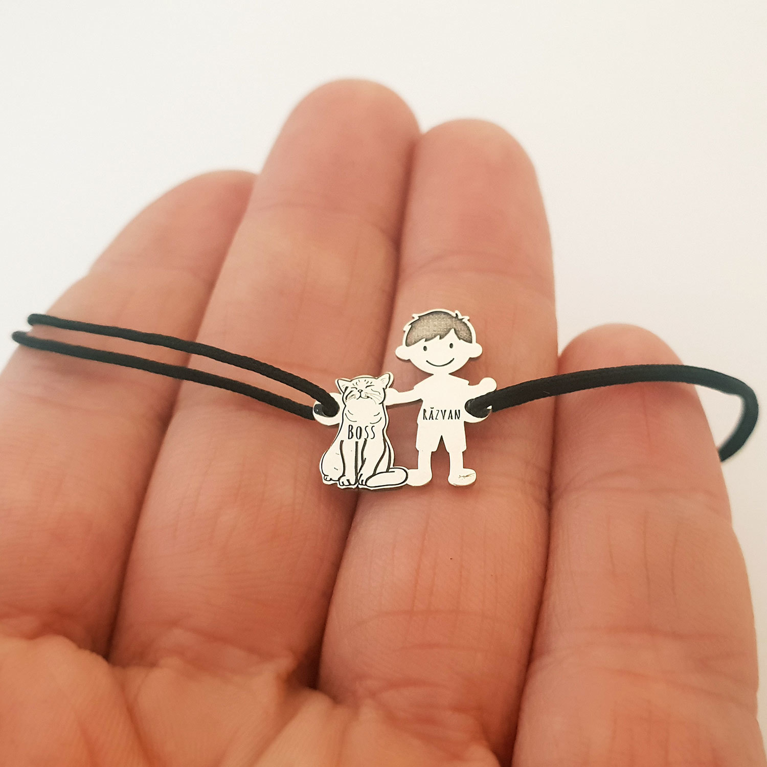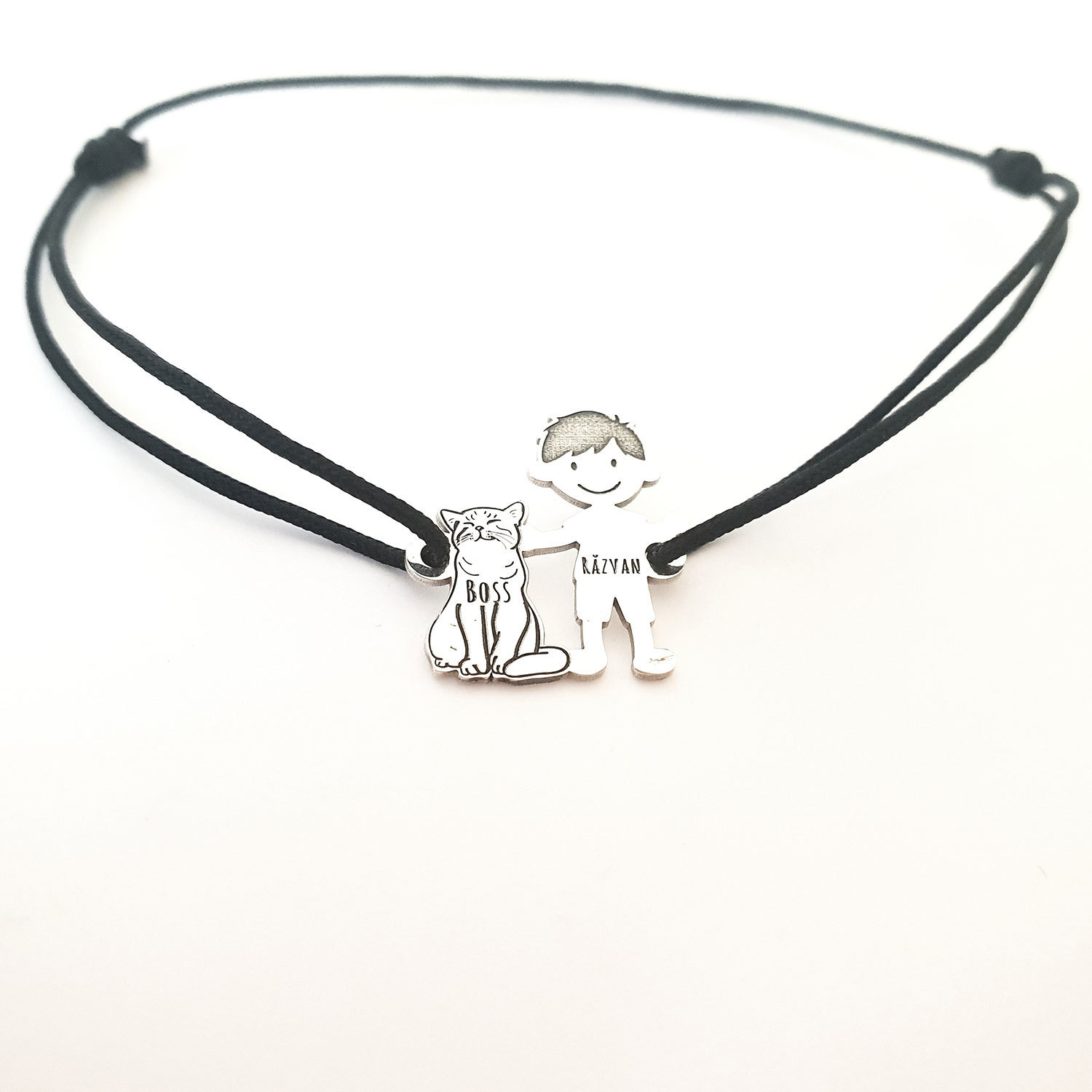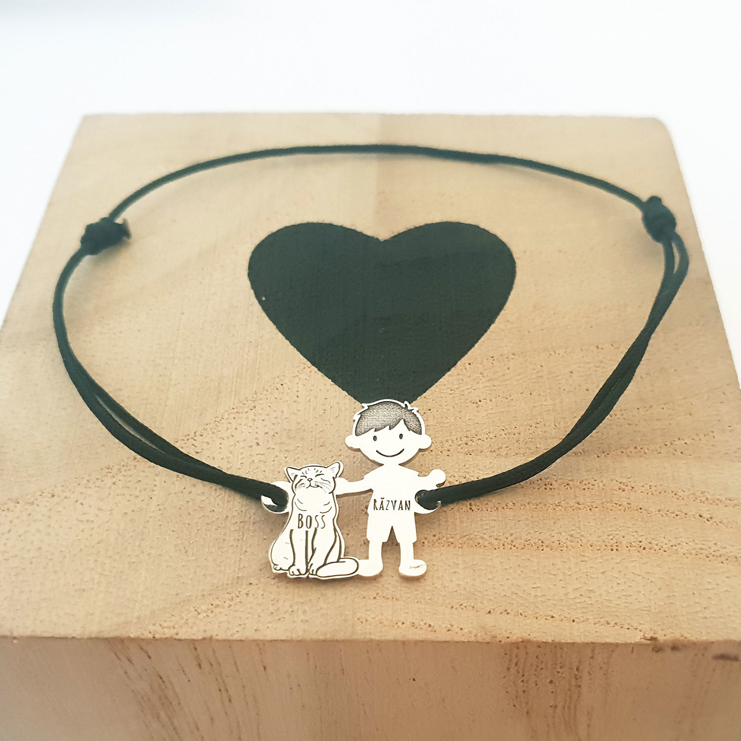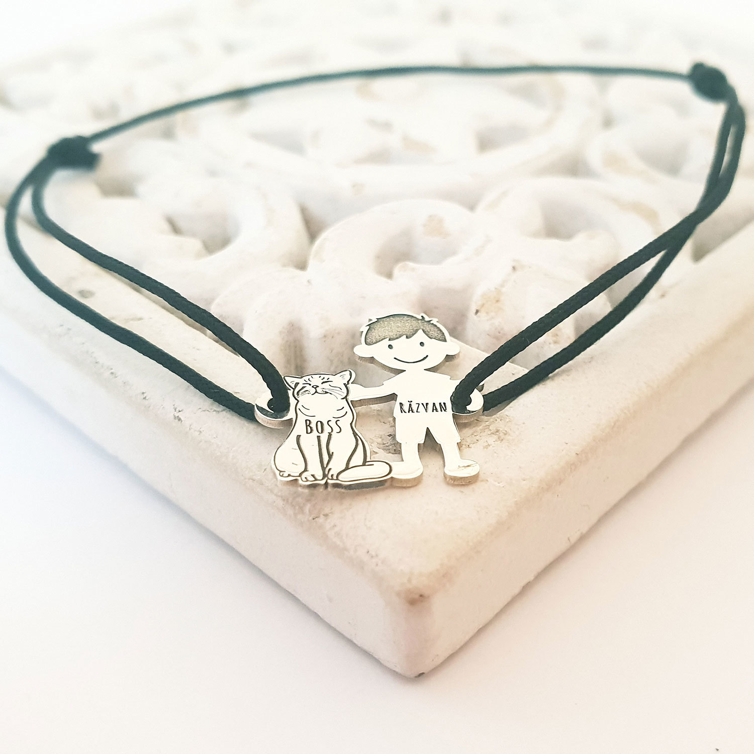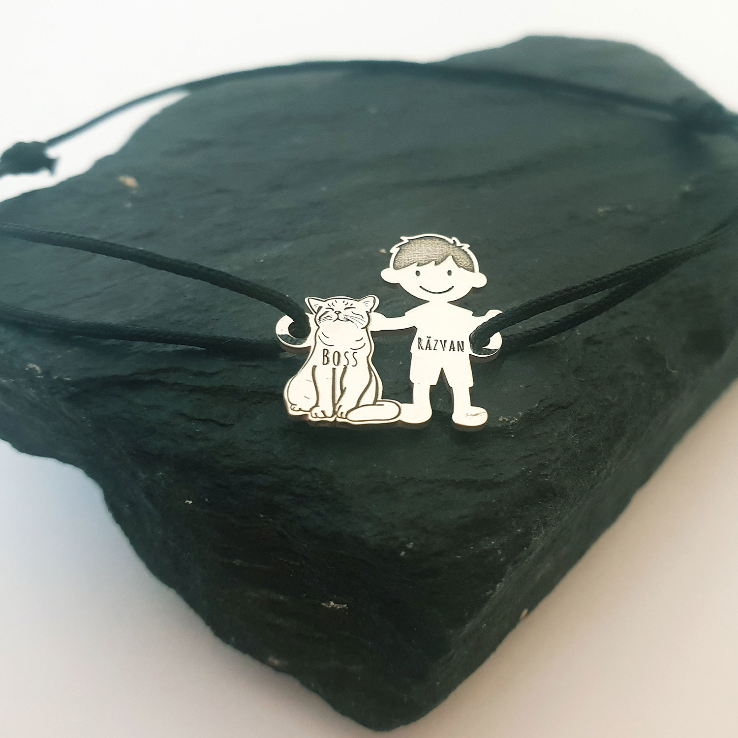 Bratara Familie - 2 Membri - Baiat si Pisica - pandant Argint 925, snur reglabil