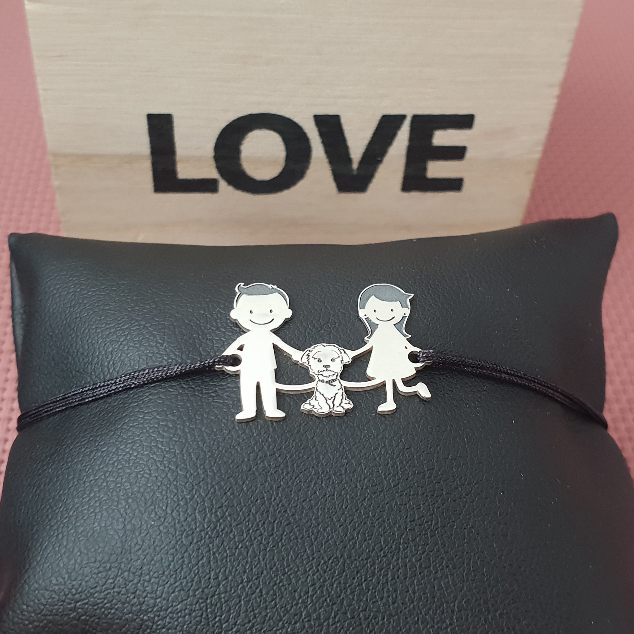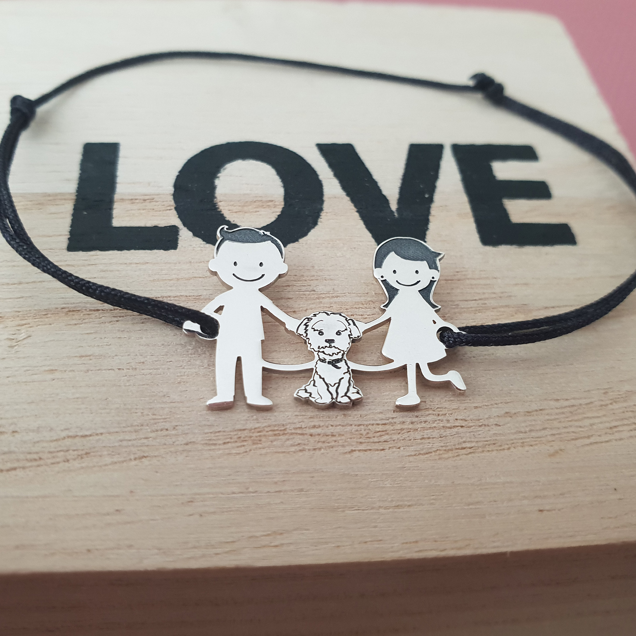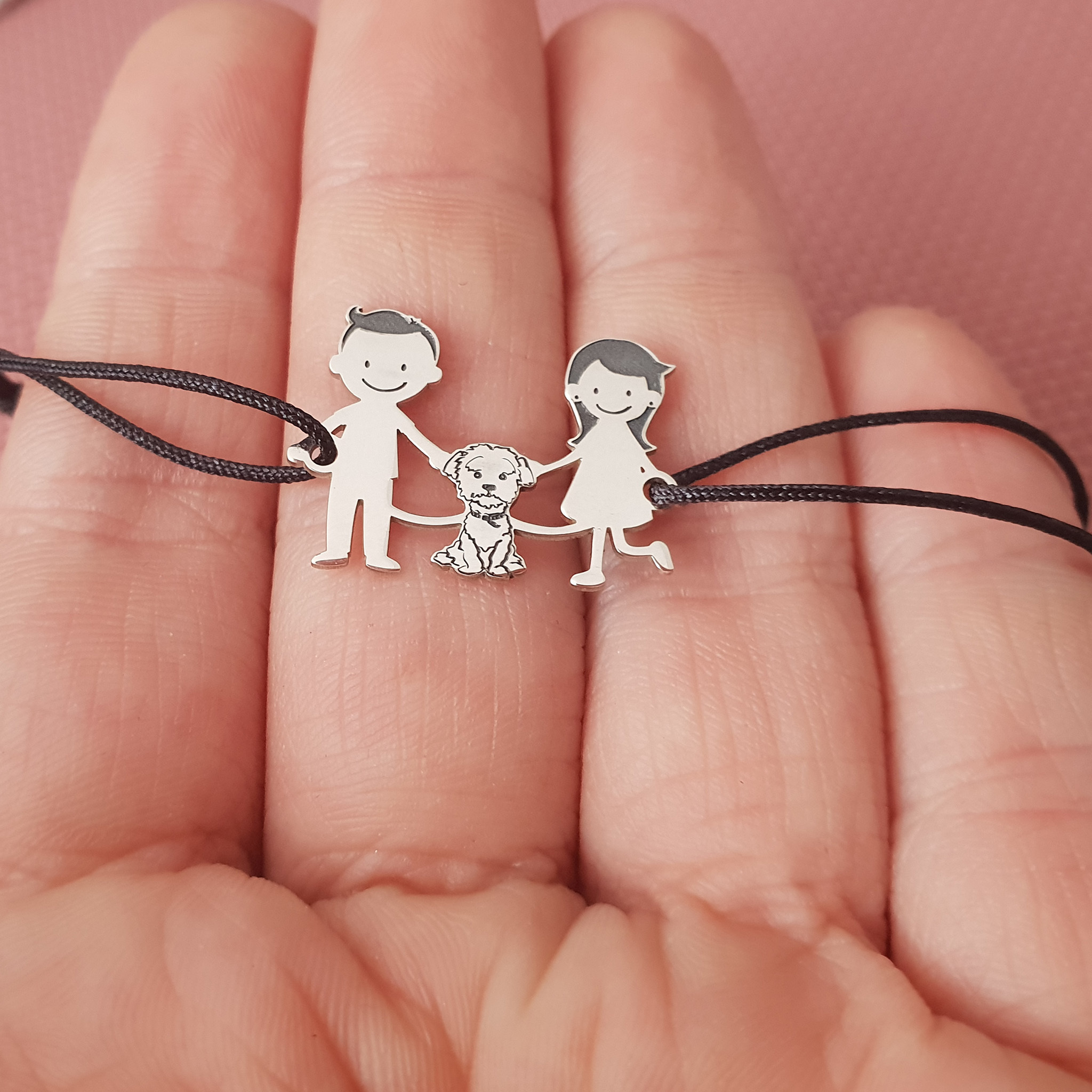 Bratara Familie - 3 Membri cu Bichon - Argint 925, snur negru