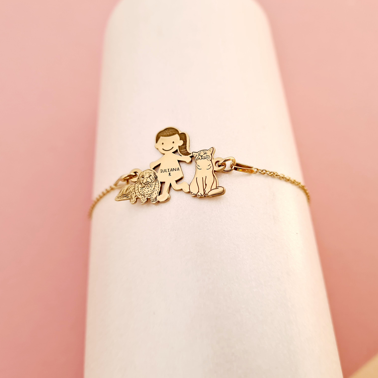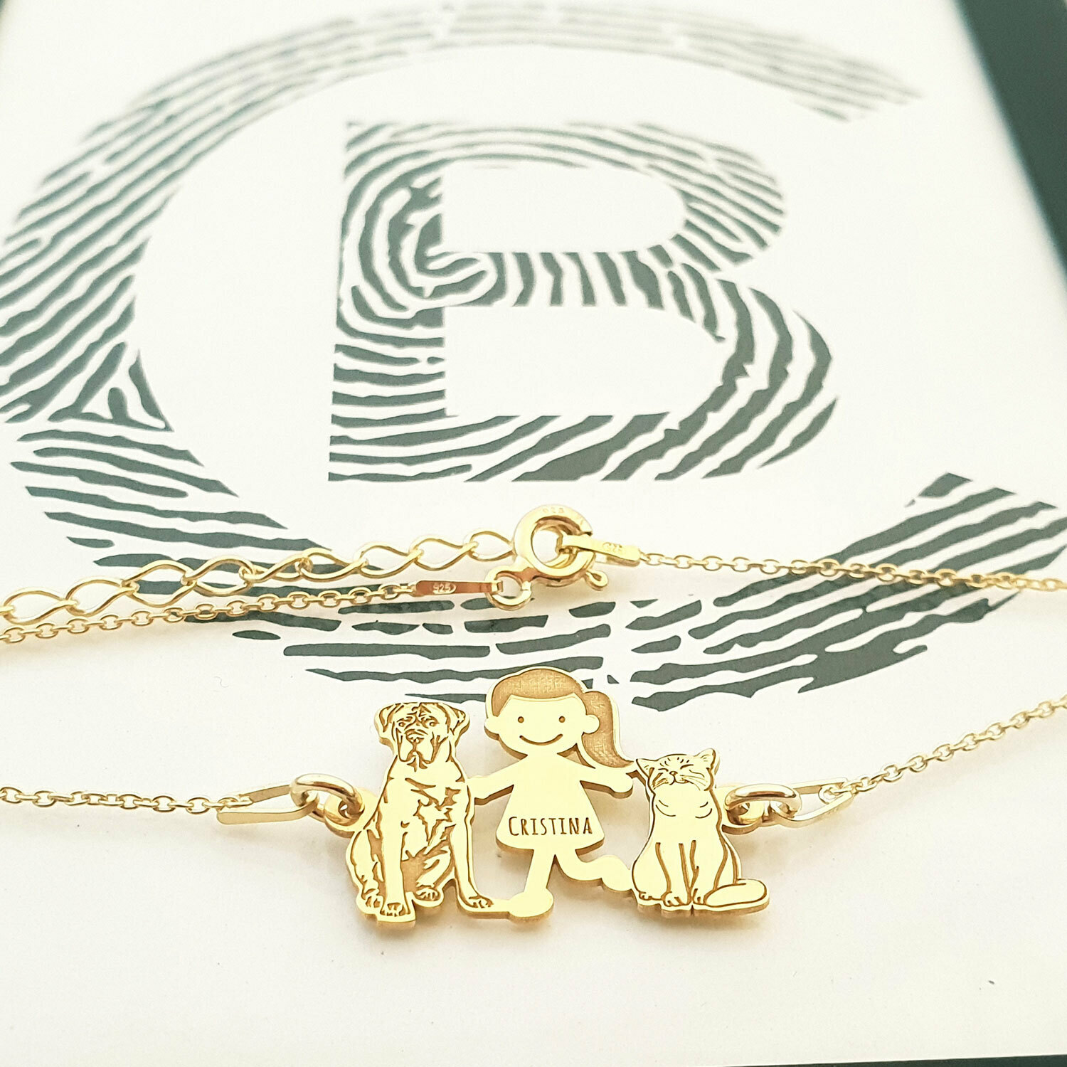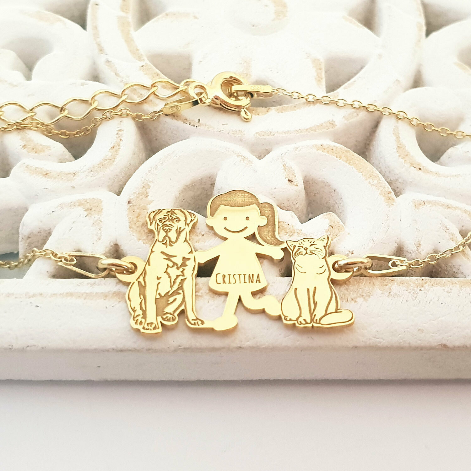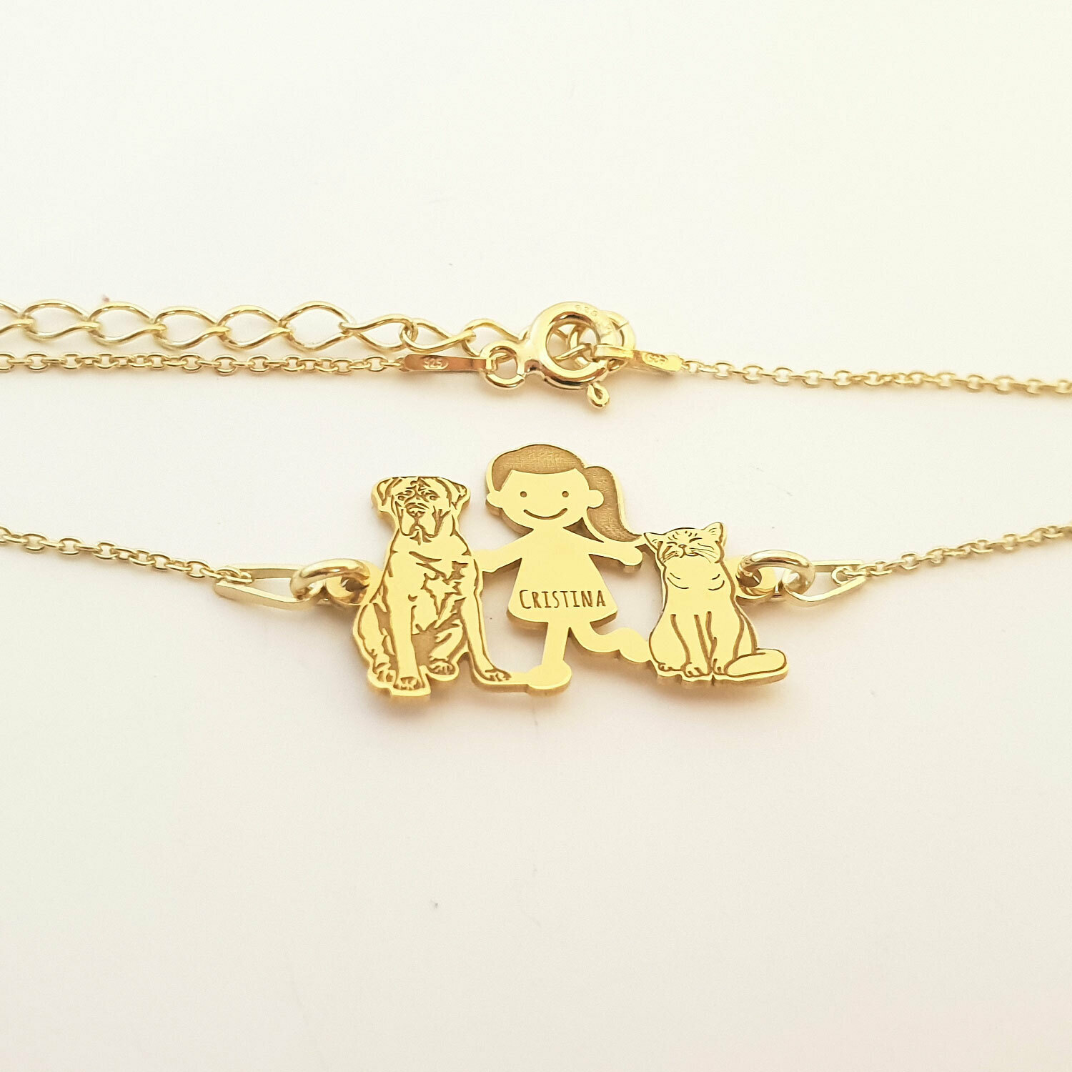 Bratara Familie - 3 Membri - fata cu pisica si caine Cane Corso - Argint 925 placat cu Aur galben 18K, cu lantisor