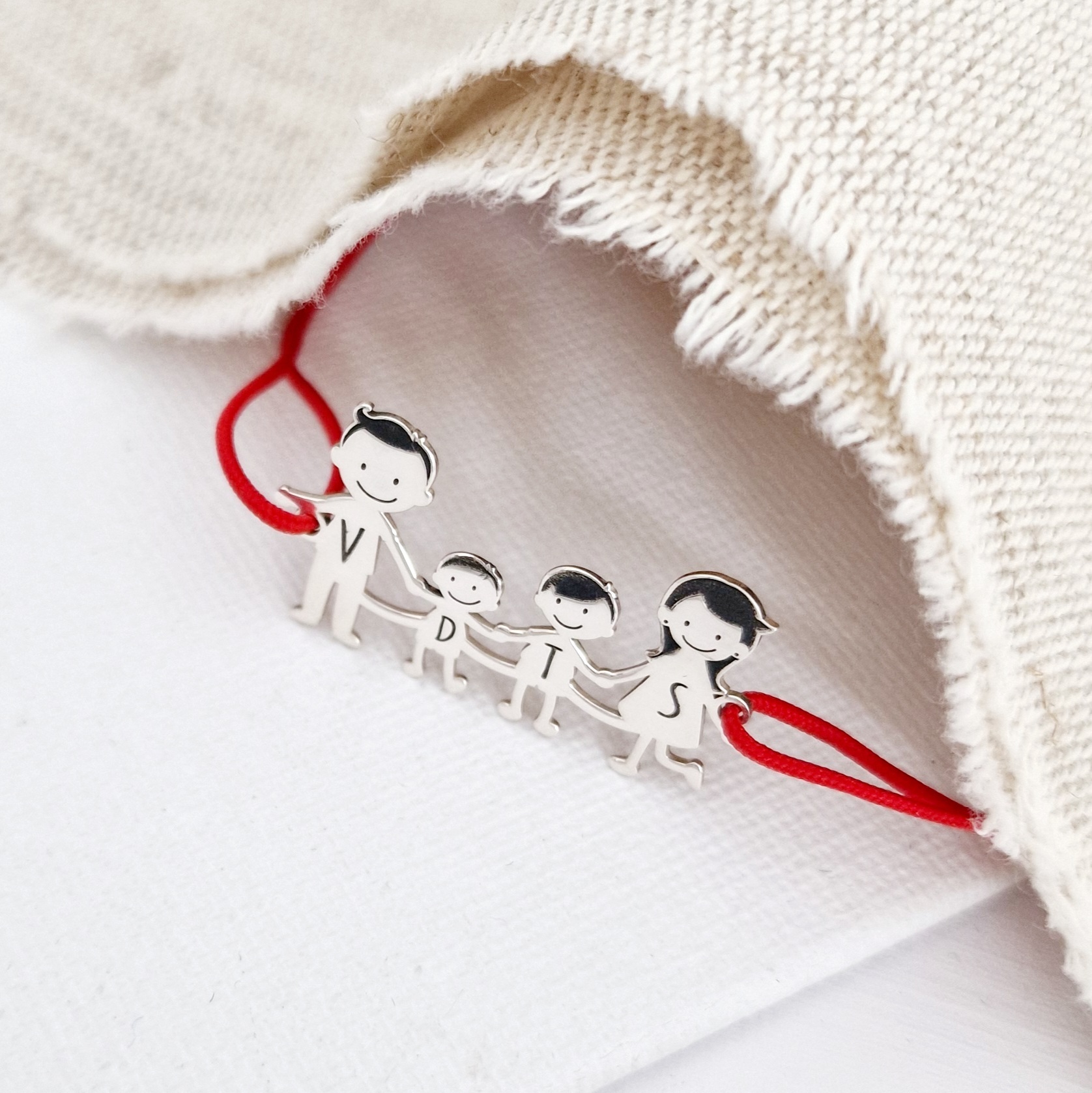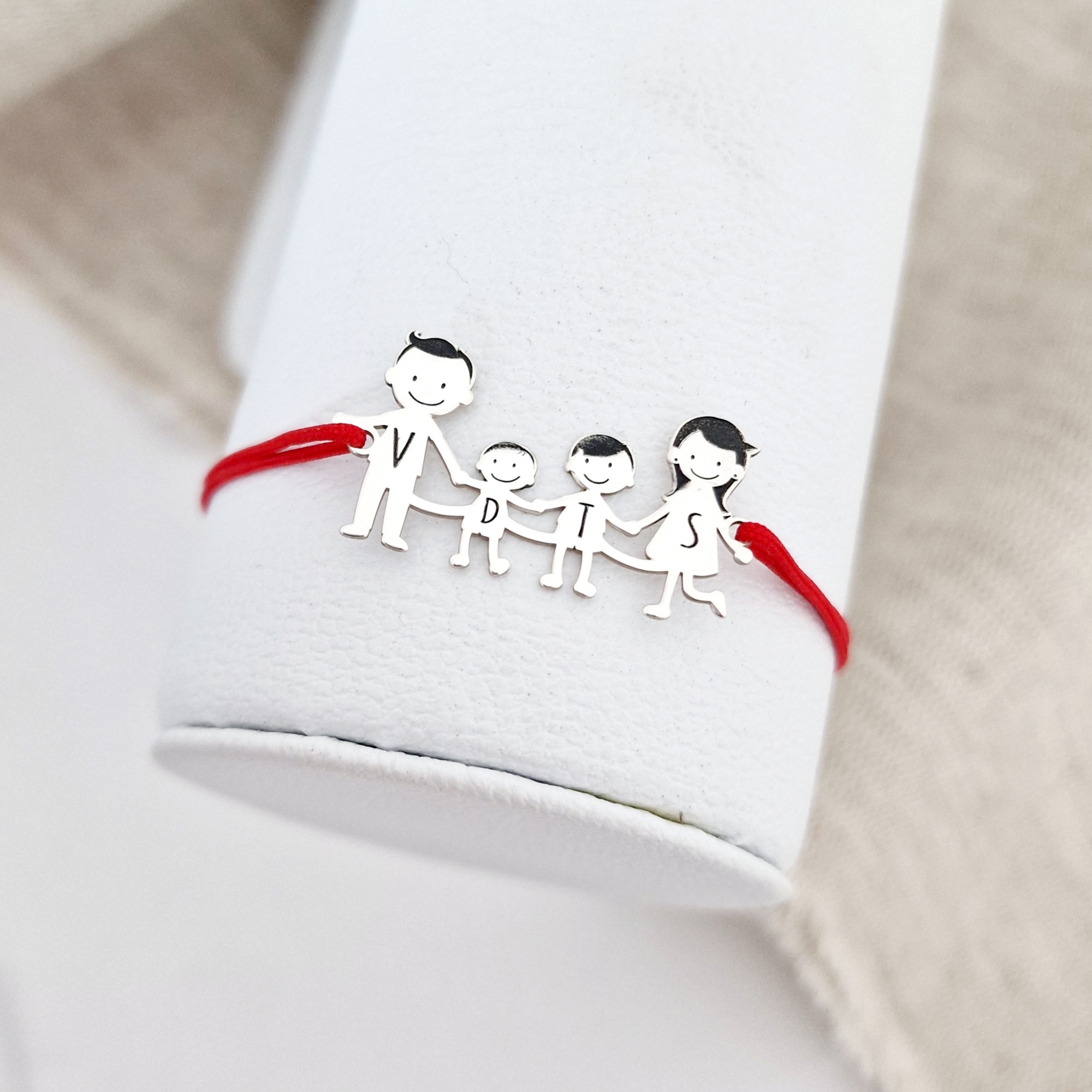 Bratara Familie - 4 Membri - pandant Argint 925 - snur rosu matase vegetala reglabil