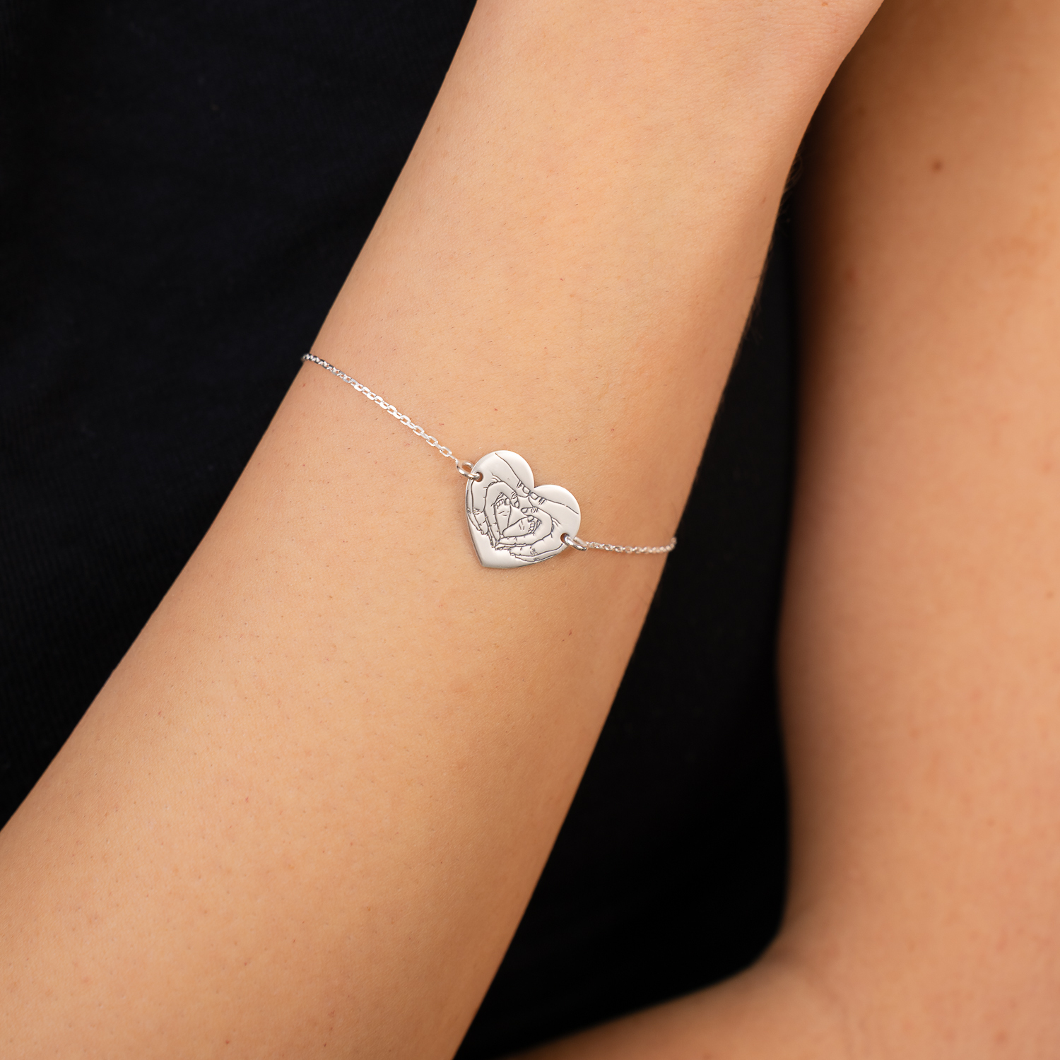 Un cadou personalizat creat din Argint 925, avand diametru: 1,5 cm. Pandantul inima vine atasat de un lantisor din Argint 925 de 15 cm. In total bratara are 16,5 cm, dar are si un lantisor de prelungire de 3 cm si se poate regla.