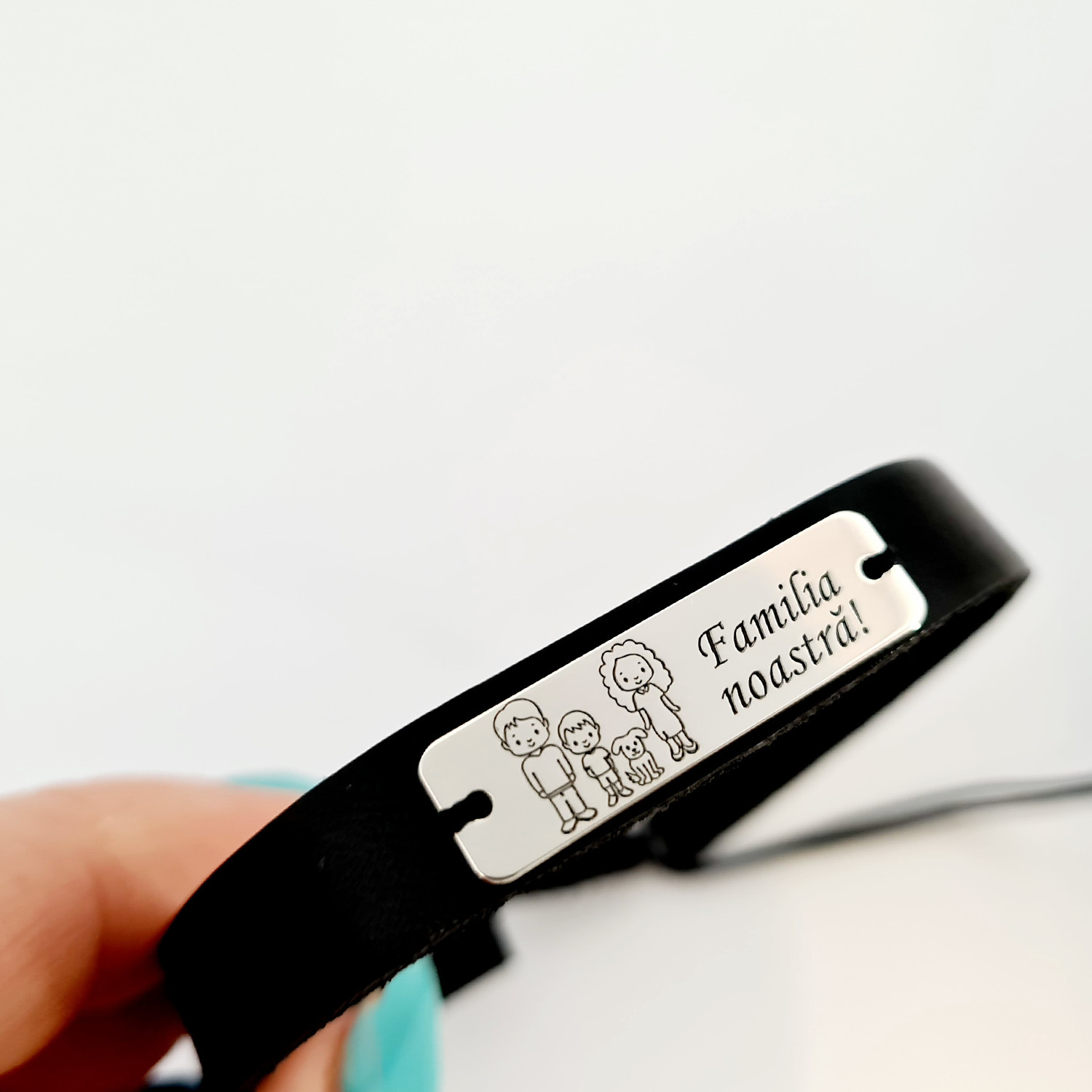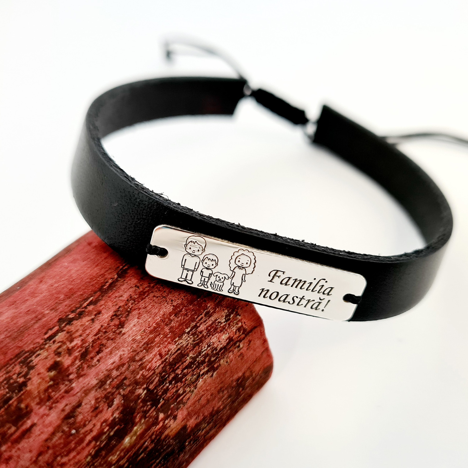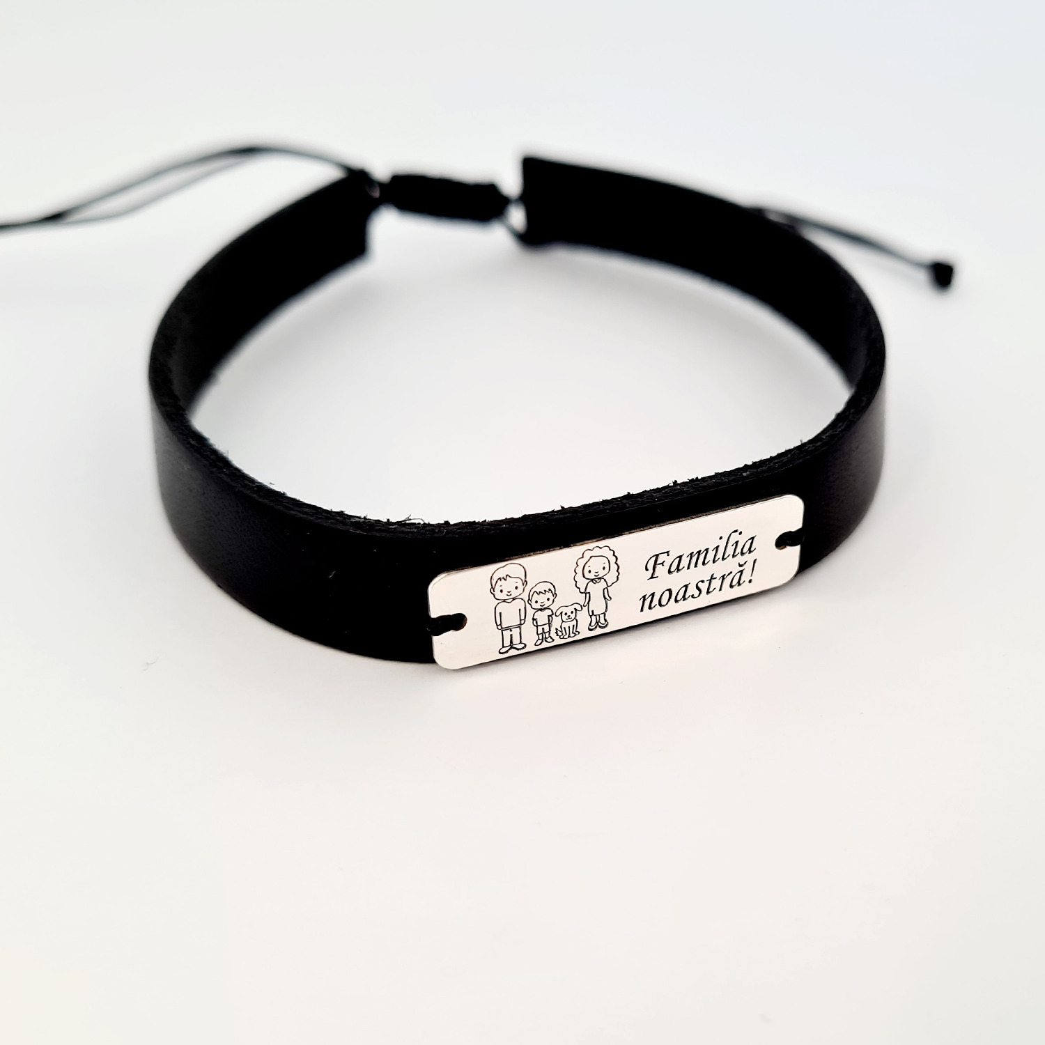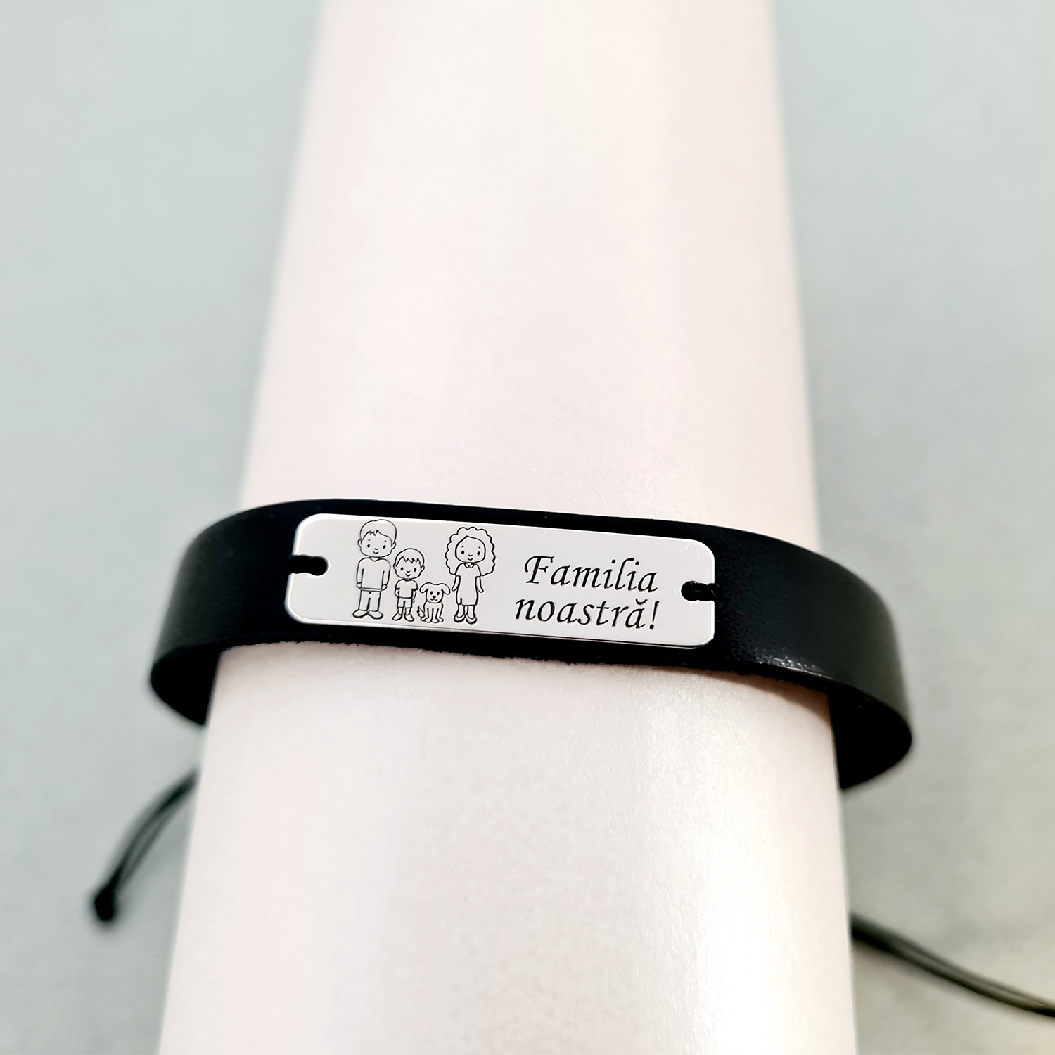 Bratara Placuta gravata cu Membri Familiei si text - 4 membri - Argint 925, piele