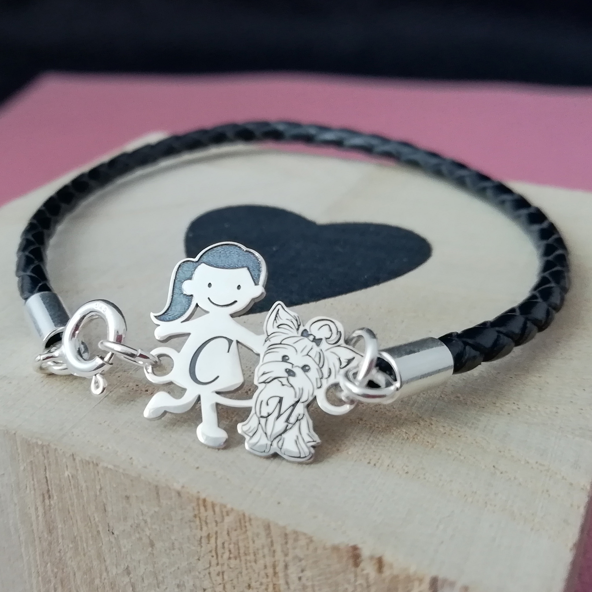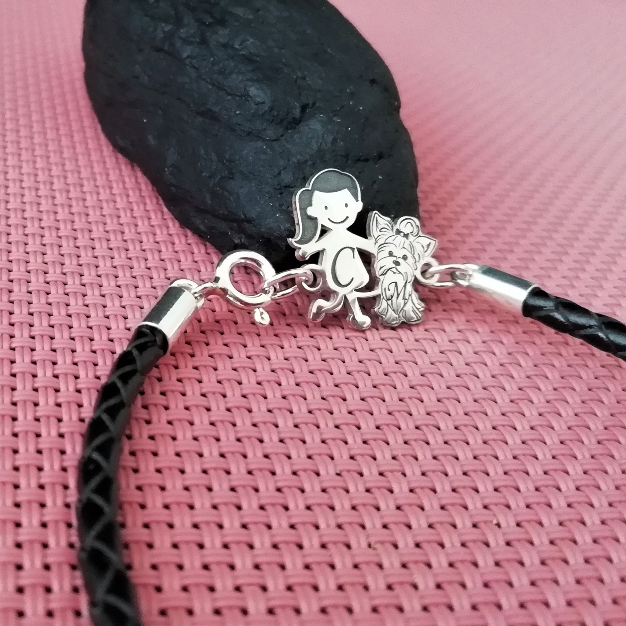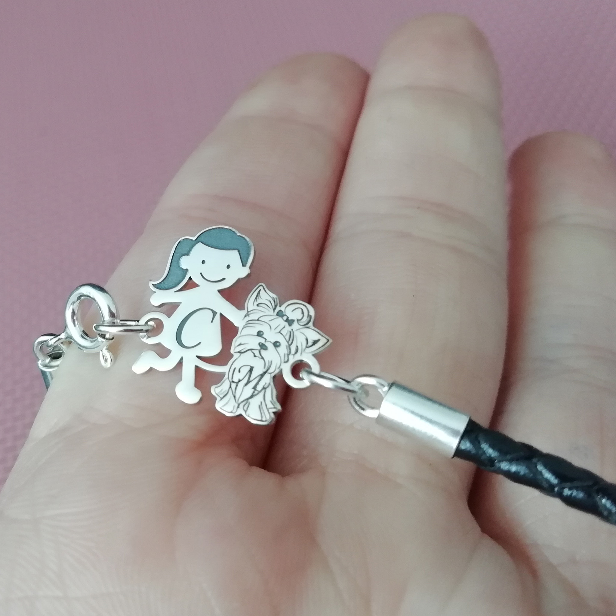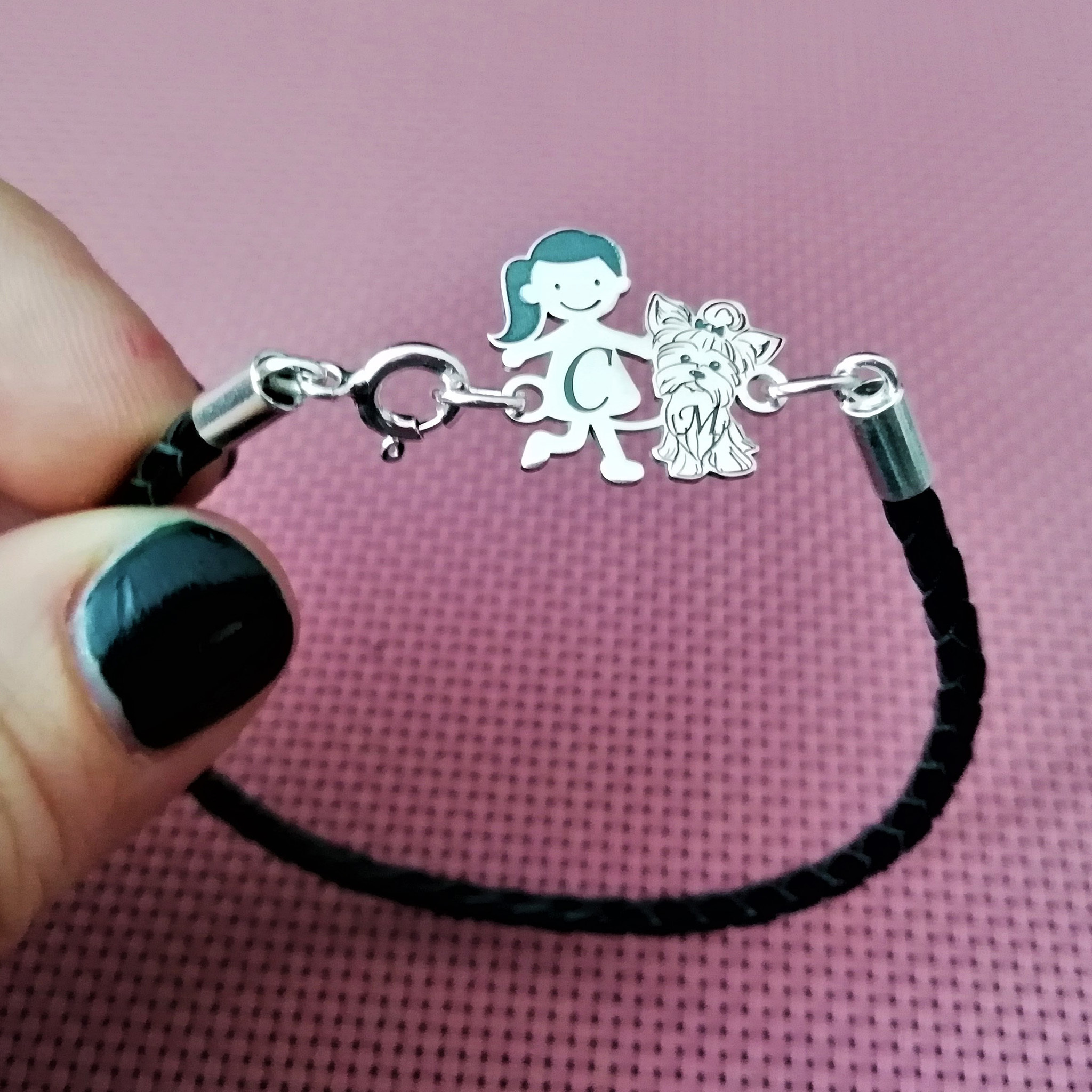 Bratara Unisex cu membri Familiei - fetita si caine Yorkshire - Argint 925 si piele impletita