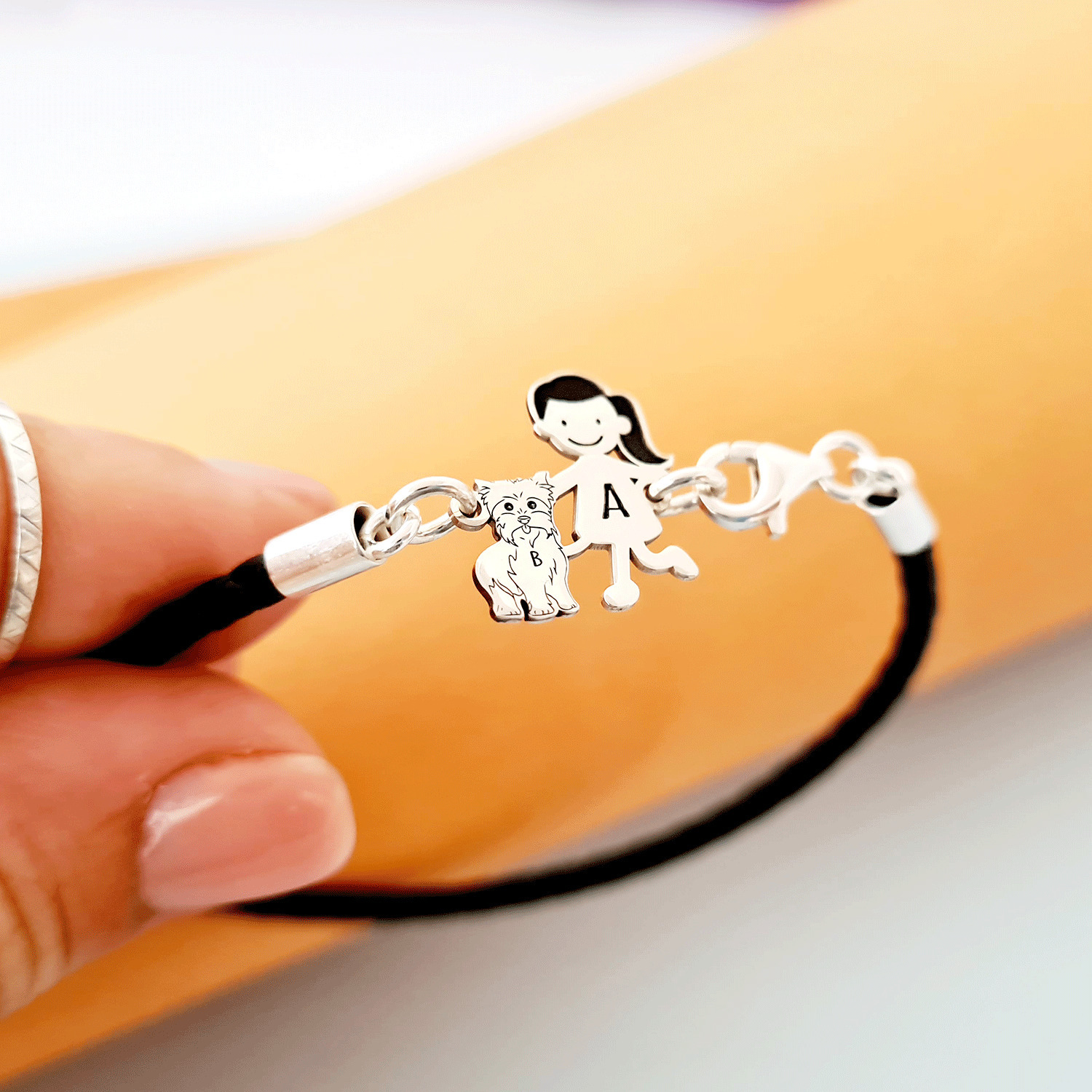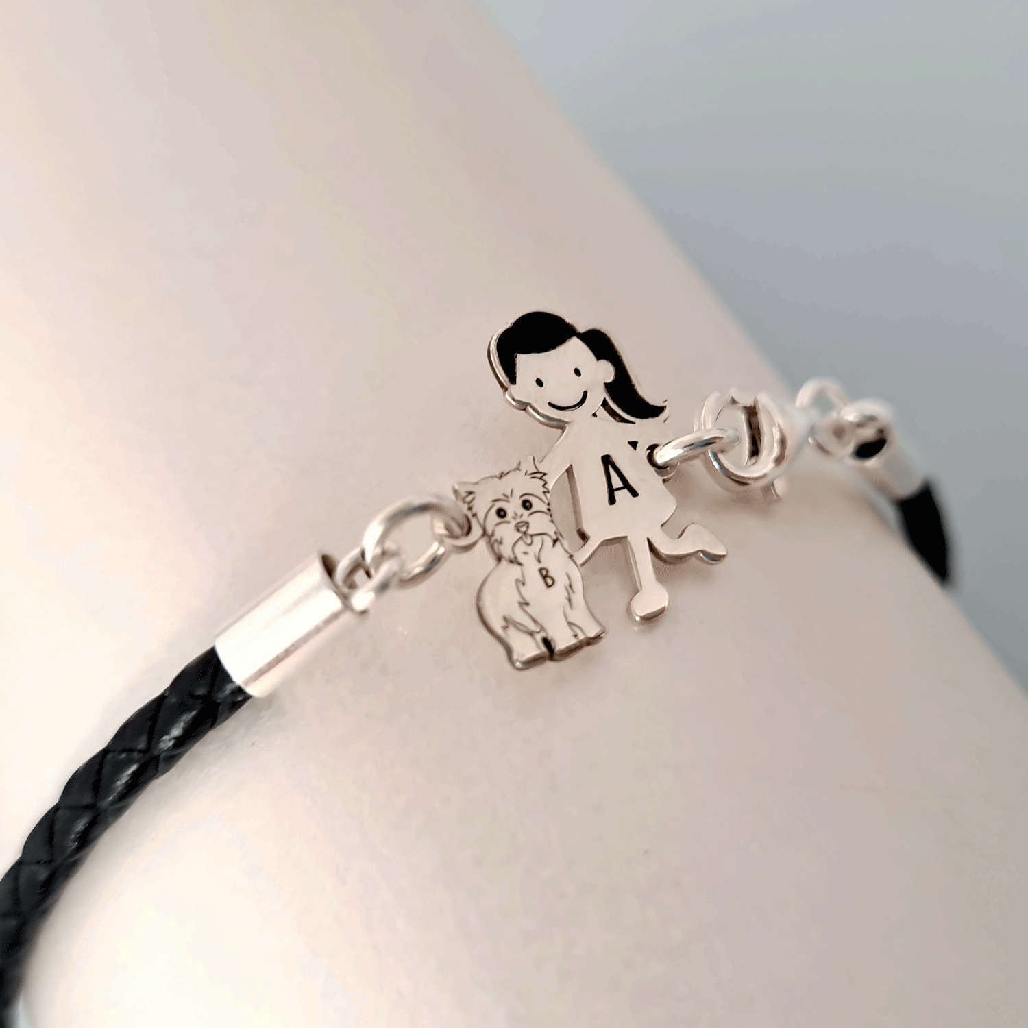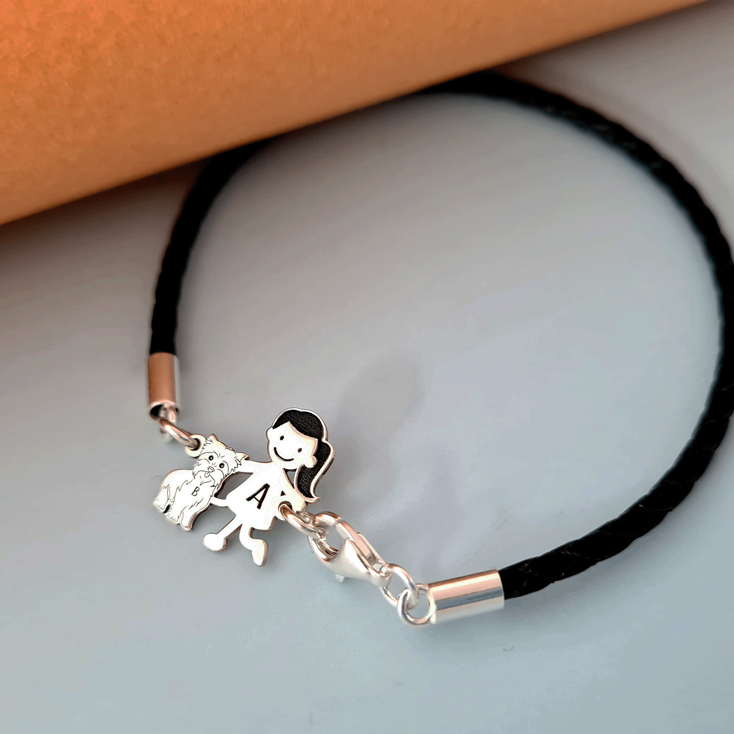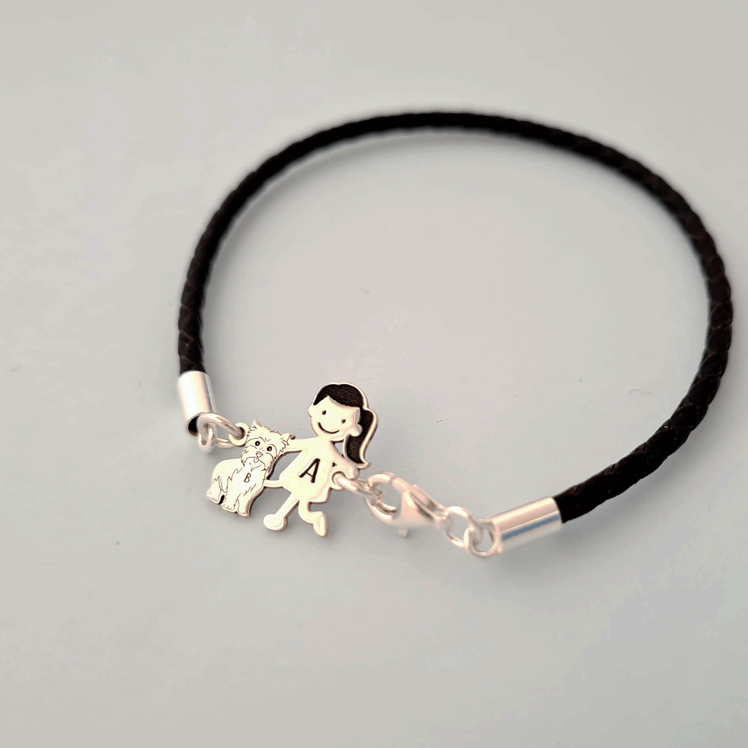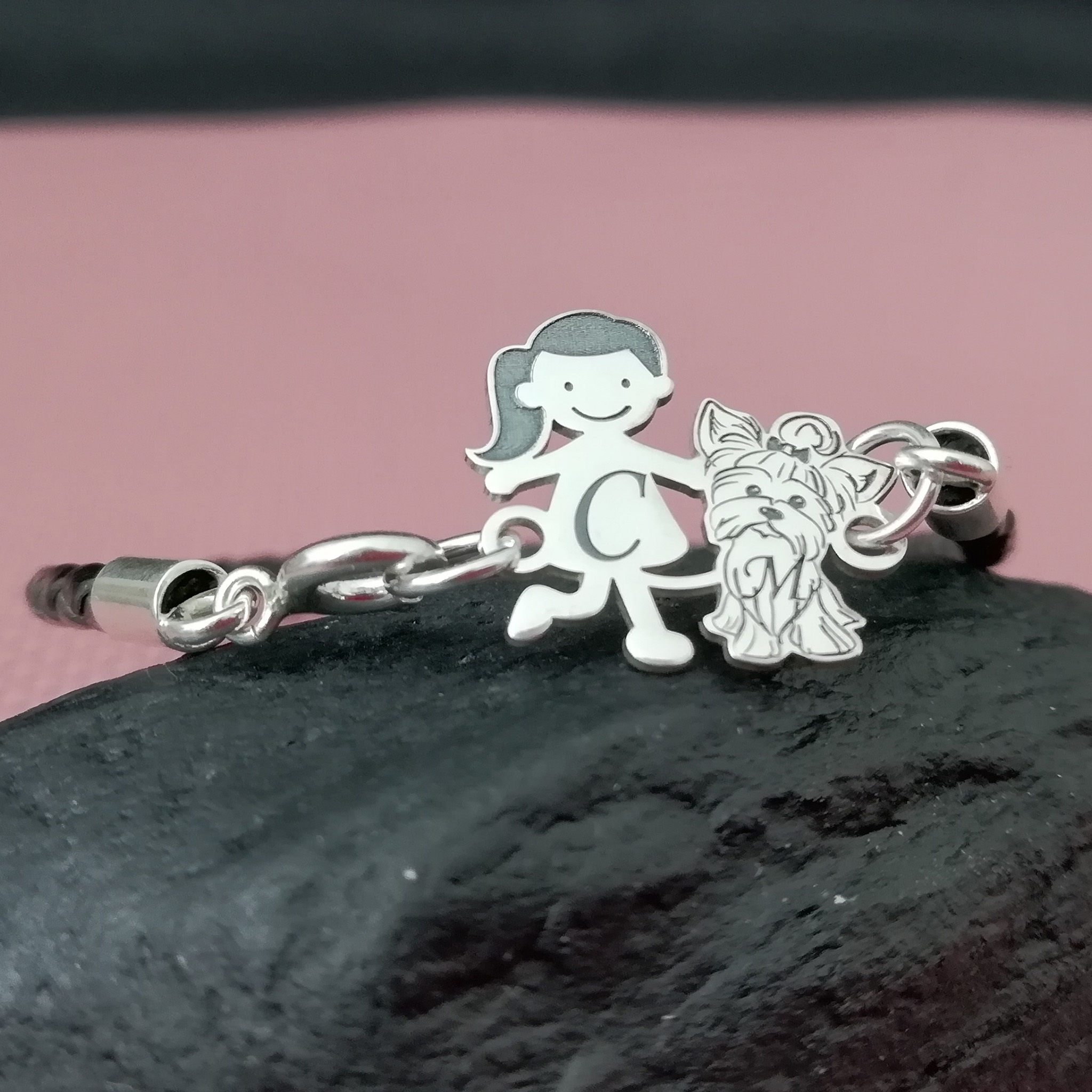 Bratara Unisex cu membri Familiei - fetita si caine Yorkshire - Argint 925 si piele impletita