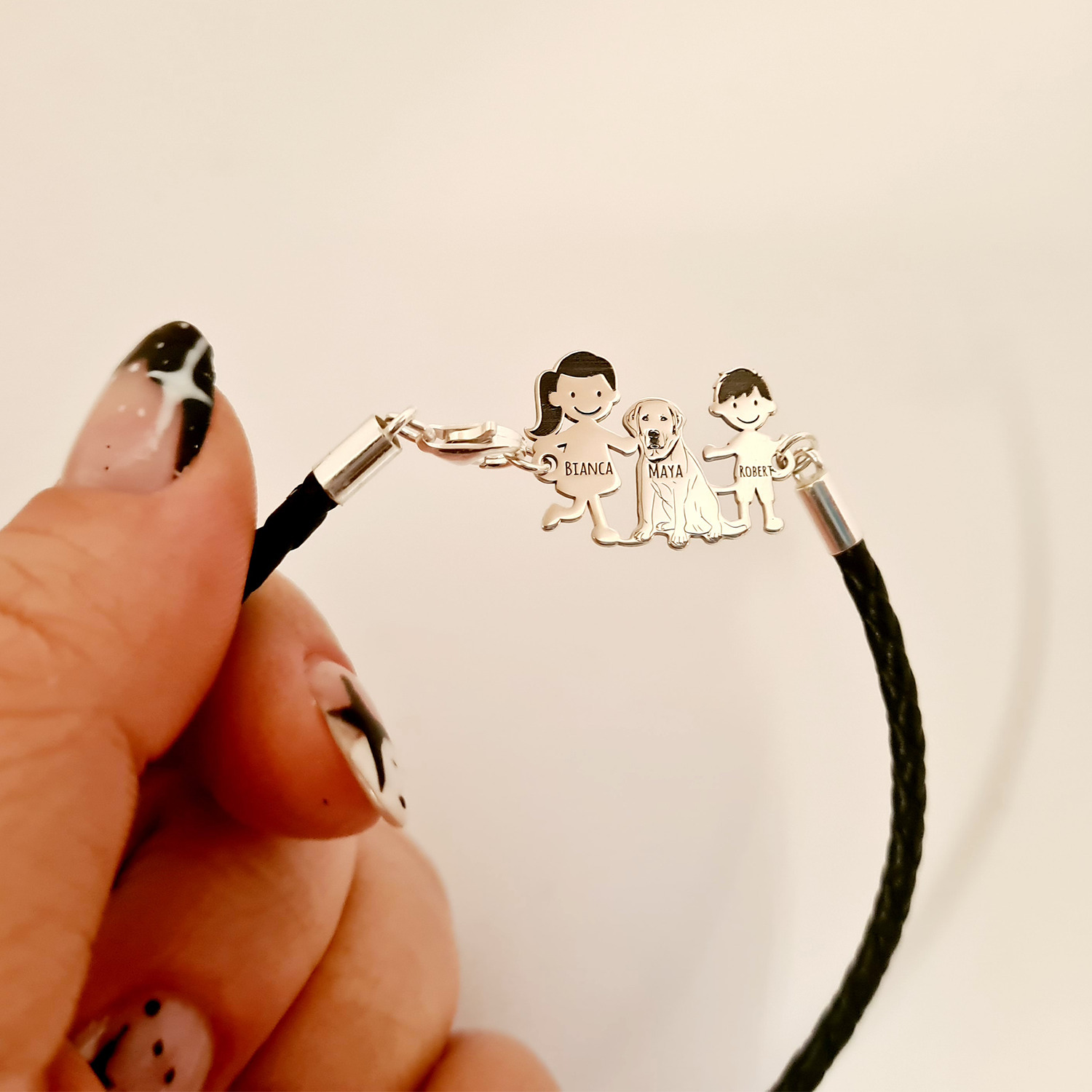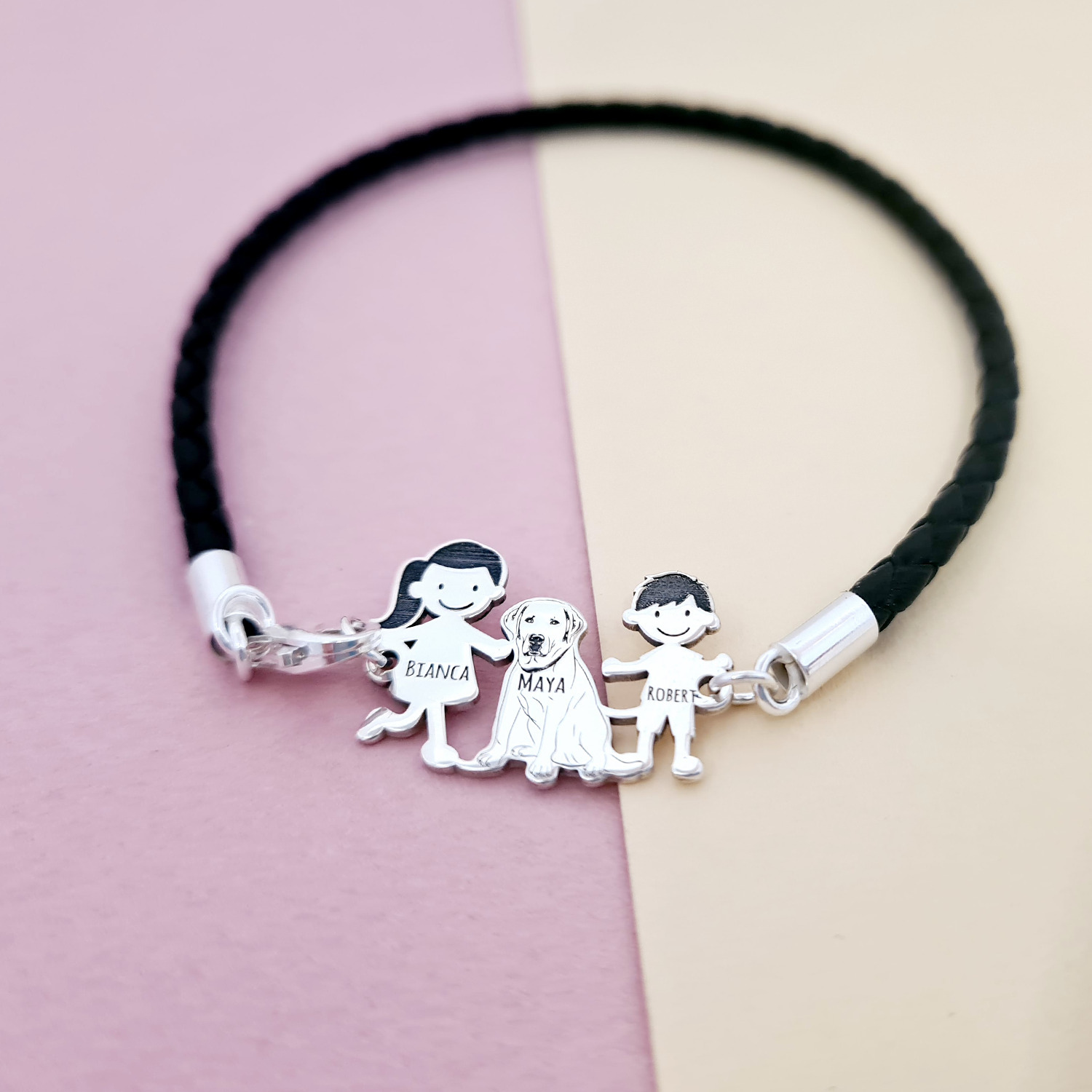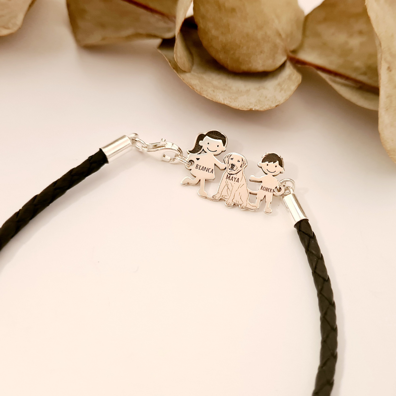 - Pandantul familie este creat din Argint 925 si este prins de o bratara impletita din piele.