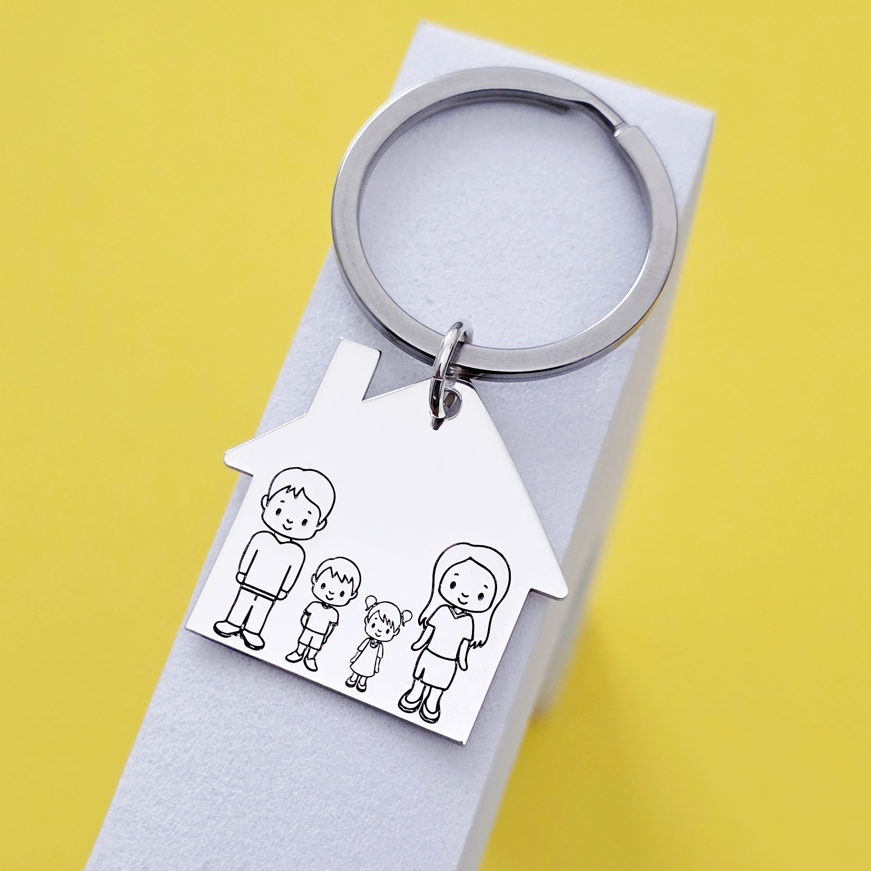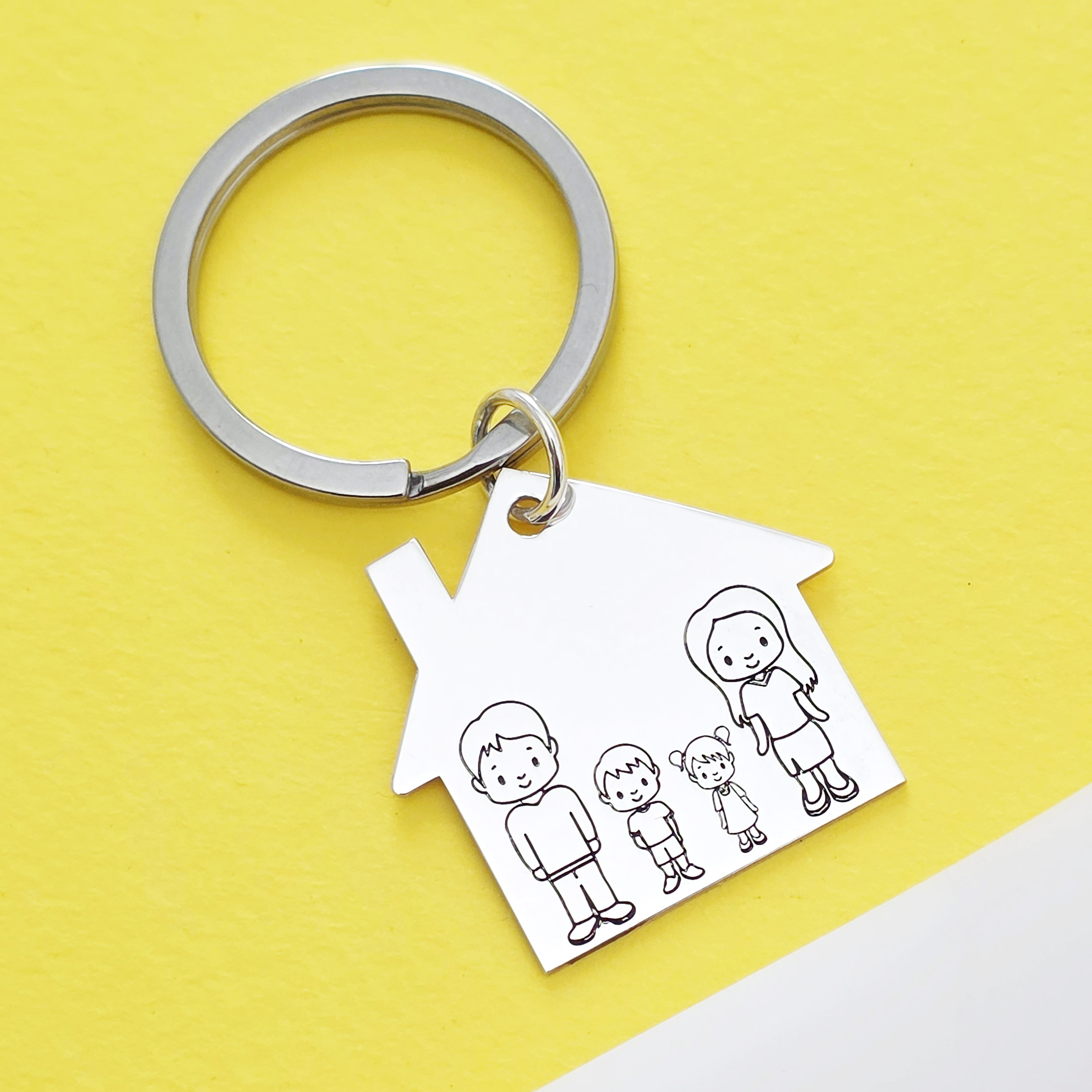 Casuta cu membri familiei gravati este din Argint 925 si vine atasata de un inel de breloc din otel inoxidabil.