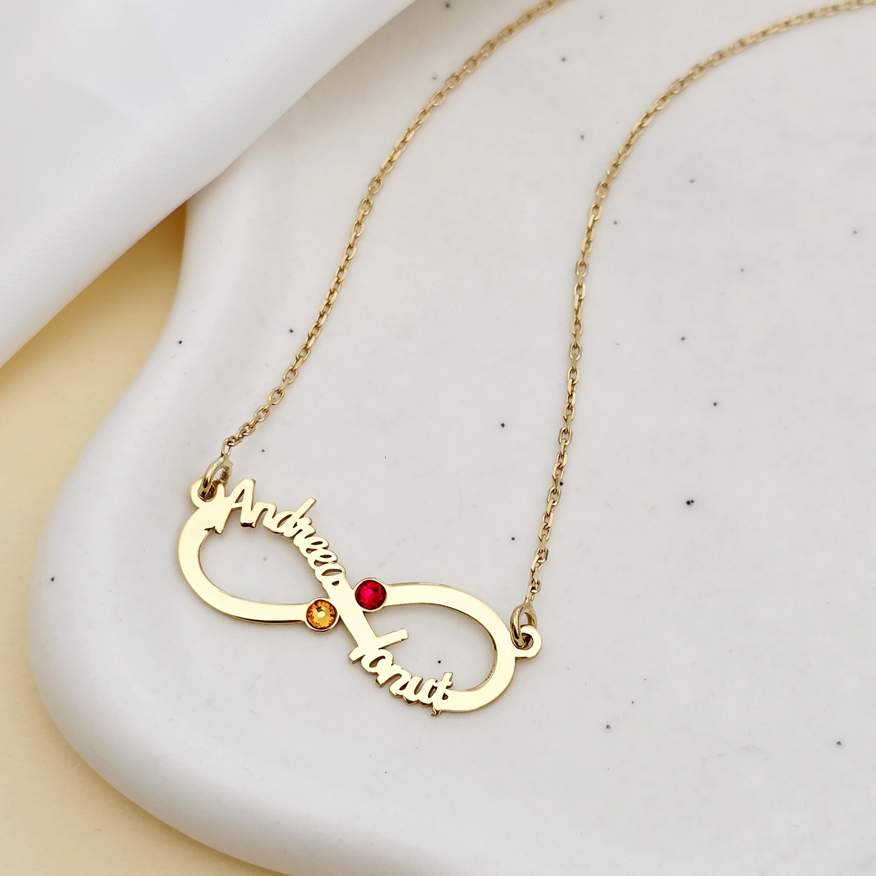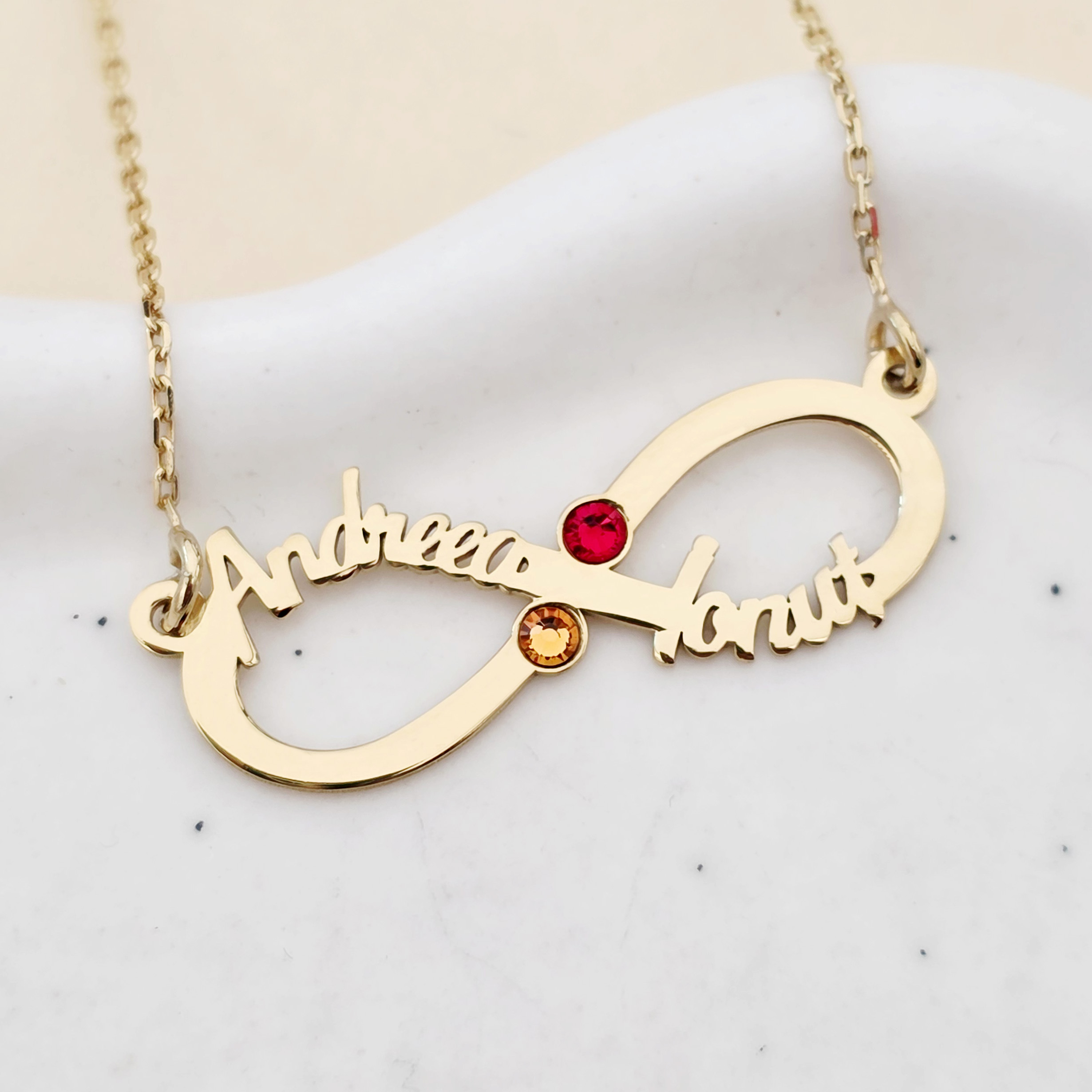 Lantisor Etern - Infint cu 2 nume decupate si cristale Swarovski - Argint 925 placat cu Aur Galben 18K
