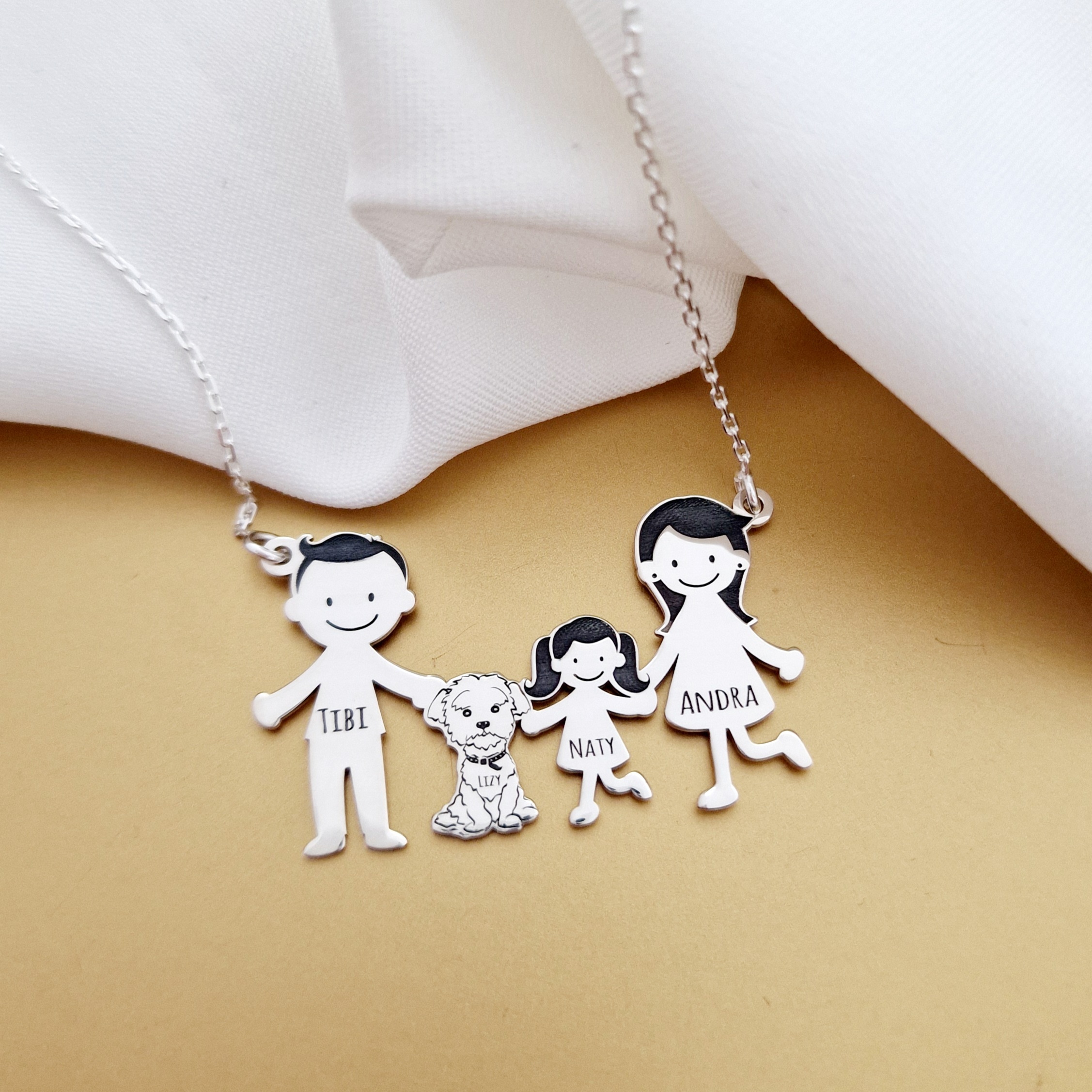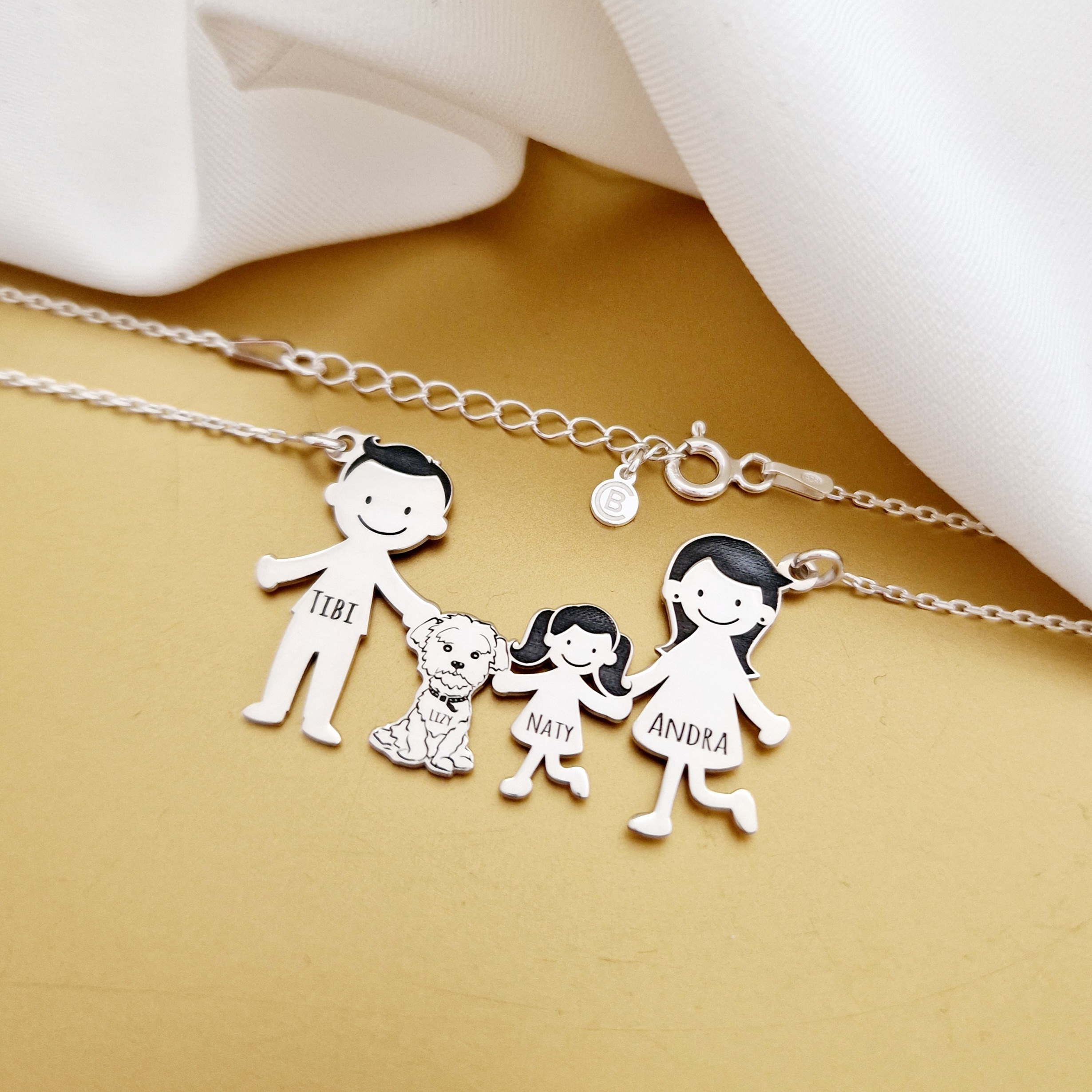 1. Pandantiv Parinti + 1 copil + caine2. Pandantiv Parinti + 2 copii + caine3. Pandantiv doar cu copii + caine4. Pandantiv doar parinti(cuplu) + caine*dar si alte variante in functie de ceea ce va doriti.**pretul difera in functie de numarul de membrii.Gramaj aproximativ ARGINT 925: 4.65 grame