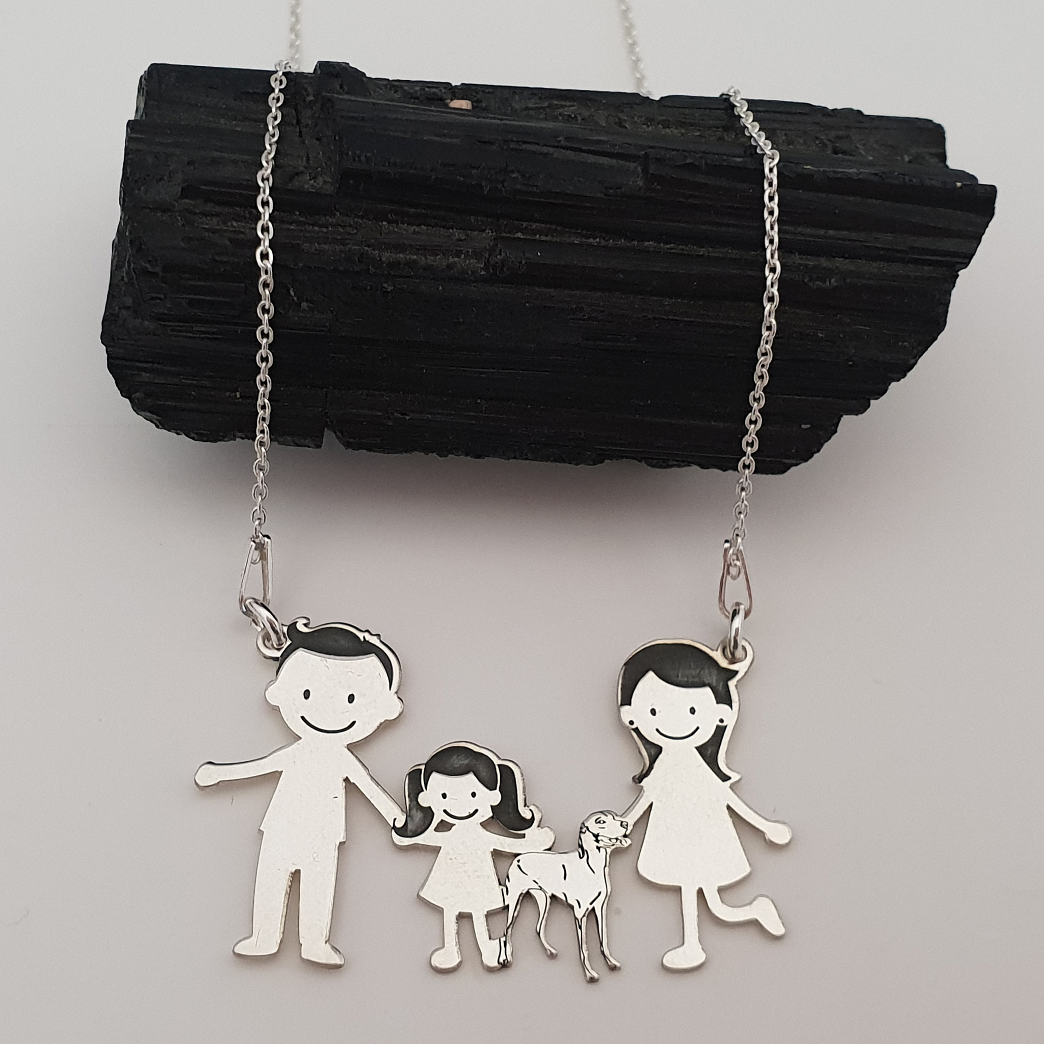 1. Pandantiv Parinti + 1 copil + caine2. Pandantiv Parinti + 2 copii + caine3. Pandantiv doar cu copii + caine4. Pandantiv doar parinti(cuplu) + caine*dar si alte variante in functie de ceea ce va doriti.**pretul difera in functie de numarul de membrii.Gramaj aproximativ ARGINT 925: 4.49 grame