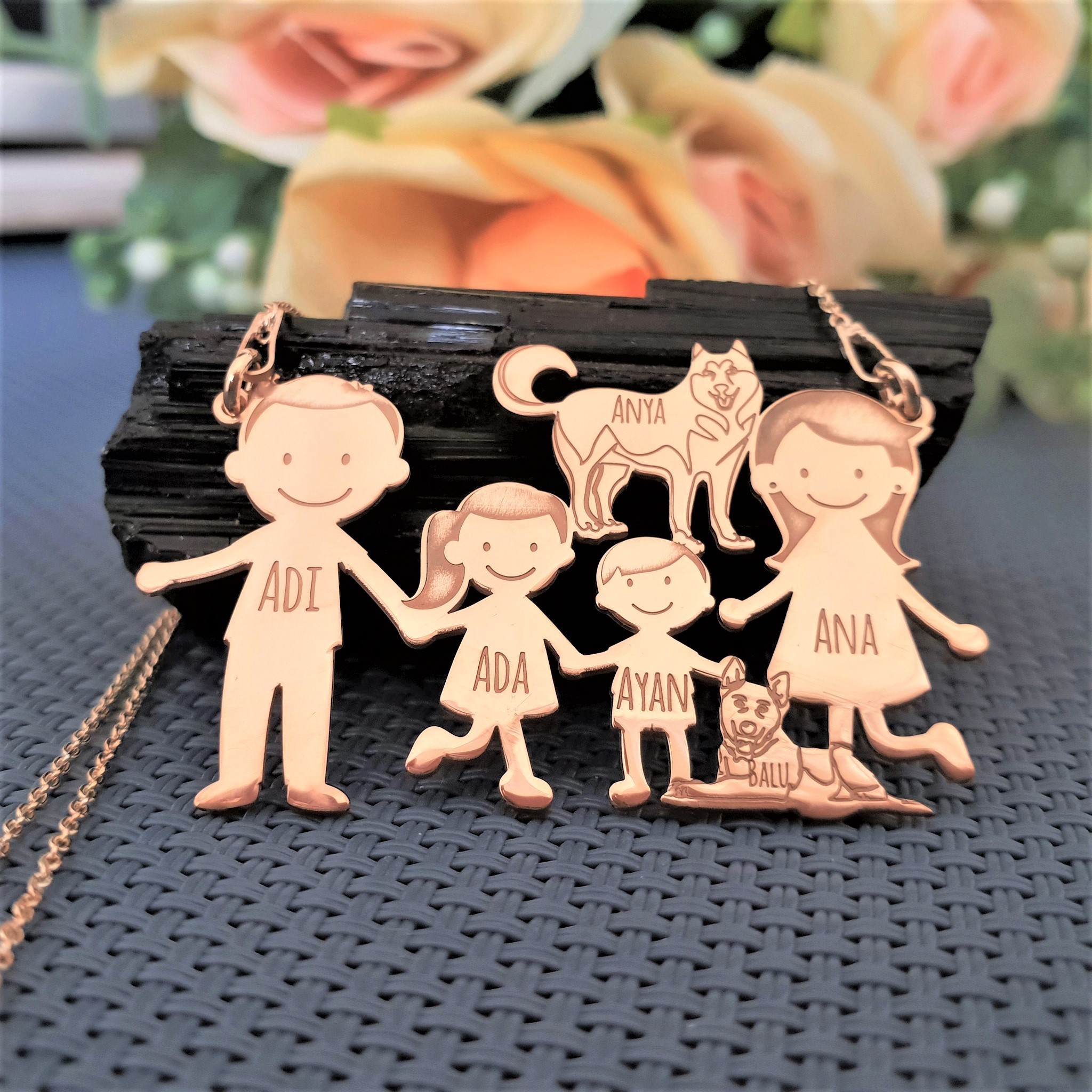 1. Pandantiv Parinti + 1 copil + caine2. Pandantiv Parinti + 2 copii + caine3. Pandantiv doar cu copii + caine4. Pandantiv doar parinti(cuplu) + caine*dar si alte variante in functie de ceea ce va doriti.**pretul difera in functie de numarul de membrii.Cainele se uita la tine ca si la un membru al haitei lui, un membru al familiei!
