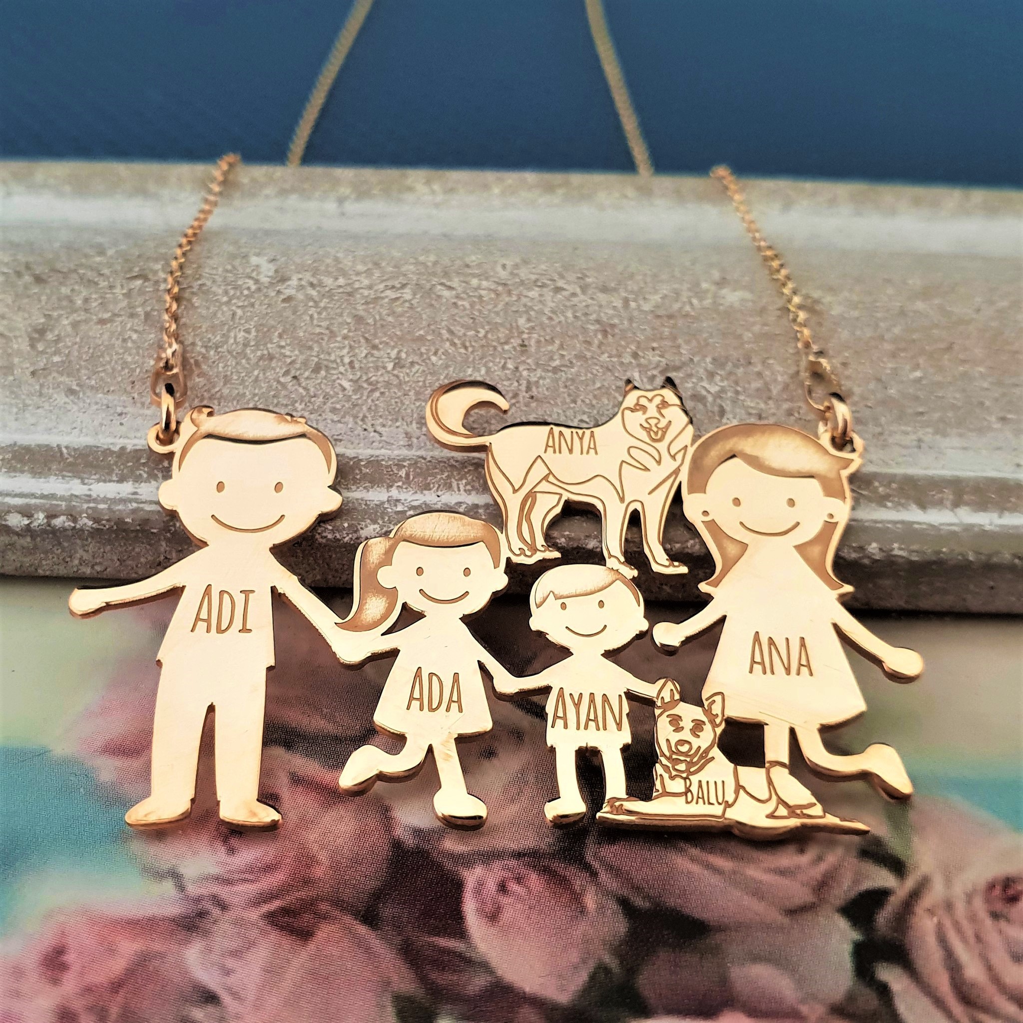 Lantisor Familie - 6 Membri cu 2 Husky - Argint 925 placat cu Aur 18K