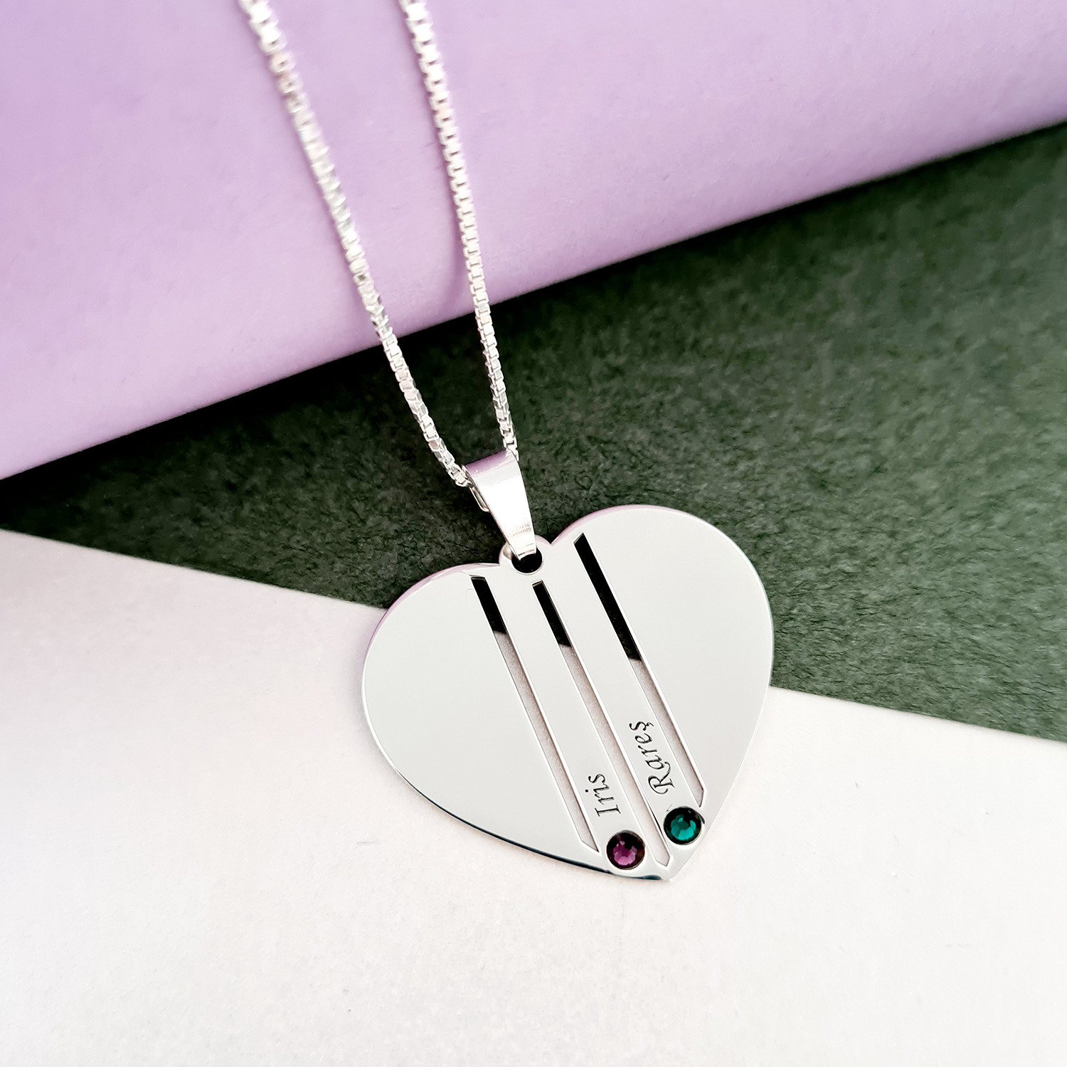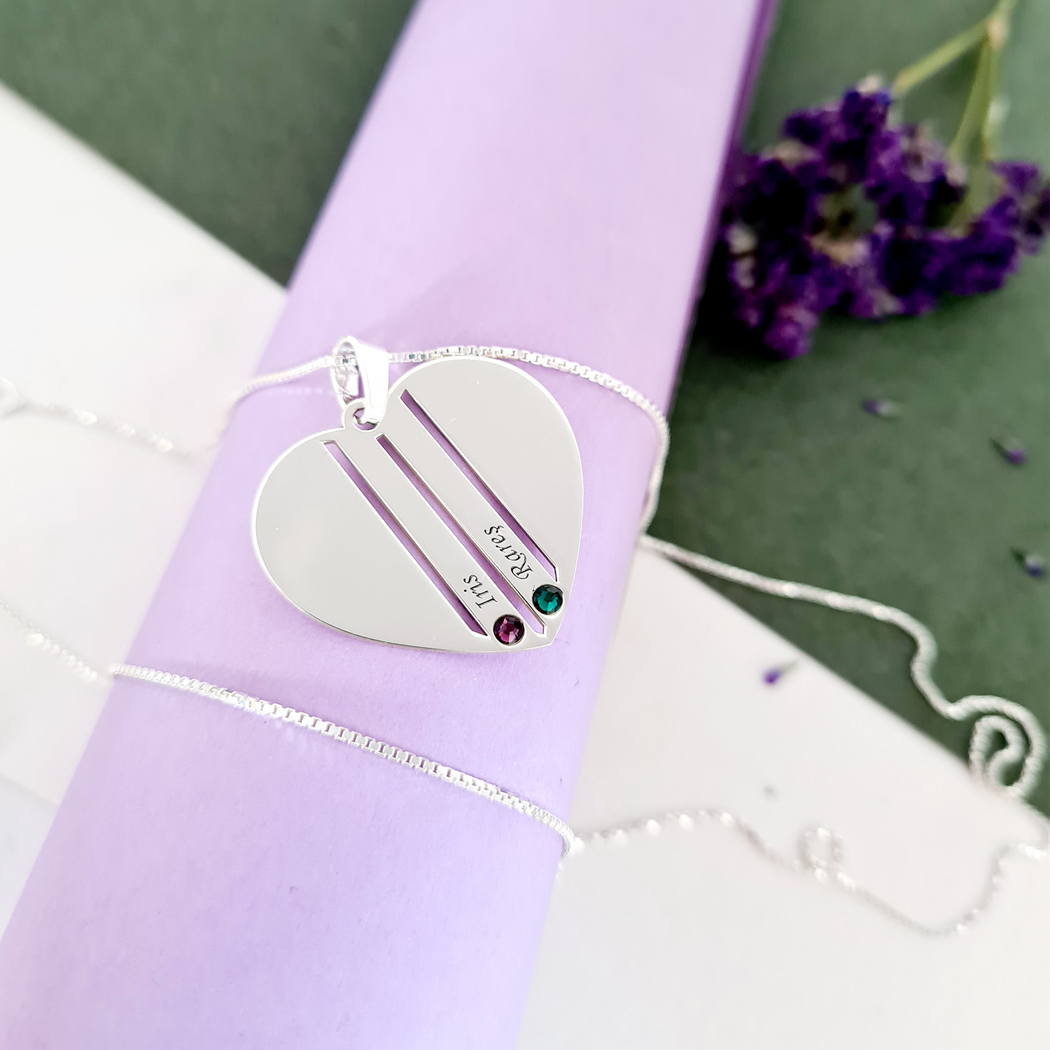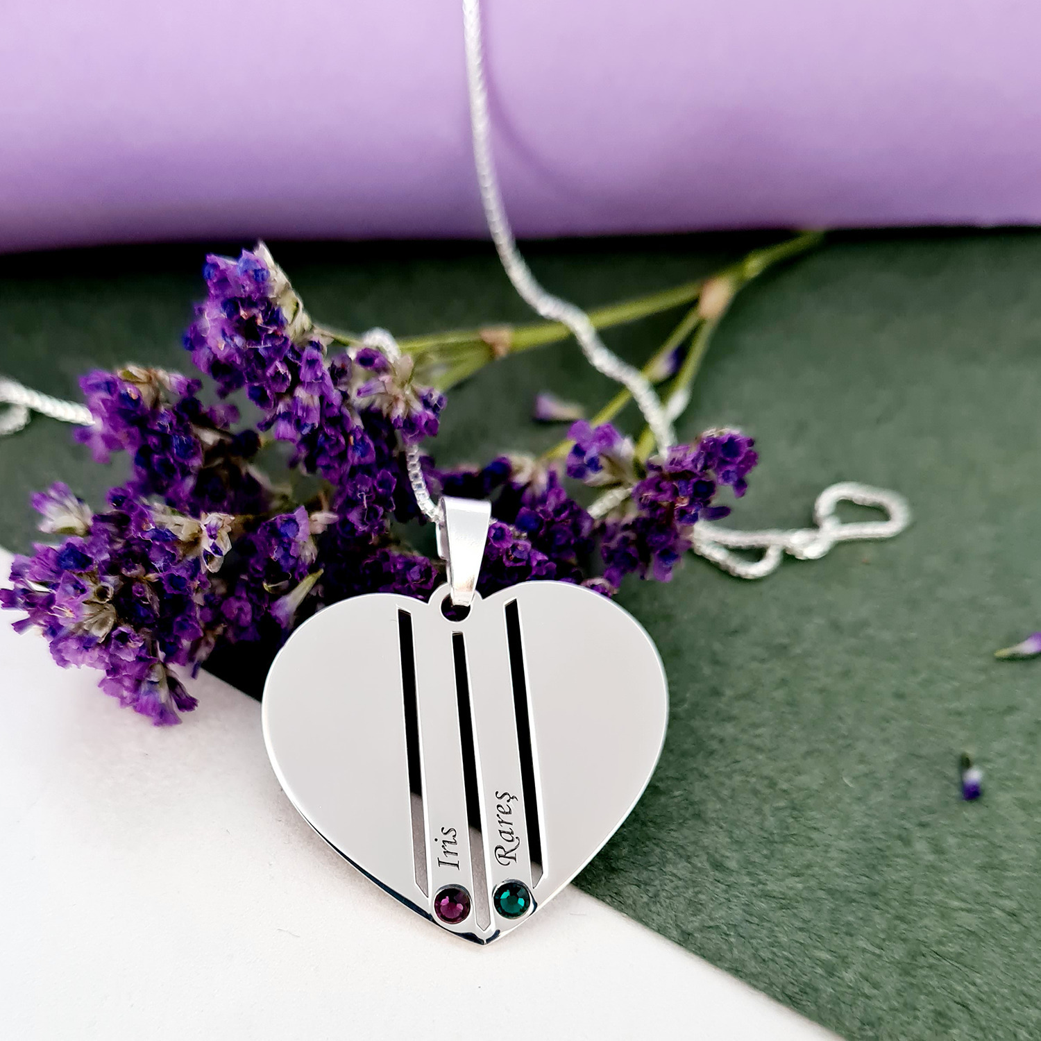Lantisor Inima familiei - 2 nume si cristale Swarovski - Argint 925