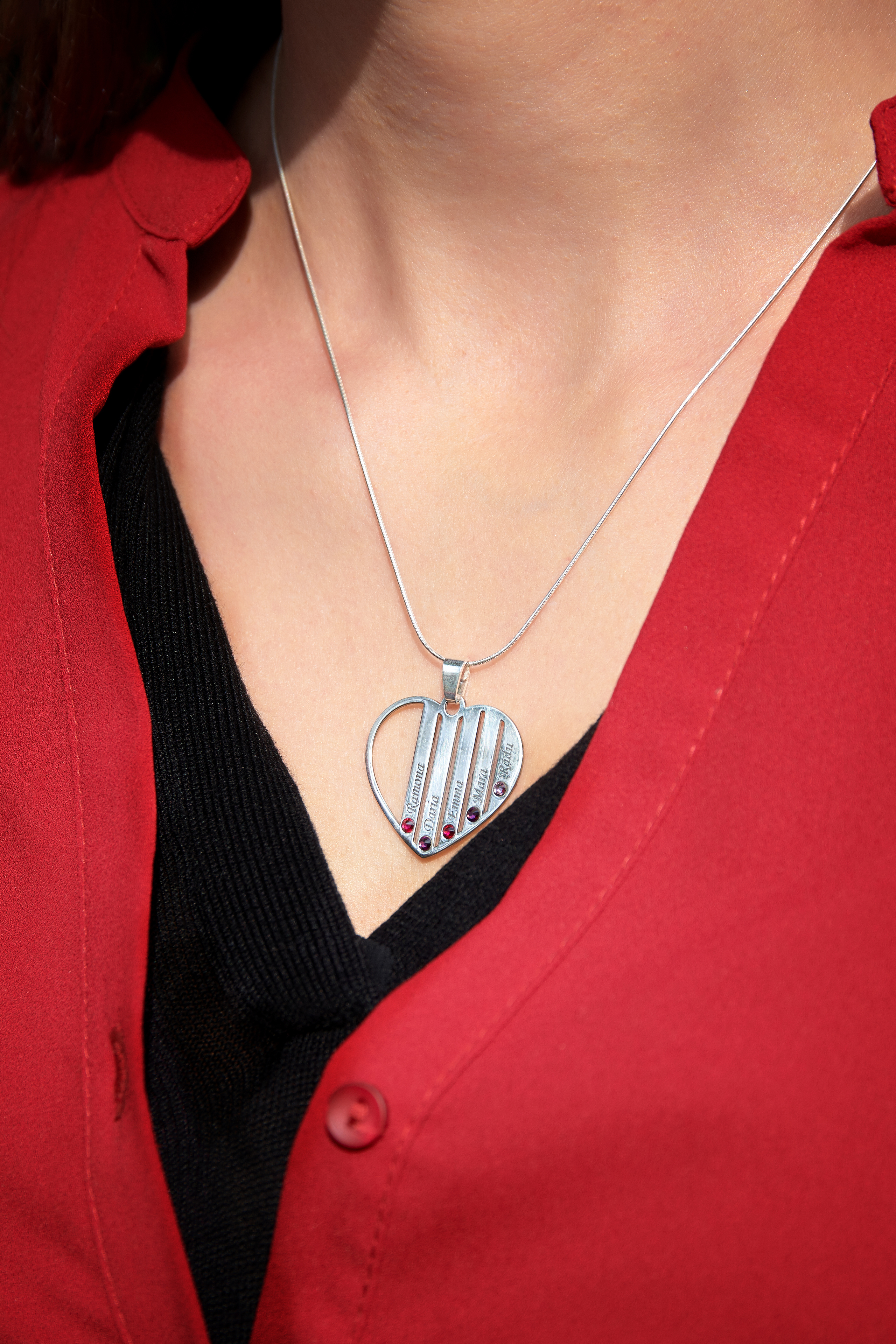 Lantisorul Familie in forma de inima poate fi personalizata cu pana la 7 membri ai familiei tale, pe pandantiv fiind gravate numele acestora si atasate cristale Swarovski in functie de luna nasterii fiecaruia.