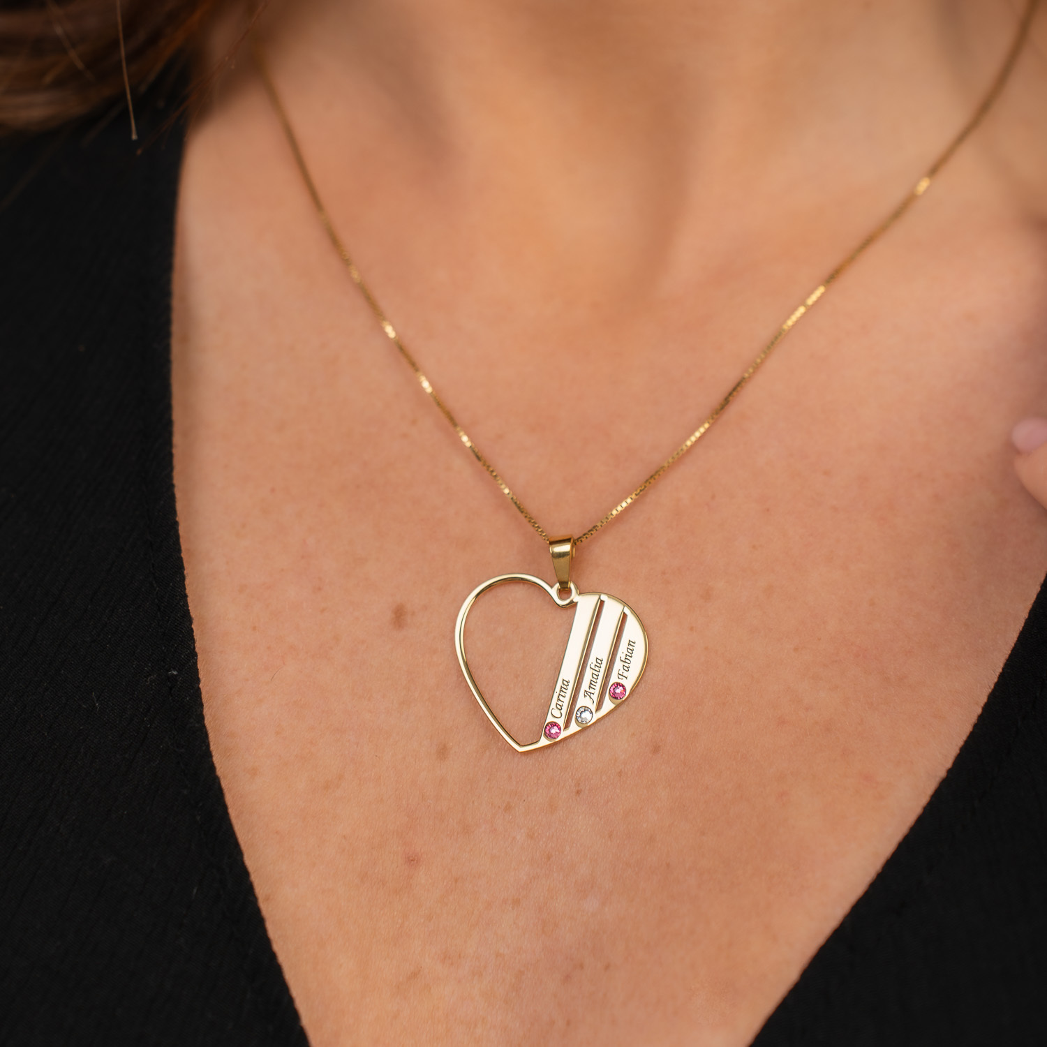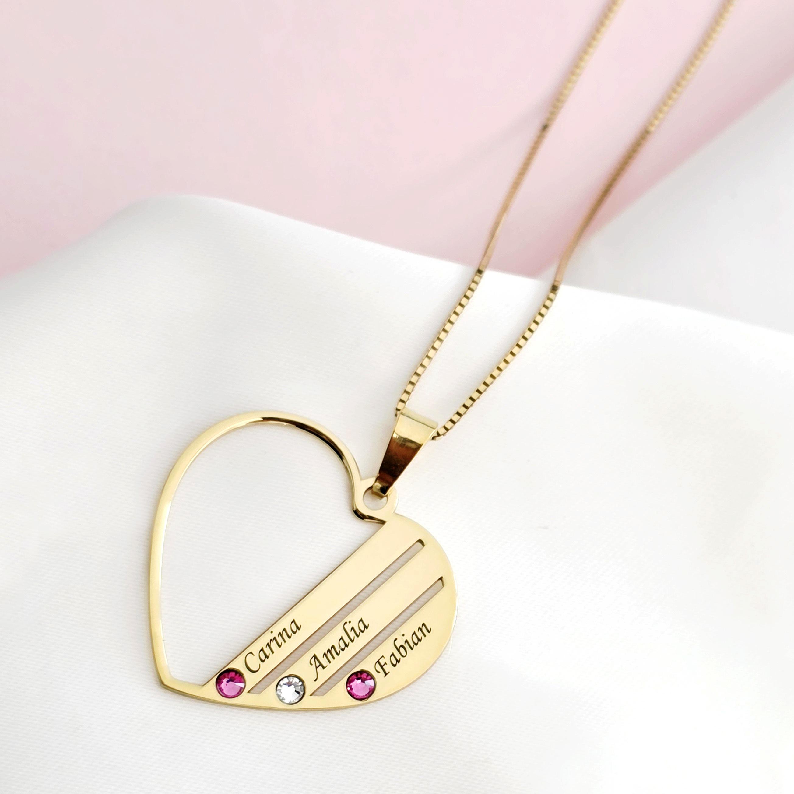 Lantisor Inima familiei - 3 nume si cristale Swarovski - Argint 925 placat cu Aur 18K