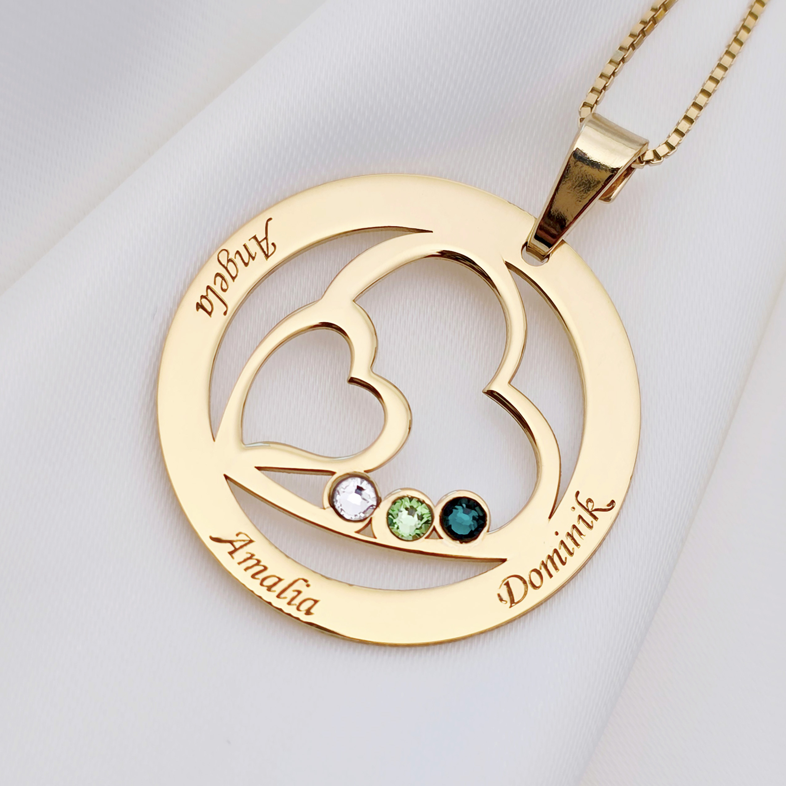 Lantisor Familie unita - Inimi in disc - 3 nume si cristale Swarovski - Argint 925 placat cu Aur Galben 18K