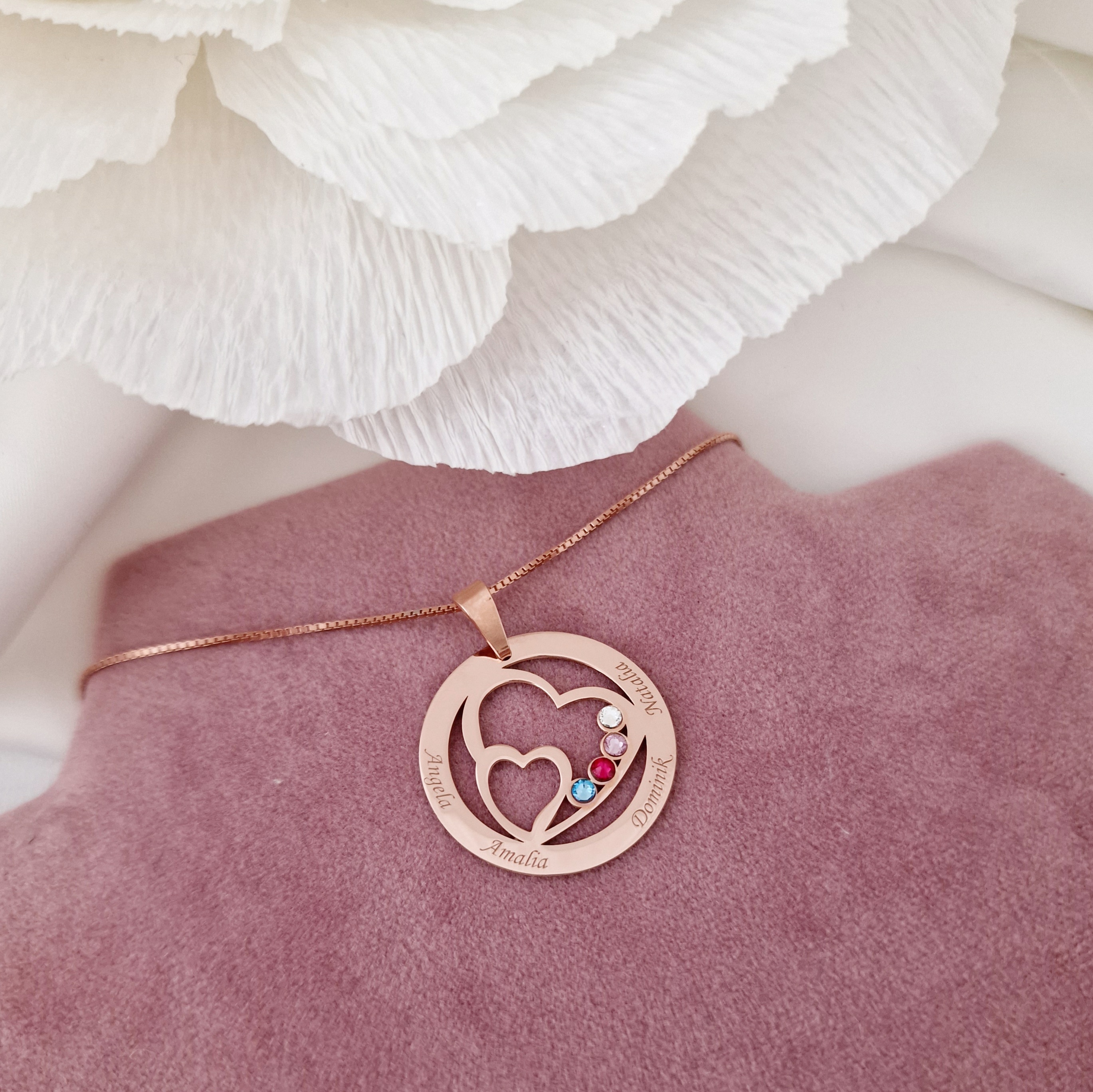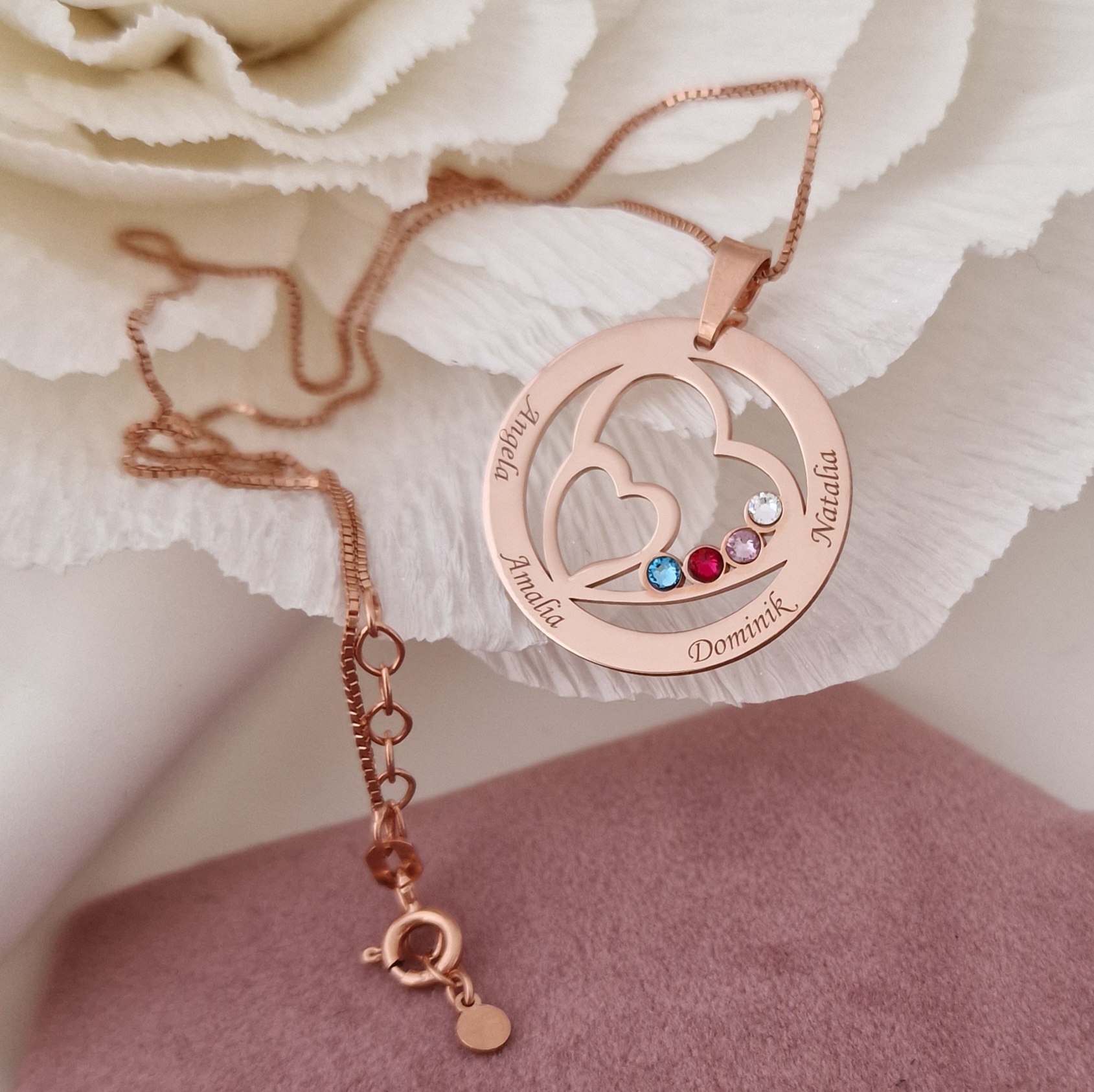 Lantisor Familie unita - Inimi in disc - 4 nume si cristale Swarovski - Argint 925 placat cu Aur Roz 18K