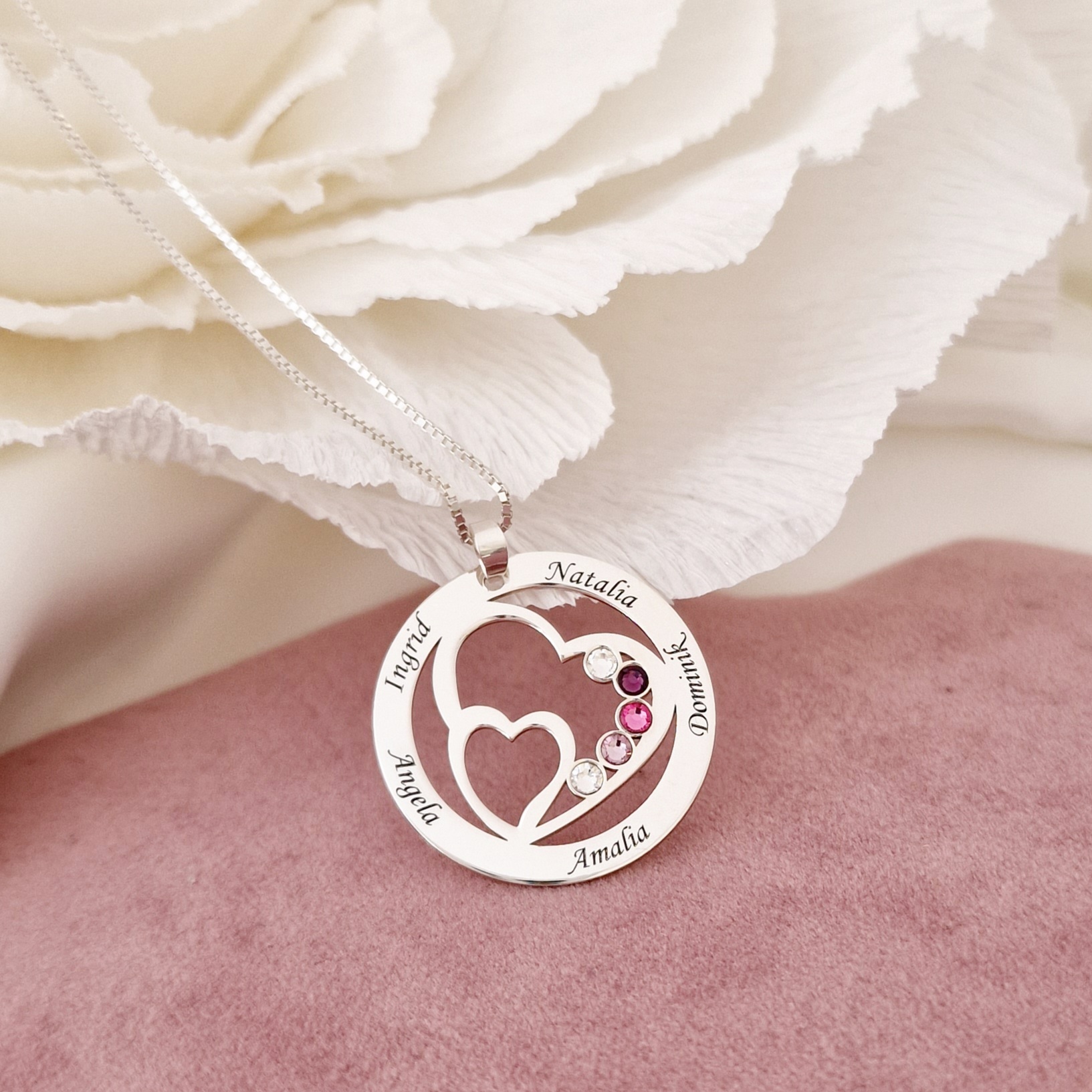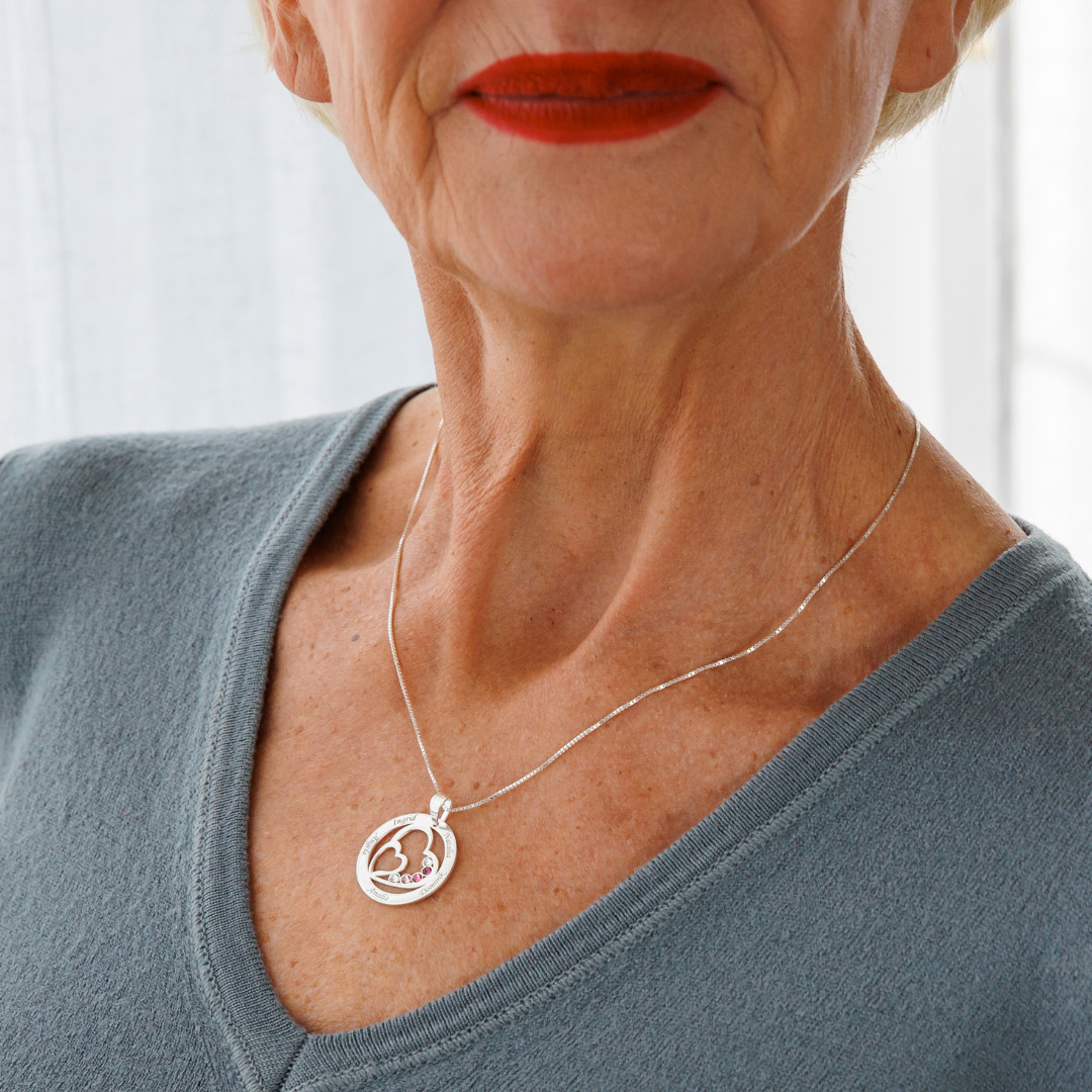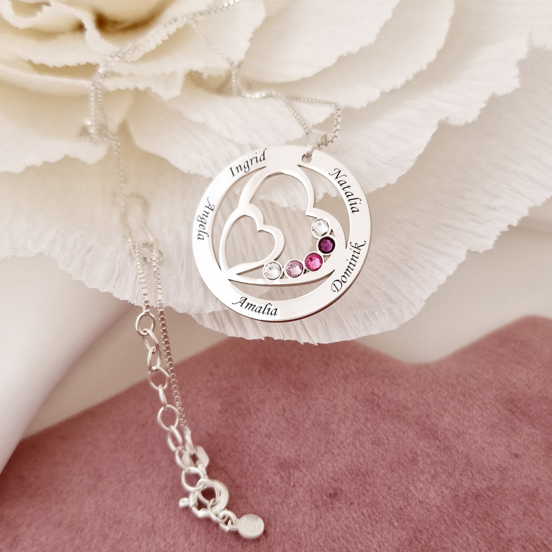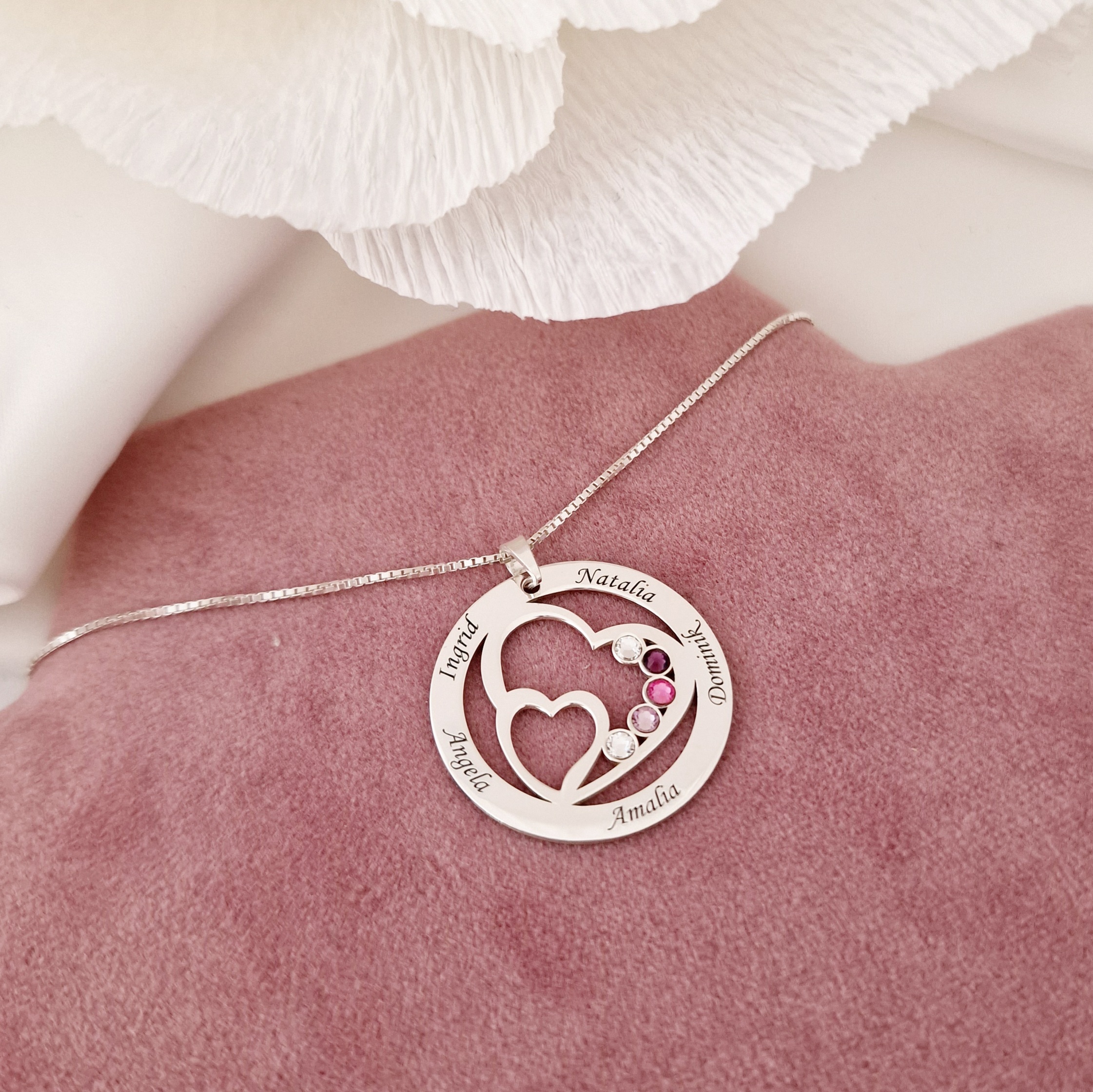 Lantisor Familie unita - Inimi in disc - 5 nume si cristale Swarovski - Argint 925