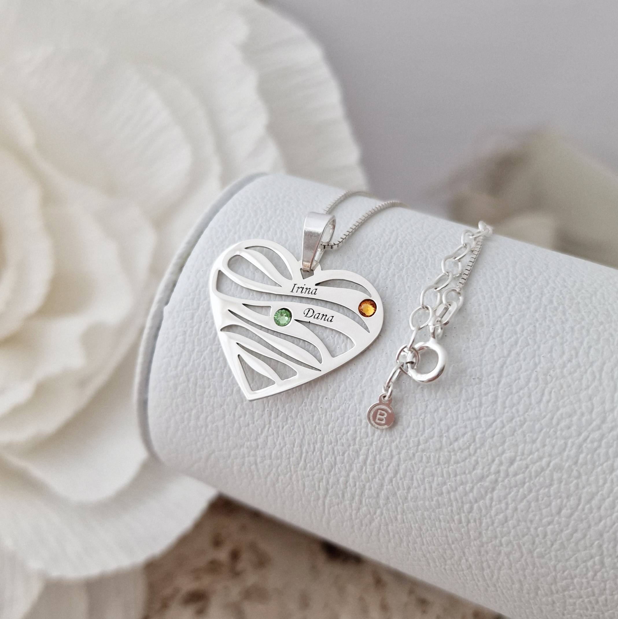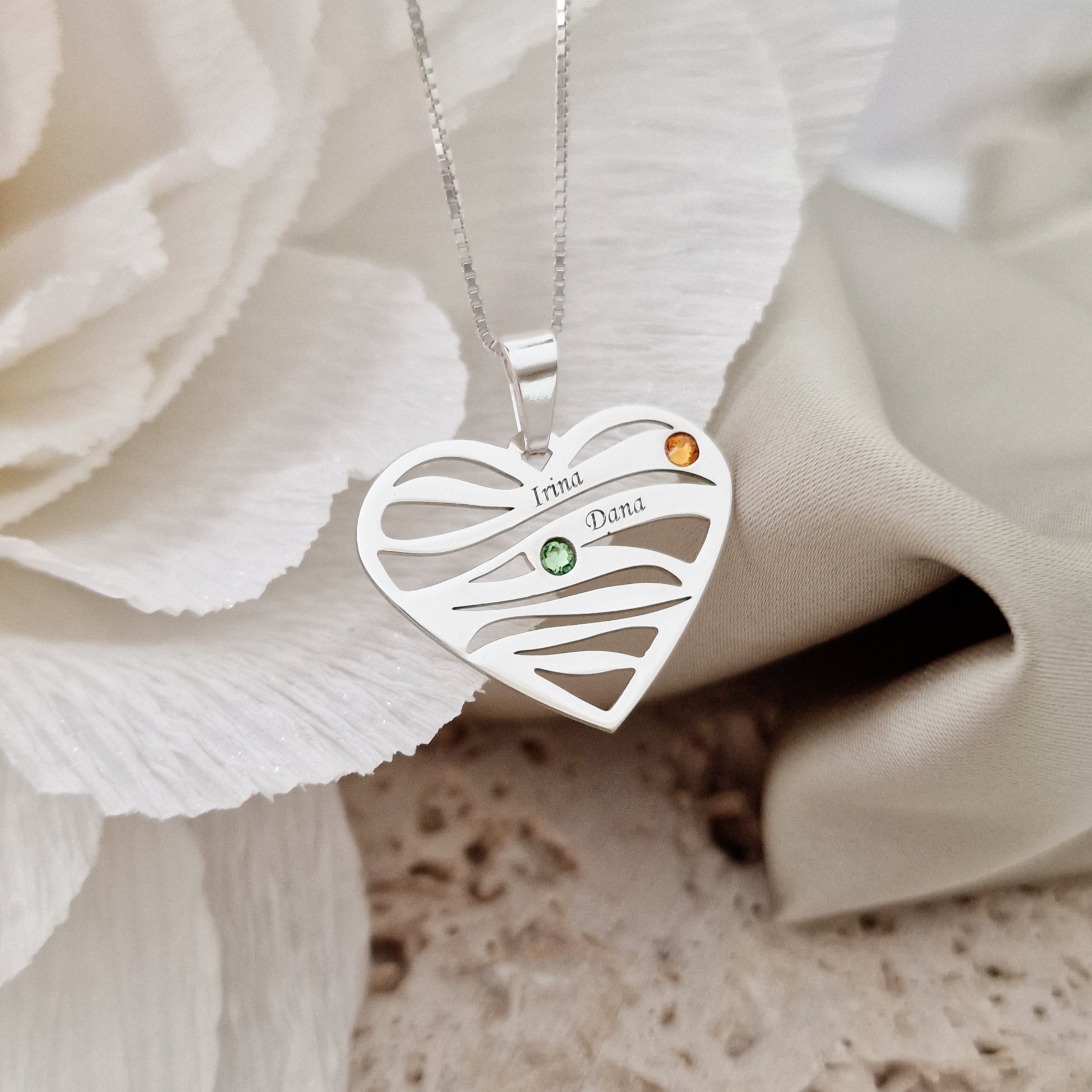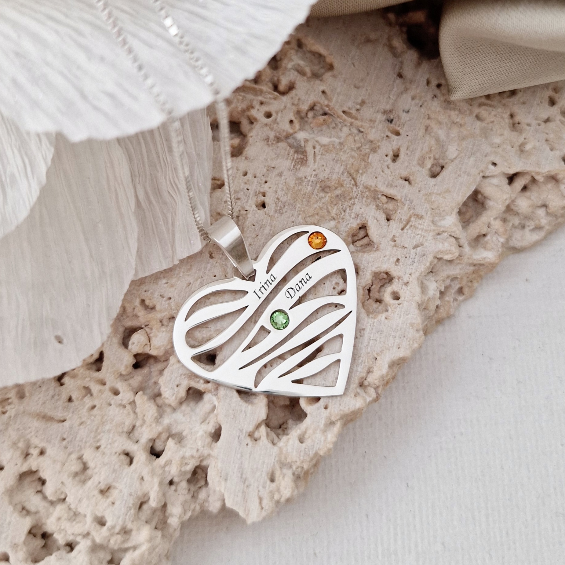 - Pandantivul are dimensiunea de 25x21 mm si poate fi personalizat cu pana la 6 nume.