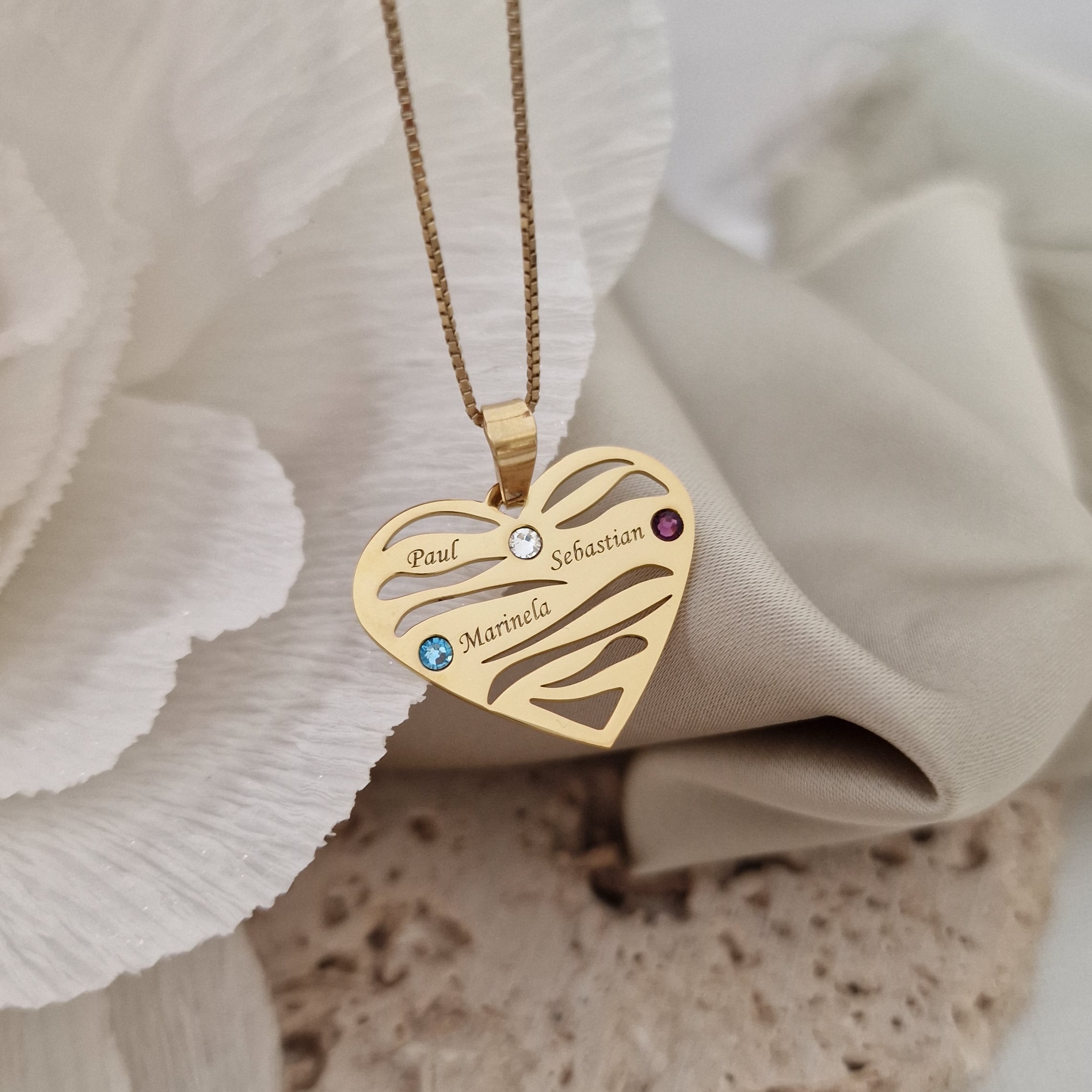 - Pandantivul are dimensiunea de 25x21 mm si poate fi personalizat cu pana la 6 nume.