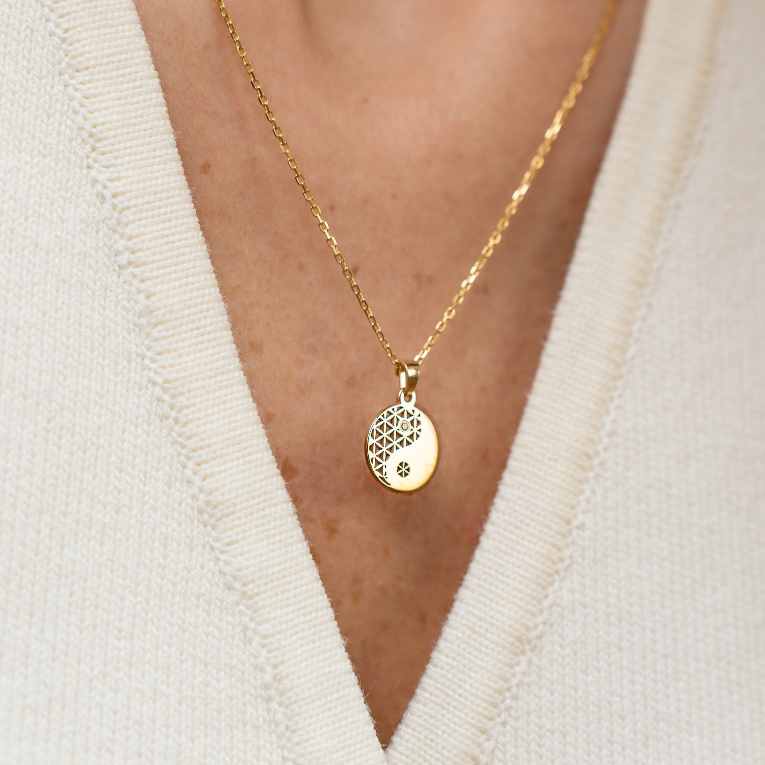 Lantisorul „Fior al Echilibrului” este realizat din Argint 925 placat cu Aur Galben de 18K si are un pandantiv delicat cu simbolul Yin&Yang, decorat cu un diamant natural. Diamantul simbolizeaza puritatea, forta si eternitatea, aducand stralucire si rafinament acestui accesoriu. Designul sau sofisticat imbina armonios eleganta cu semnificatia profunda a echilibrului interior si a energiei pozitive.
