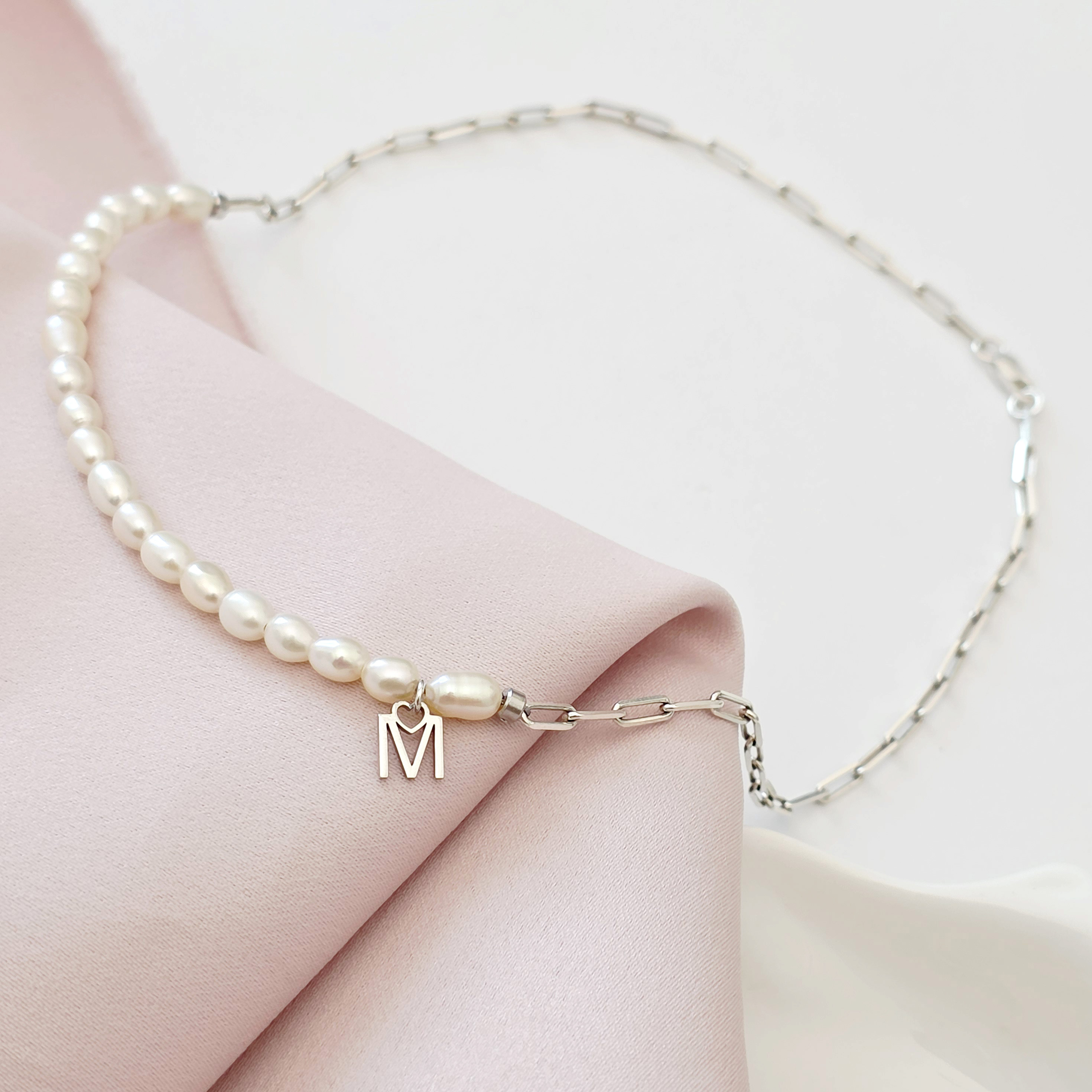 Lantisor Fior al Elegantei - Model cu sirag de Perle, lant zale si pandantiv initiala - Argint 925